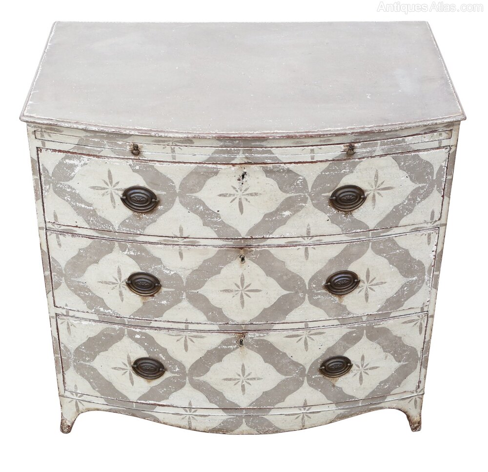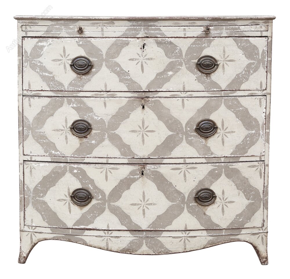 Antique 19th Century Bow Front Painted and Decorated Chest of Drawers / Commode – High QualityFull of authentic charm and character, this 19th Century bow front chest of drawers is a rare decorative find that would complement period, contemporary, or country-inspired interiors. Its later but incredibly authentic distressed paintwork gives a lovely worn finish that enhances its rustic appeal.