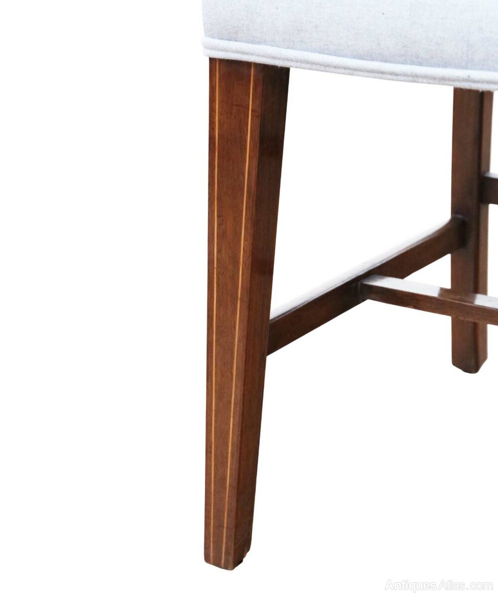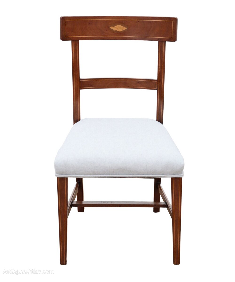 Antique 19th Century Set of 8 Inlaid Mahogany Dining Chairs – Shell MarquetryThis exceptional 19th Century set of eight inlaid mahogany dining chairs exudes charm and character, with attractive age, colour, and patina. A rare decorative find, they would make a wonderful statement piece in any dining space. The chairs feature delicate line inlays and exquisite shell marquetry, complemented by new professional upholstery for comfort and style.