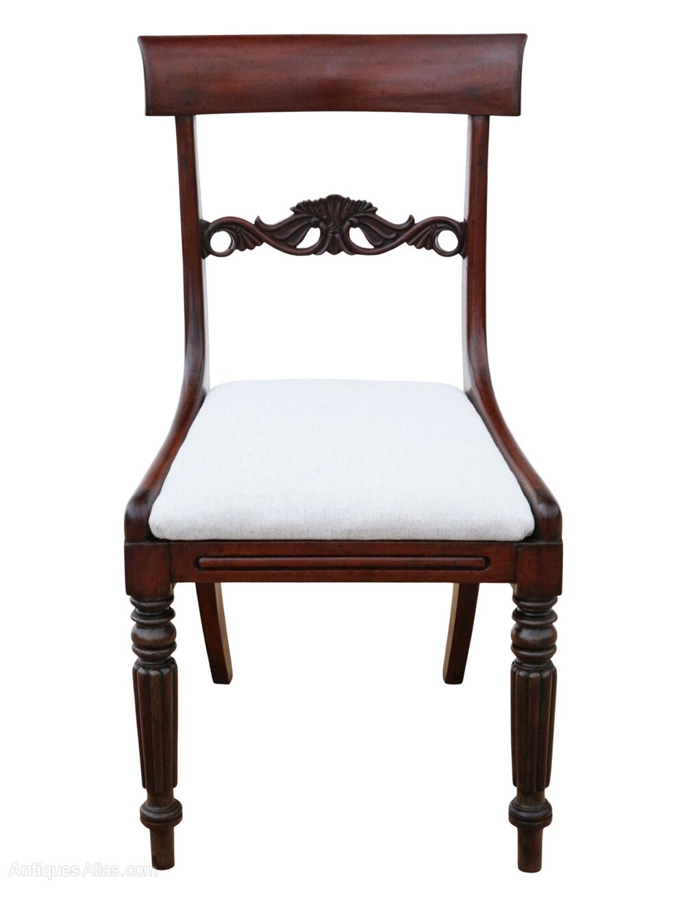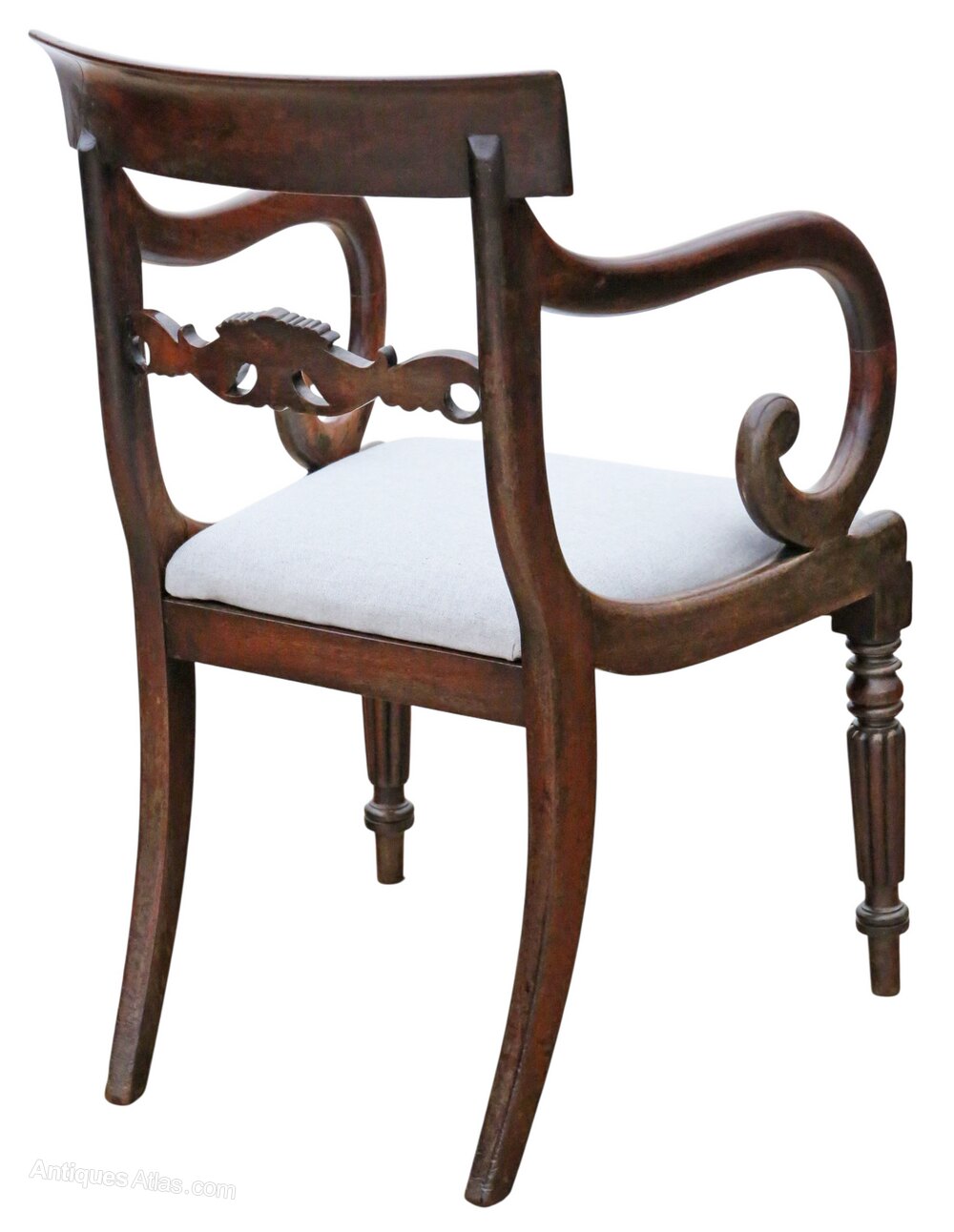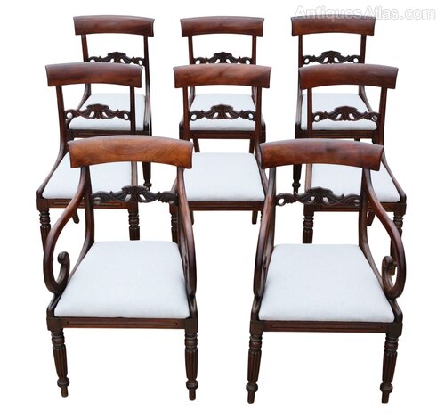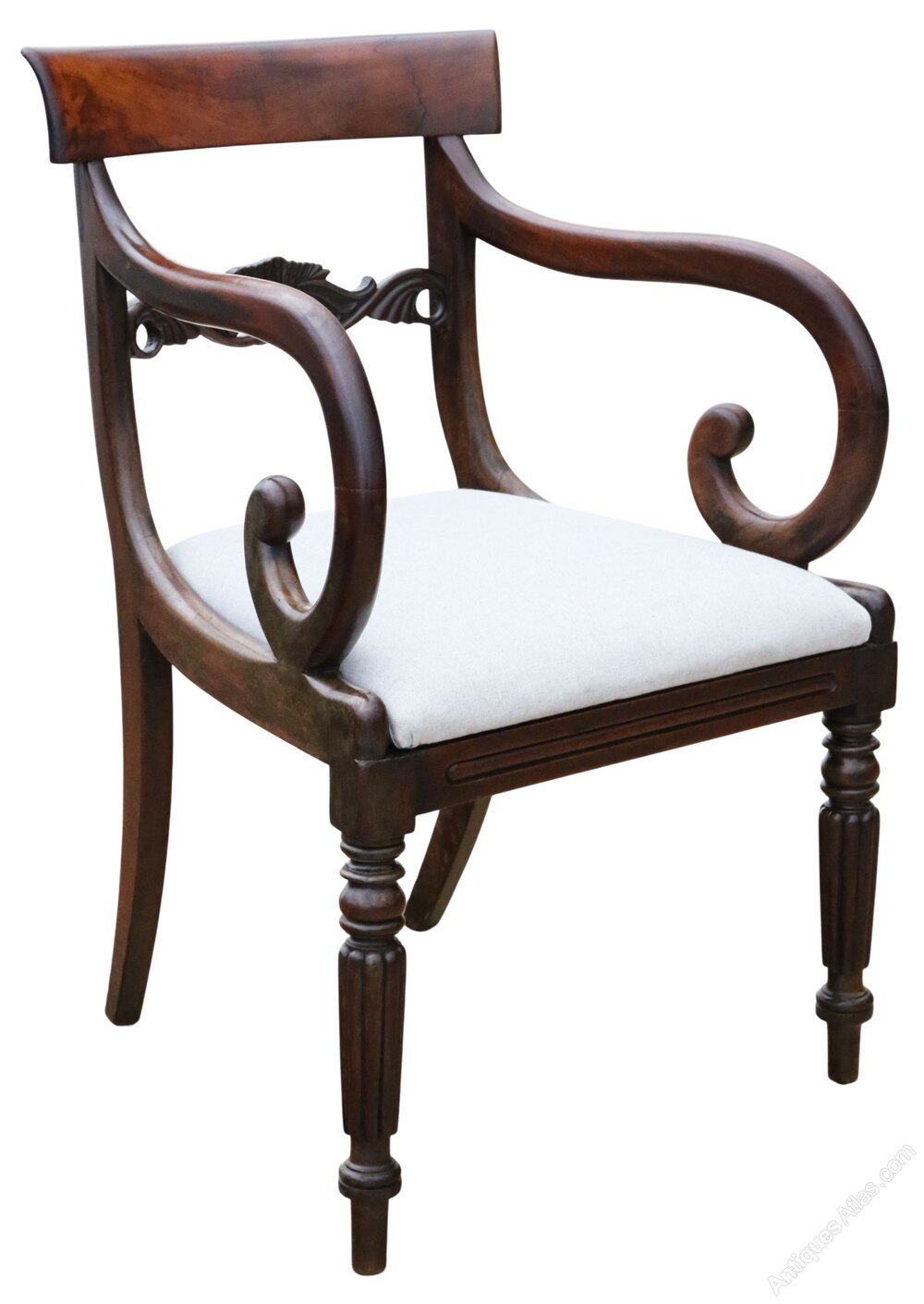 Antique 19th Century Regency Mahogany Dining Chairs – Set of 8 (6+2)This fine quality set of eight Regency mahogany dining chairs, dating to circa 1830, displays attractive age, colour, and patina. Full of charm and character, this rare decorative find would make a wonderful statement piece in any dining setting. The set features new professional upholstery and a highly sought-after style, with elegant scroll arms and melon fluted legs that showcase refined Regency design.