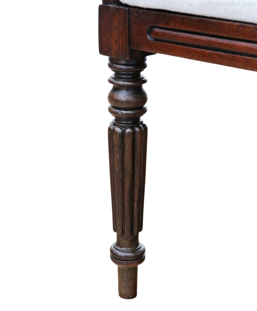 In very good antique condition overall, showing expected signs of age, including historic marks, knocks, cracks, repairs, and minor alterations consistent with period furniture. Some historic extinct woodworm holes in the mahogany underseat rails have been treated for good measure.