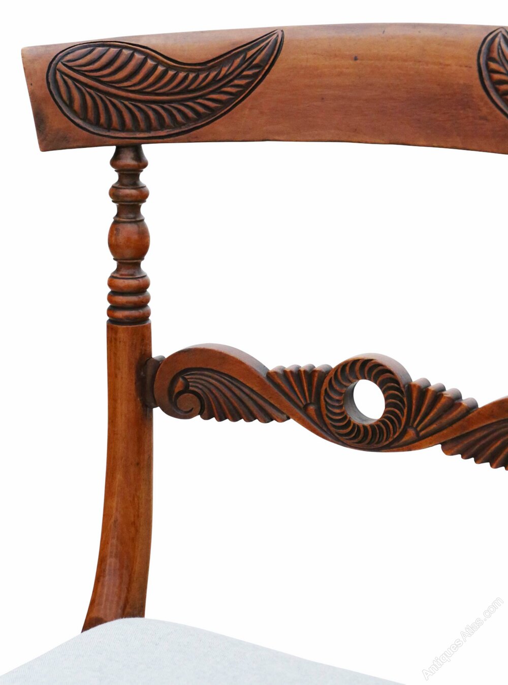 Featuring new professional upholstery, these chairs exhibit a lovely warm, mellow tone with delicate carved detailing to the backs.