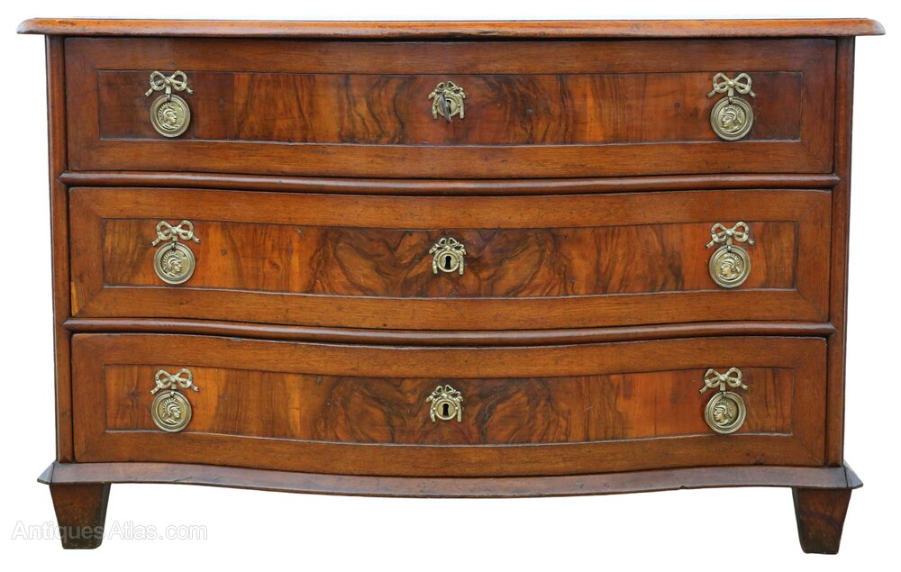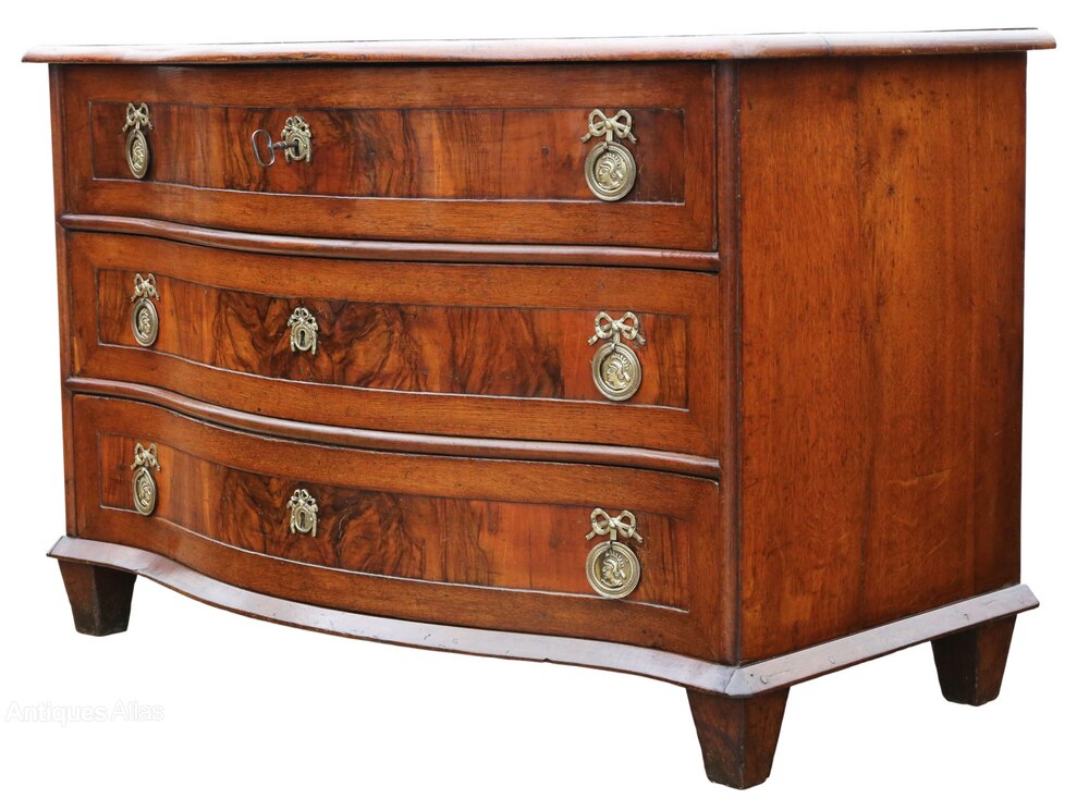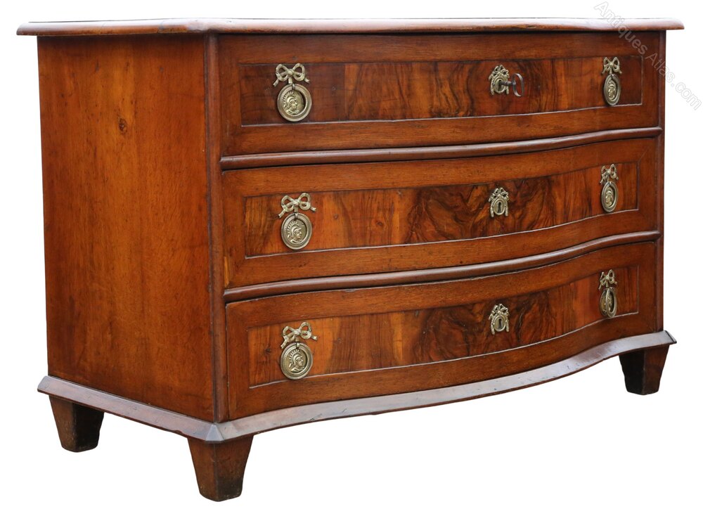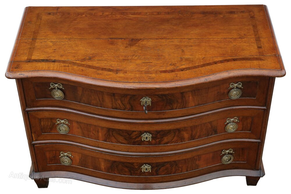 Antique Large 18th Century Continental Oak and Walnut Serpentine Crossbanded Commode / Chest of Drawers – Fine QualityThis exceptional large 18th-century continental commode is crafted from oak and walnut, displaying attractive age, colour, and patina. Full of charm and character, this rare and highly decorative early piece would make a showstopper in the right setting. The very old wallpaper drawer linings add further authenticity and visual interest that enhances the historical appeal of this fantastically rare chest of drawers.