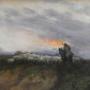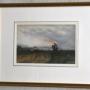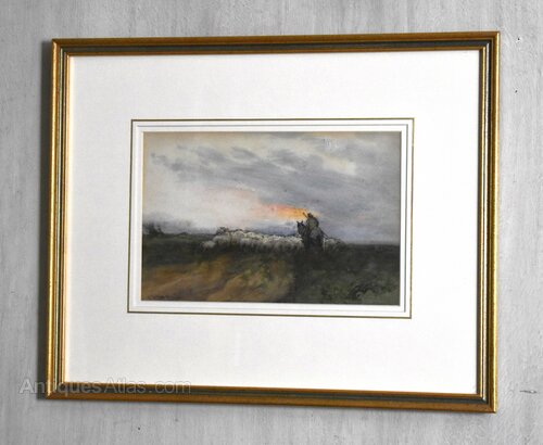 A fine watercolour by the artist William Tatton Winter RBA, 1855-1928, titled ‘Returning to the fold’. The work is typical of the artist with a wonderful control of the medium and a depiction that evokes perfectly the wild and windy landscape of winter. The painting is in excellent condition with the colours bright and true. The work is signed to the lower left. William Tatton Winter, RBA (1855-1928) was a watercolour and landscape artist, and member of the Royal Society of British Artists. He grew up in poverty and left school at an early age to work, however he managed to study at evening classes and at the Manchester Academy of Arts. His employers supported him, and Ford Madox Brown (while working for Manchester Town Hall) gave him advice. His acquaintance Mr Alfred Taylor assisted him to meet John Ruskin and Holman Hunt, and to study in Belgium, Holland, France and Spain, and then to study under Verlat in Antwerp. His first exhibition for the RBA was in 1886, and Queen Victoria bought some of his works. He exhibited in various international venues. He was a member of the British Society of Artists in Watercolours, and he became a member of the London Sketch Club in 1902. Around 1924 he painted a miniature watercolour picture of the windmill on Reigate Heath for the King's Library in the Queen's Dolls House. He was hugely successful and exhibited at every major gallery including 32 works at the Royal Academy and a staggering 294 works at the RBA. His style was heavily influenced by his time on the continent, with a use of bold washes and scratching out giving his work a unique ethereal feel. This piece is a fine example of his work in a modern mount and frame. The reverse of the work gives the title and it is likely to have been exhibited at the RBA exhibition in 1890.Overall sizes in inches including frame: 19 ¼ by 15 ¾