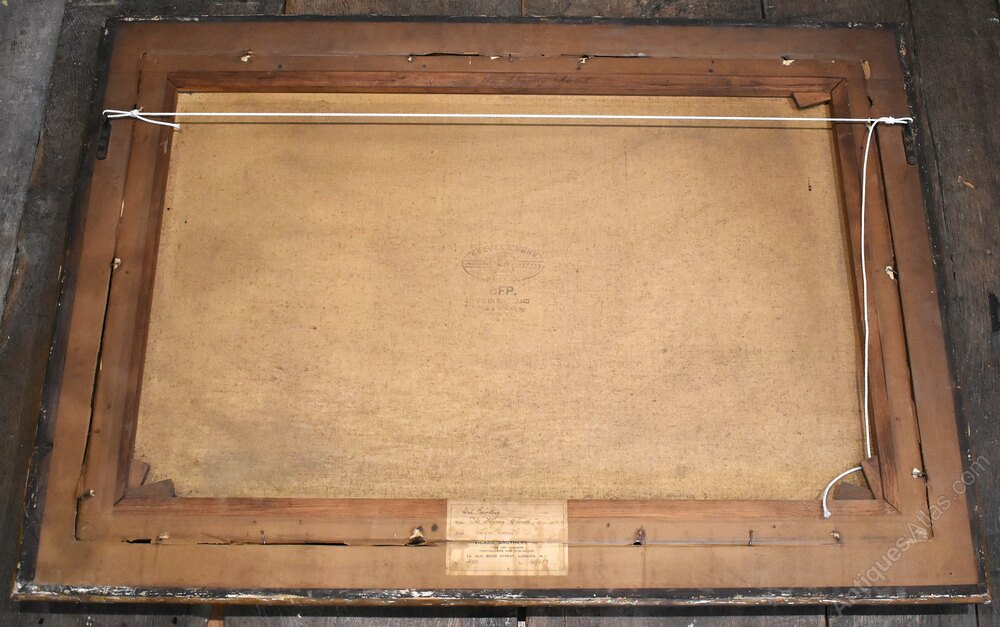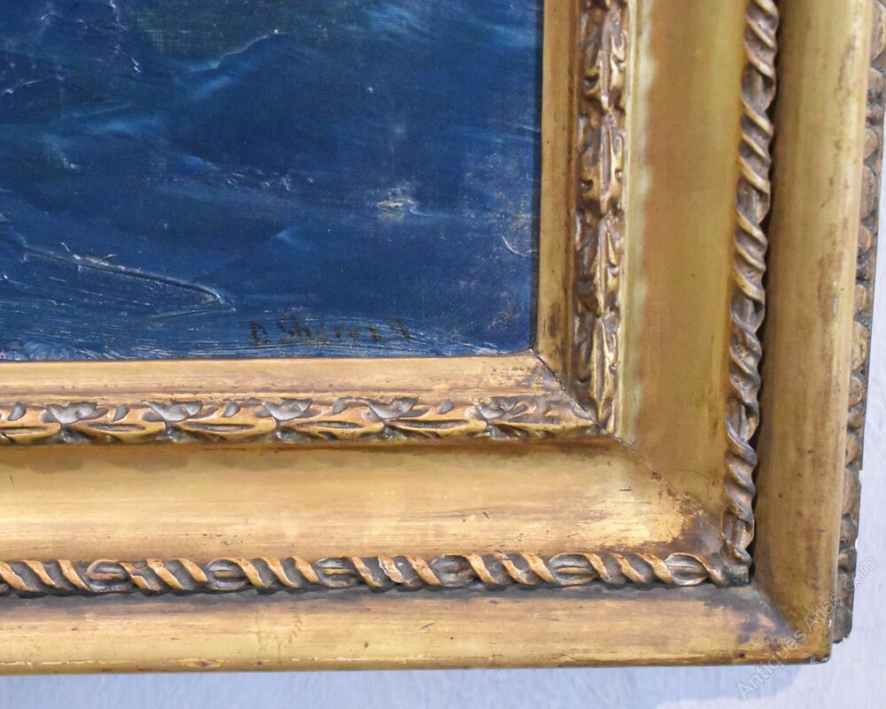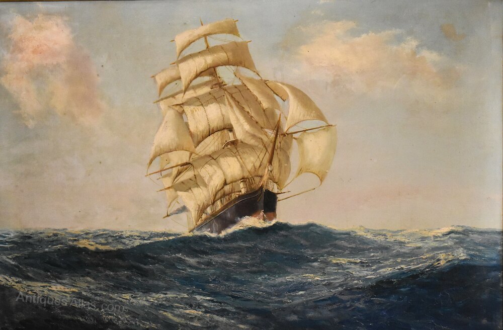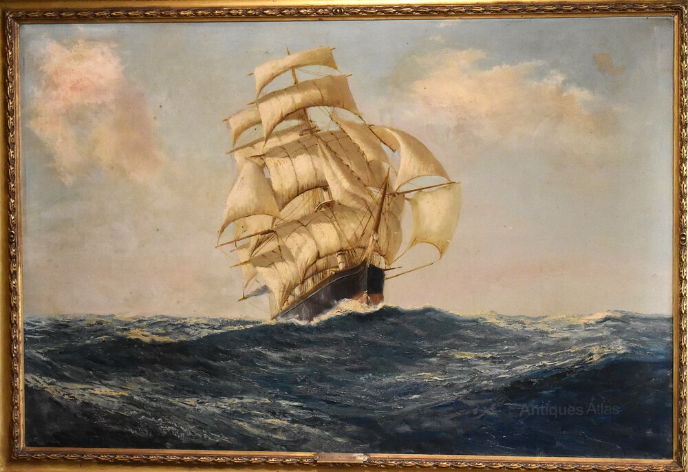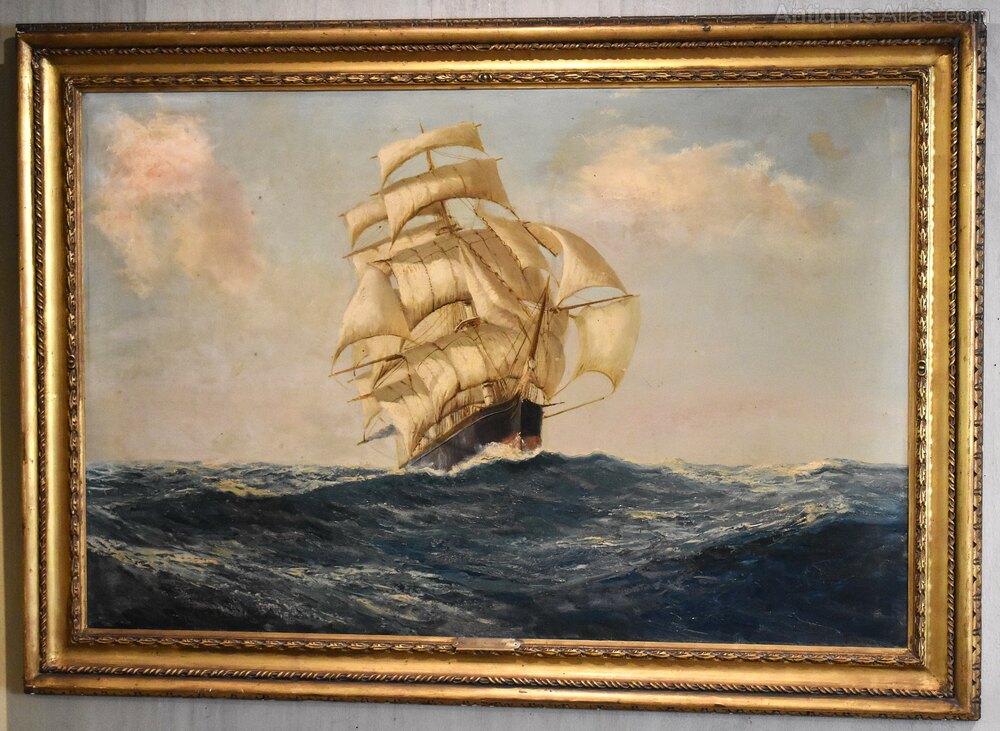 A fine oil on canvas by the artist Daniel Sherrin (1868-1940) depicting the ship Flying Cloud at sea. The work dramatically depicts the ship sailing directly towards the viewer under full sail. The Flying Cloud was a clipper ship that set the world's sailing record for the fastest passage between New York and San Francisco, 89 days 8 hours. The ship held this record for over 135 years, from 1854 to 1989. The painting is in good untouched condition, there are a few minor marks, touching in and some varnish discolouration. The painting is signed to the bottom right, has a title mount to the frame, and a full label and description from the Vicars Brothers gallery of London, the original retailers of the work. Daniel Sherrin 1868-1940 was a painter best known for his depictions of landscapes, maritime scenes, and the countryside of Norfolk and Suffolk. His work is highly detailed, describing objects such as ships and cattle accurately while maintaining a sense of light and atmosphere. Born in 1868 in Brentwood, England, Sherrin first studied painting and drawing with his father, the artist John Sherrin. The younger Sherrin went on to notably produce a commissioned work for King George V, painting his country estate Sandringham House—a work that still hangs in Buckingham Palace to this day. During the First World War, the artist helped design recruitment posters, and his efforts are now housed in the archives of the Imperial War museum. Sherrin’s work can be found in mostly British museum collections, including the Bury Art Museum and the Williamson Art Gallery & Museum in Claughton. He died in 1940 in England. Sherrin was a very commercial artist and doesn’t seem to have exhibited widely, his works were heavily influenced by popular artists of the day with his landscapes inspired by Leader and his maritime works by early Montague Dawson. This work is very much in the style of Dawson with the sense of drama and movement. The painting is framed in the original fine quality gilt frame which is in very good untouched condition, just some wear to the title plaque. The whole has a great decorative impact and is ready to hang. C.1930.Overall sizes in inches including frame: 41 ¼ by 29 ¼