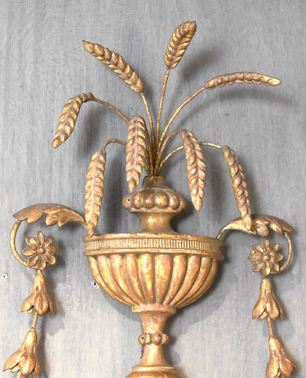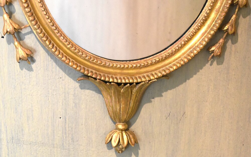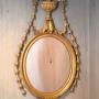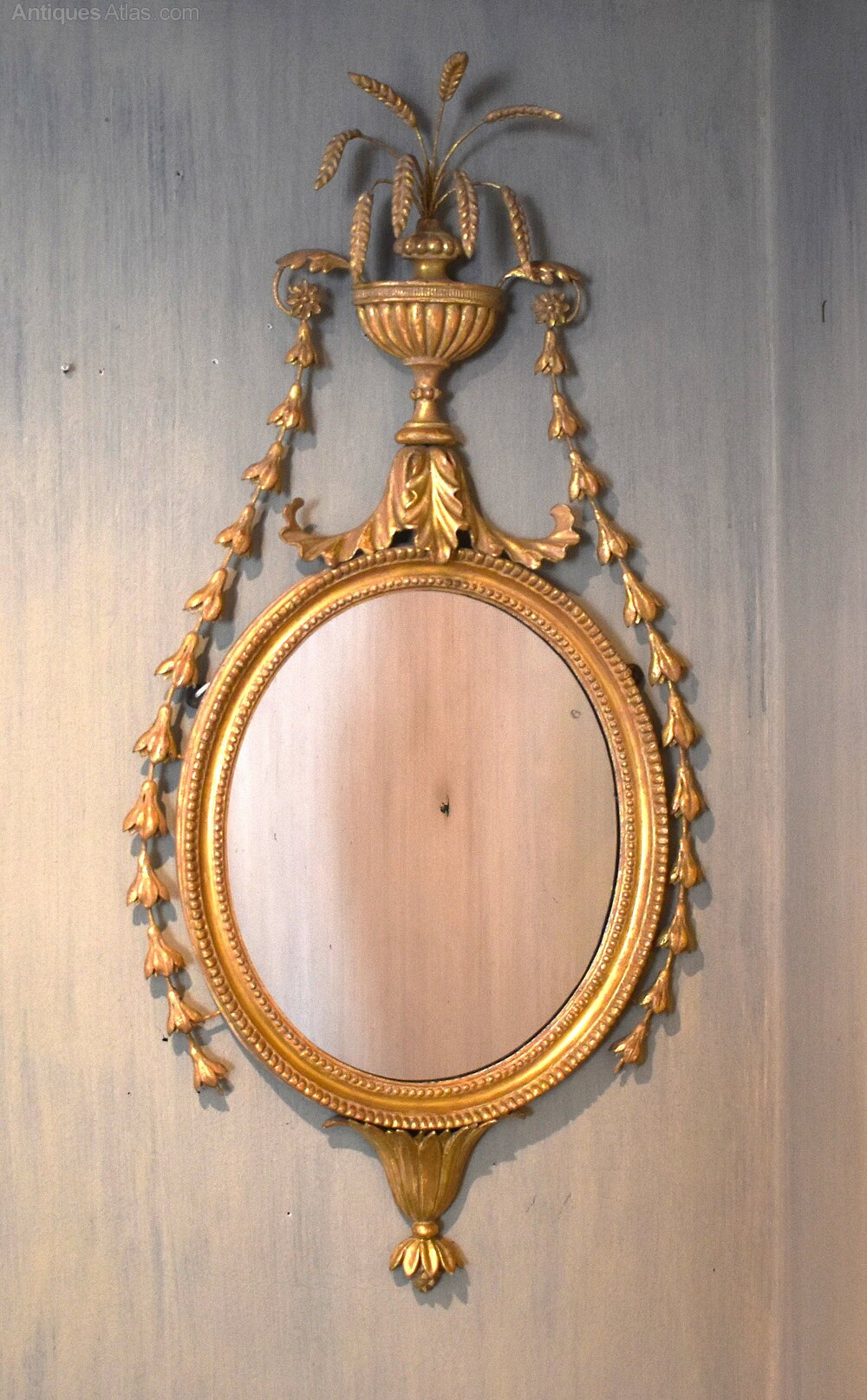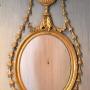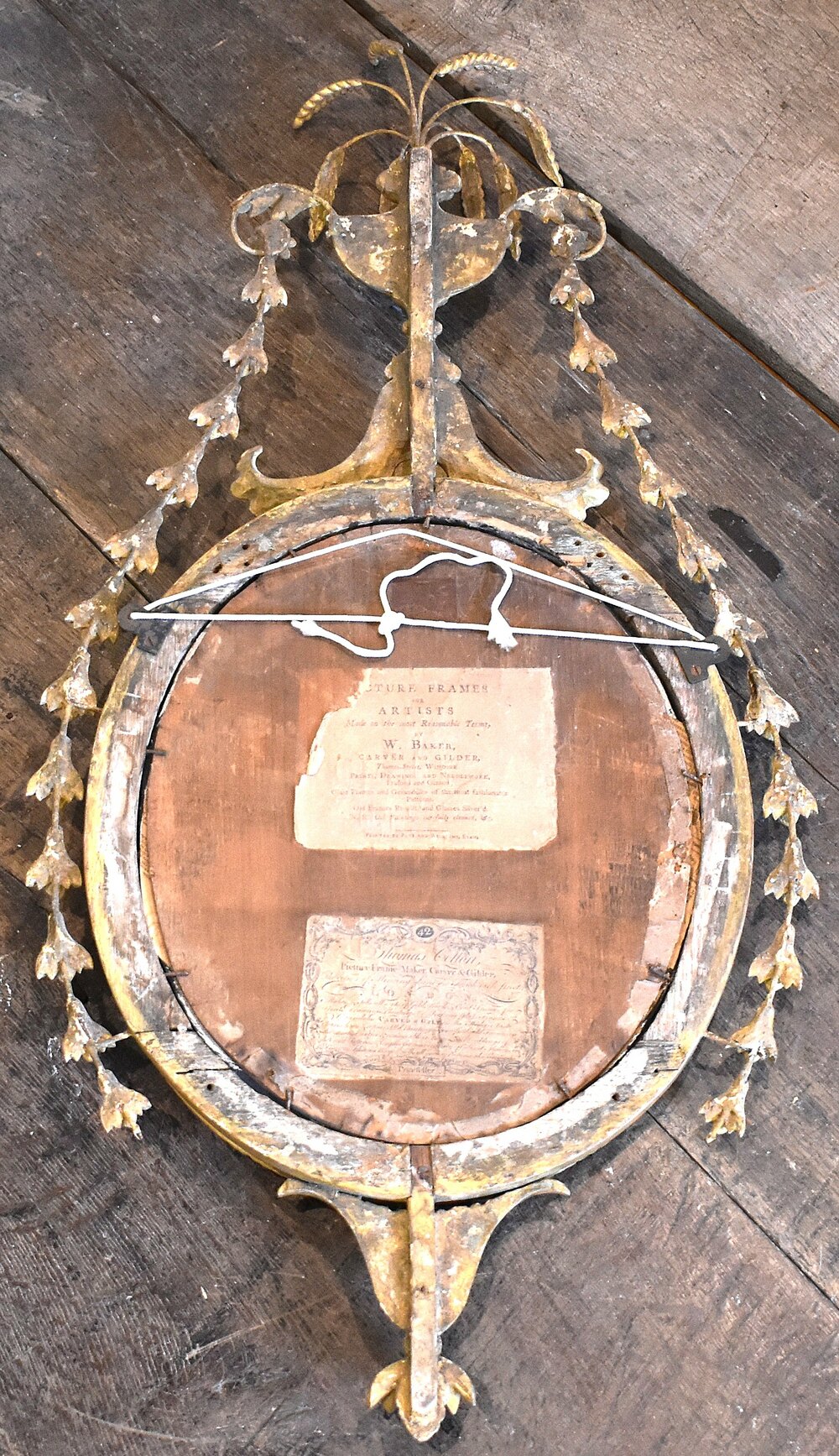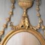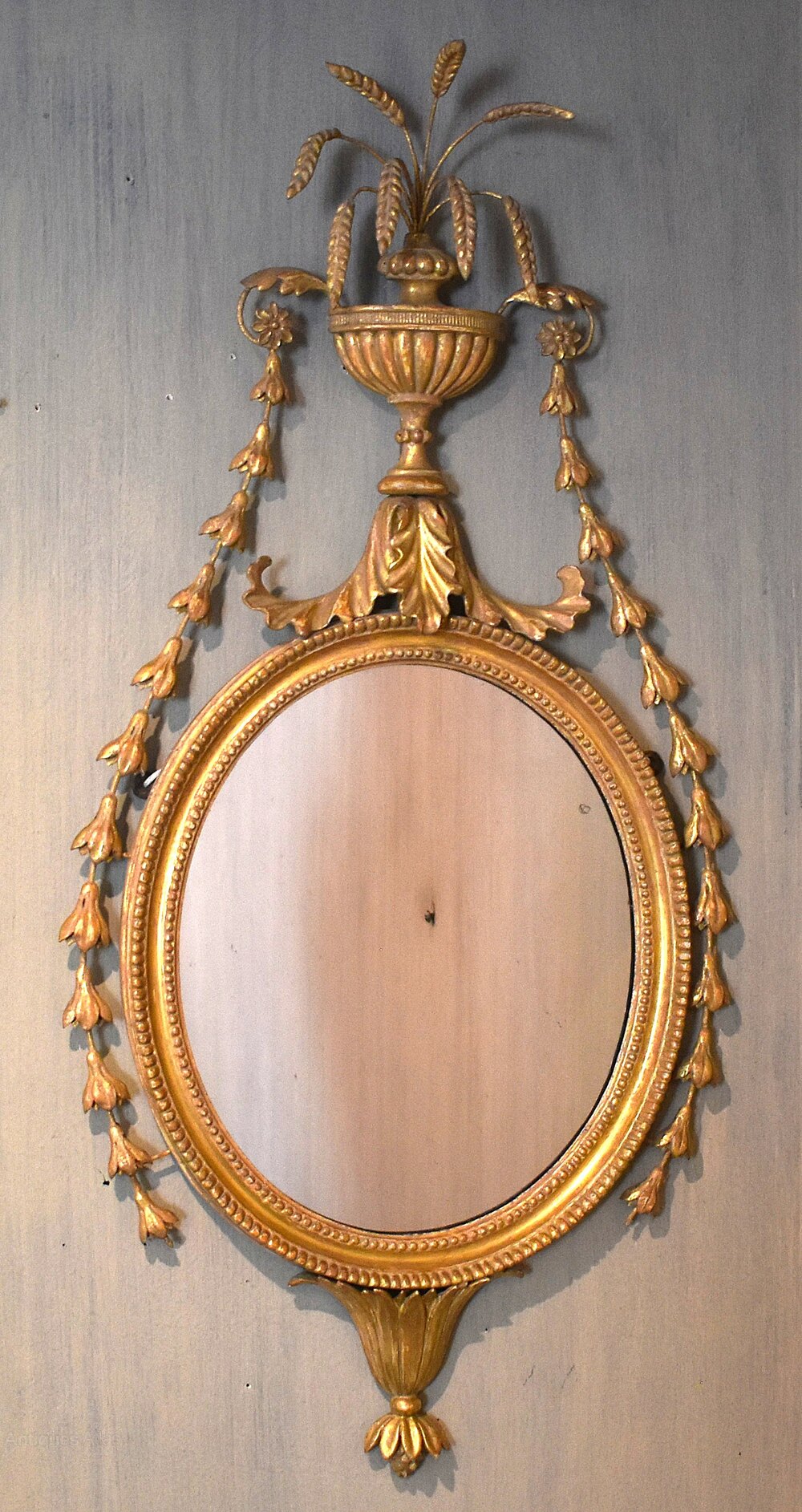 A fine example of a Georgian giltwood mirror of small size and in the Neoclassical Adam manner. The mirror is typical of the designs of Adam with a light use of swags, acanthus leaves and a classical urn sprouting ears of wheat, all carved and gilded with wire supports to the extremities. The mirror is in excellent condition, it was purchased from Charles Lumb & Sons Ltd, Harrogate in the 1960’s and it is likely it had had minor restoration then and was regilded all to the highest level. The mirror retains two makers labels on the reverse, the oldest is for Thomas Carver & Gilder the Corner of Mincing Lane in Fenchurch St London who worked at the end of the eighteenth century and would have originally made the piece. The other label is for W Baker Carver and Gilder of Thames-Street, Windsor. It is most likely that this craftsman either made repairs or added additions to the original design. The whole is a wonderful example of the type that is ready to hang. C.1790.Overall sizes in inches: 30 by 14 ½