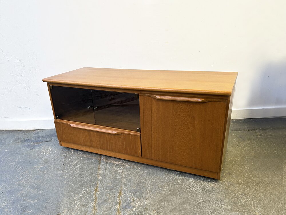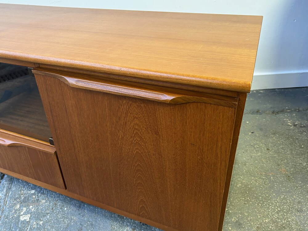 A compact Mid-Century teak media cabinet / TV stand produced by Scottish Mid-Century manufacturer ‘Sakol’. Featuring a compartment to the left with smoked glass sliding doors and a full-height cupboard door to the right for concealed storage. Below is a wide drawer providing additional space.The cabinet is finished in warm teak with well-defined grain and features discreet brass handles and hinges. It sits on a plinth base supported by castors, making the unit easy to move around. A versatile piece, ideal for use as a TV stand, hi-fi cabinet or general storage unit.