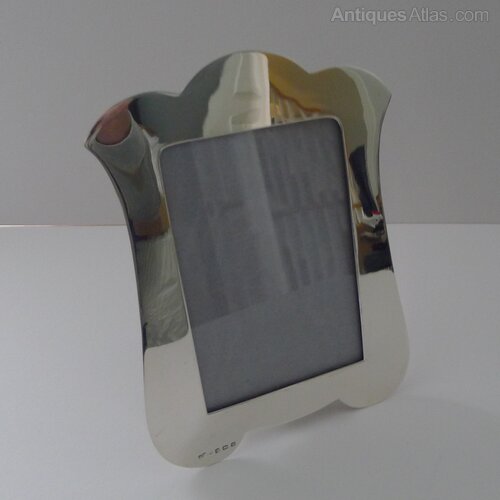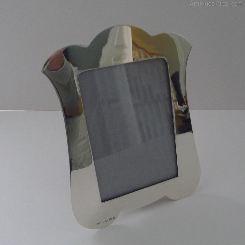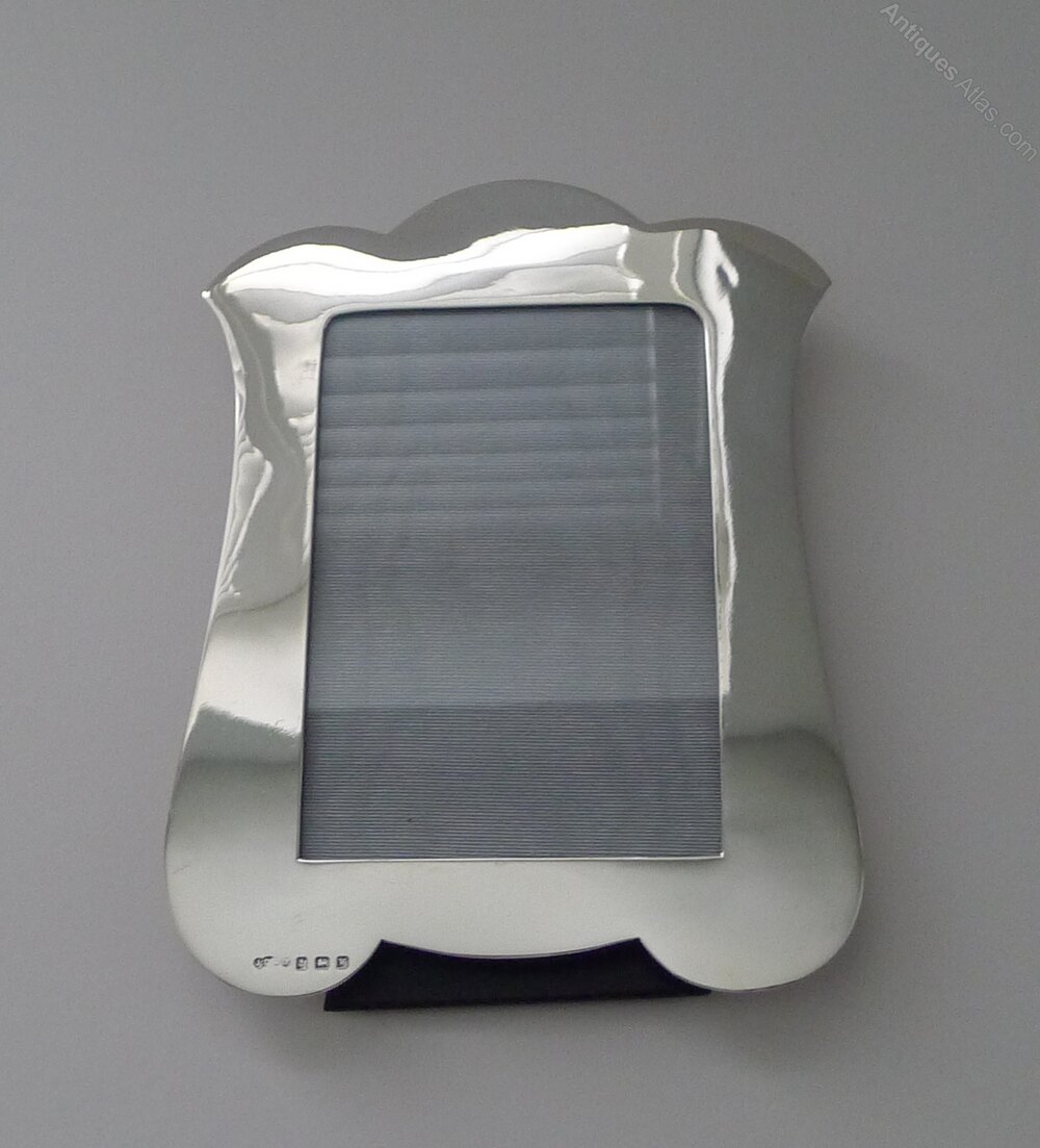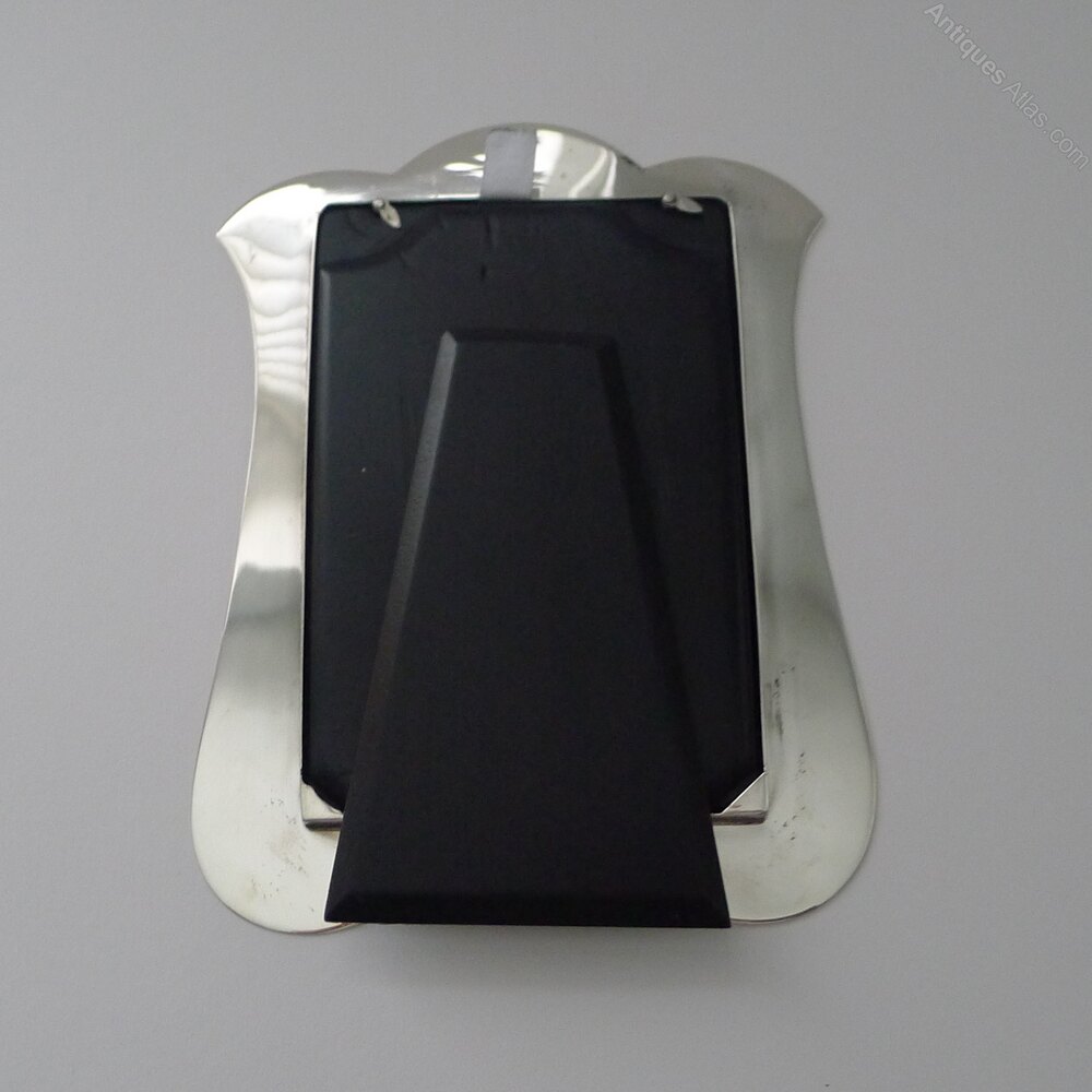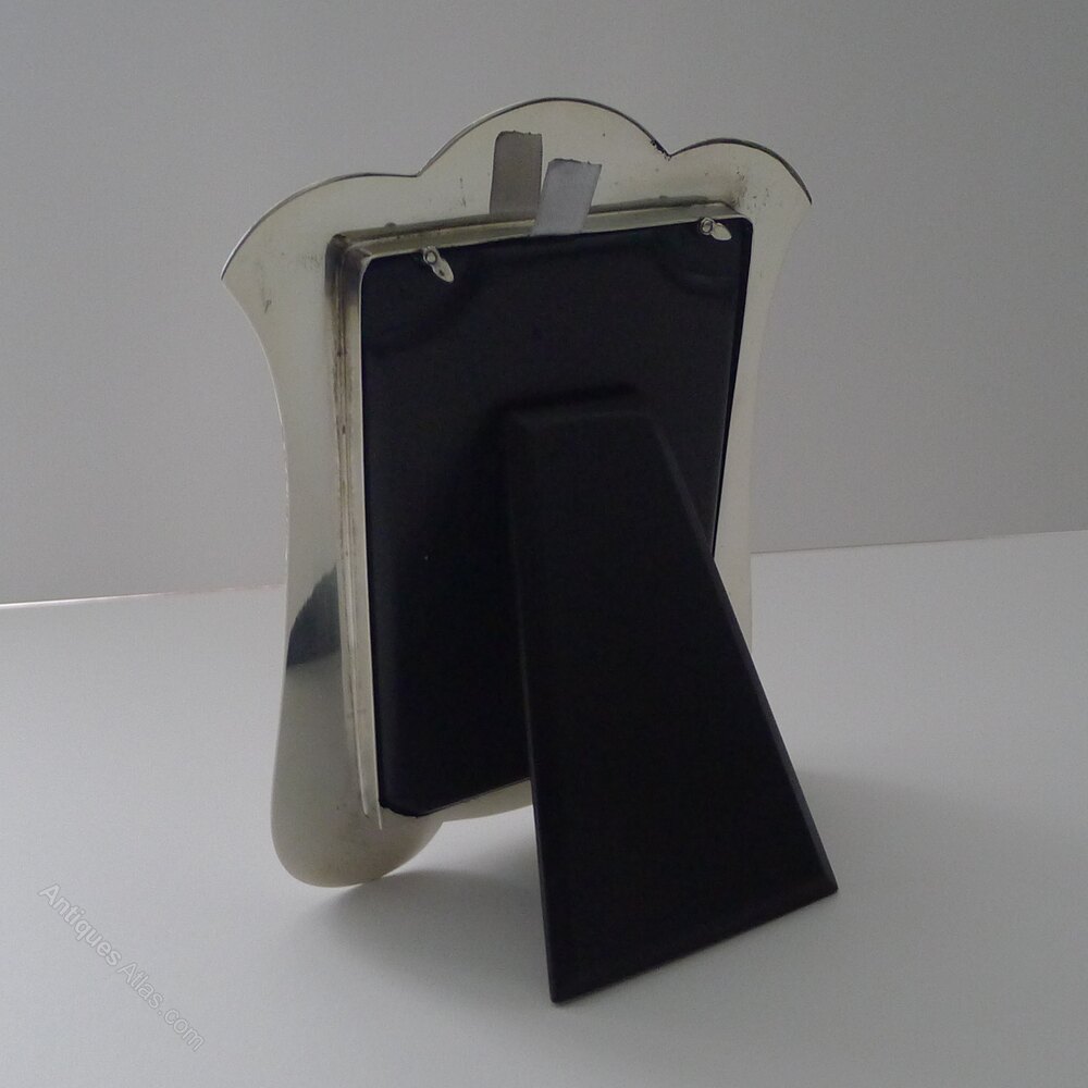 A very smart and elegant picture frame made from solid English silver with a nod to the Art Nouveau era, with it's organic shape almost reminiscent of a Tulip flower.The back is made from solid ebonised wood with a folding easel stand. The silver is fully hallmarked for Birmingham 1921 together with the makers mark for Joseph Gloster Ltd.