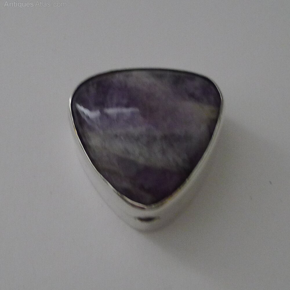 The lid is inset with a polished, domed amethyst stone with a stunning lilac / purple colour.