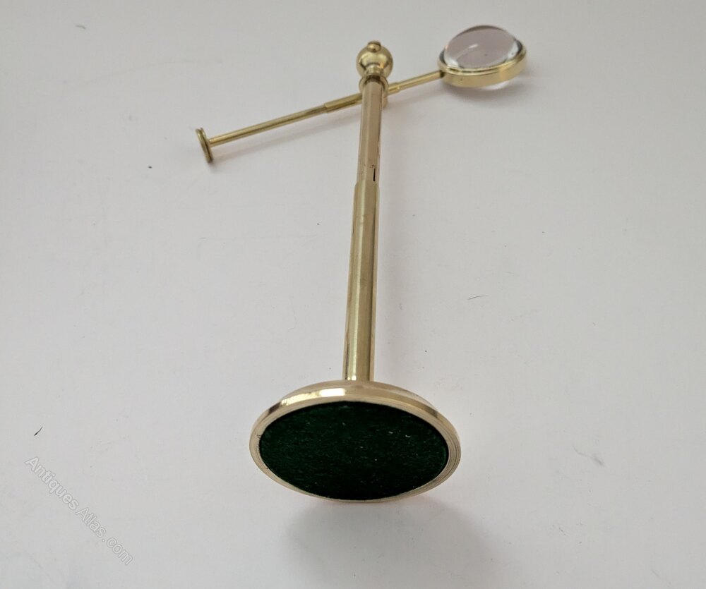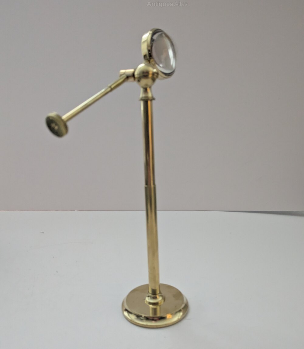 A handsome antique English magnifying glass / bullseye lens on stand which pivots on a ball and socket fitting, moving around with ease.Dating to c.1915, it remains in excellent condition having been professionally cleaned and polished, restoring it to it's former glory.