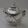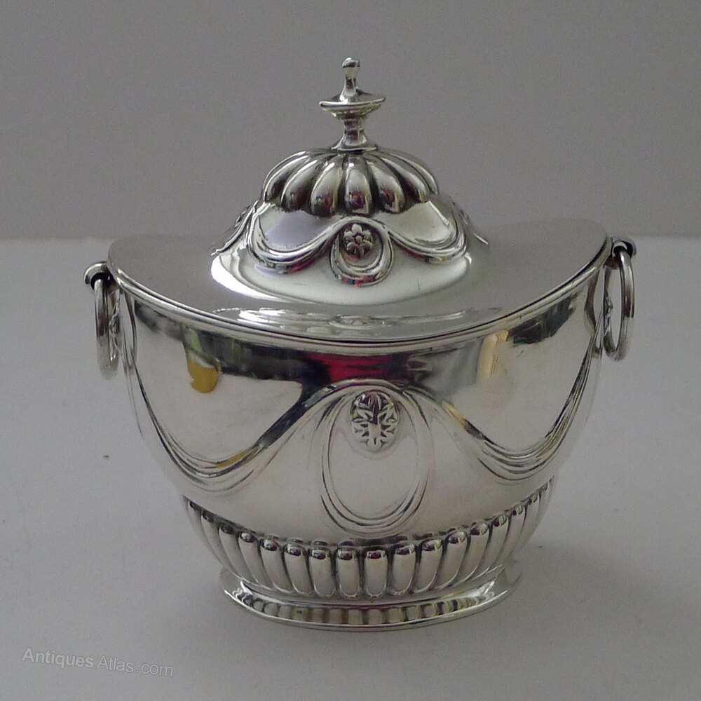 A wonderful Edwardian English sterling silver tea caddy with a hinged lid and ring handles to each side. The body is beautifully decorated with garlands and a simple floral motif.The lid fits well and the hinge in full working order once opened, a lavishly gilded interior is revealed.