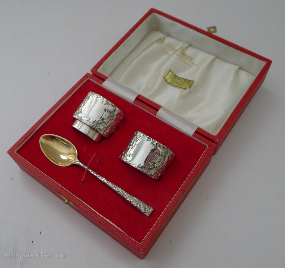 A superb cased child's set with a highly sought-after modern design from the early 1970's, each piece fully hallmarked for Sheffield 1971/1972, 55 years old and as fashionable today as in the 1970's an heirloom gift for the little one in your family.The set comprises an egg cup, a napkin ring and a spoon with gilded bowl. All pieces are a good heavy weight cast in a good gauge of solid silver with a combined weight of 129 Grams / 4.15 Troy Ounces.