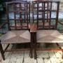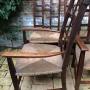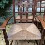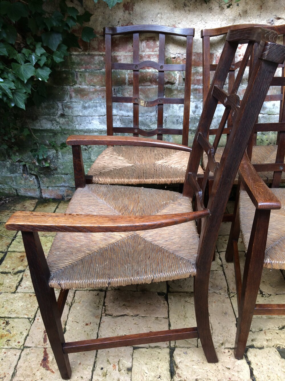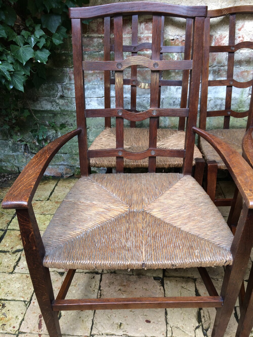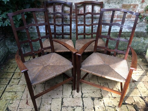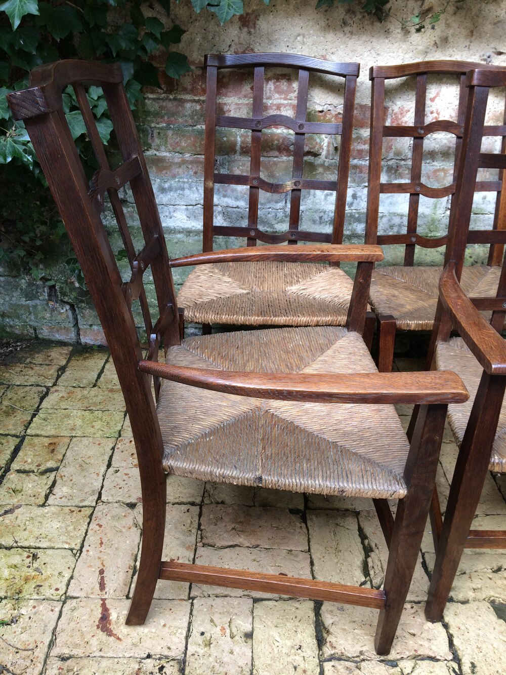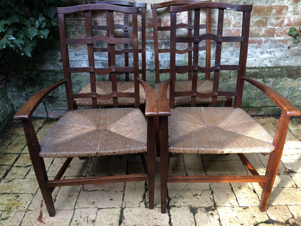 A set of four Cotswold school lattice back oak chairs. The rush seats are in good order however one dining chair needs re-gluing, the other three are solid. Please feel free to get in touch with any enquiries or more detailed images.Dimensions