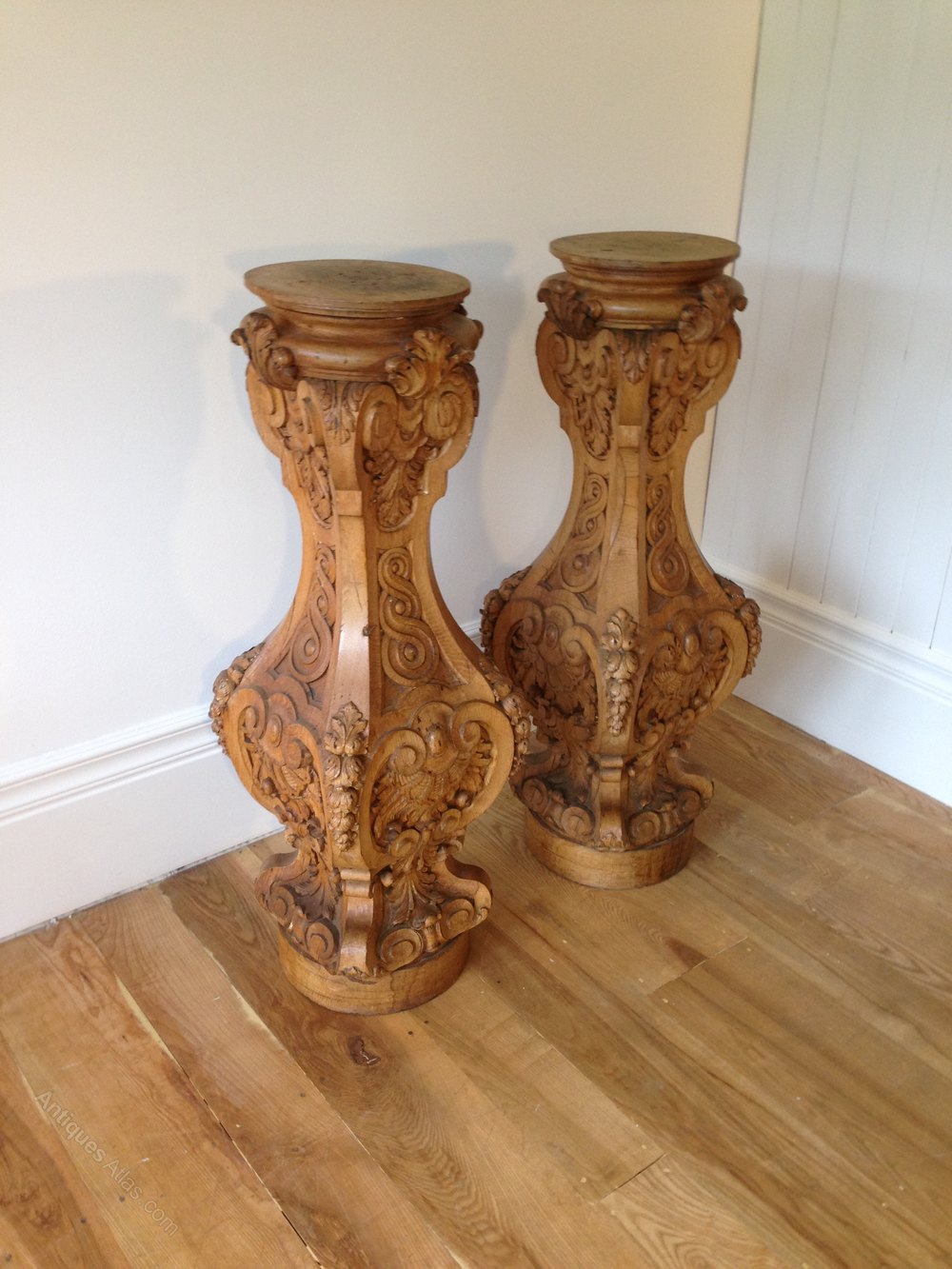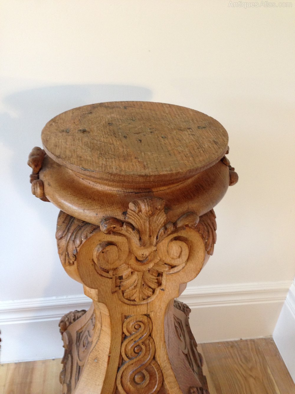 Pair Of Blond Oak Carved Pedestals