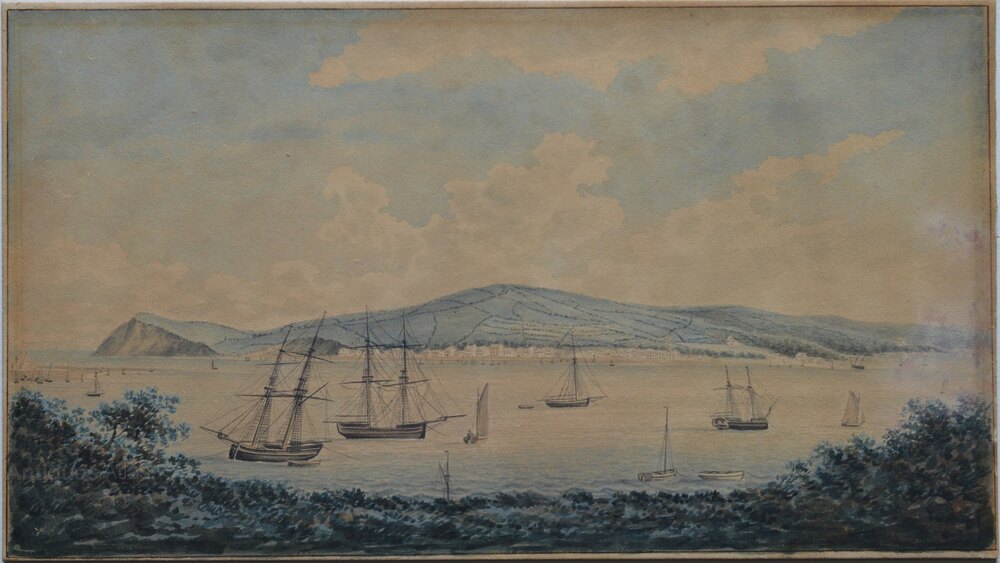 1. Boats on the Estuary of the River Teign. A view from Teignmouth looking towards Shaldon and The Ness Cliff, c.1800. Pen and ink and watercolour on paper laid on board. 20.9 x 37.2 cm.