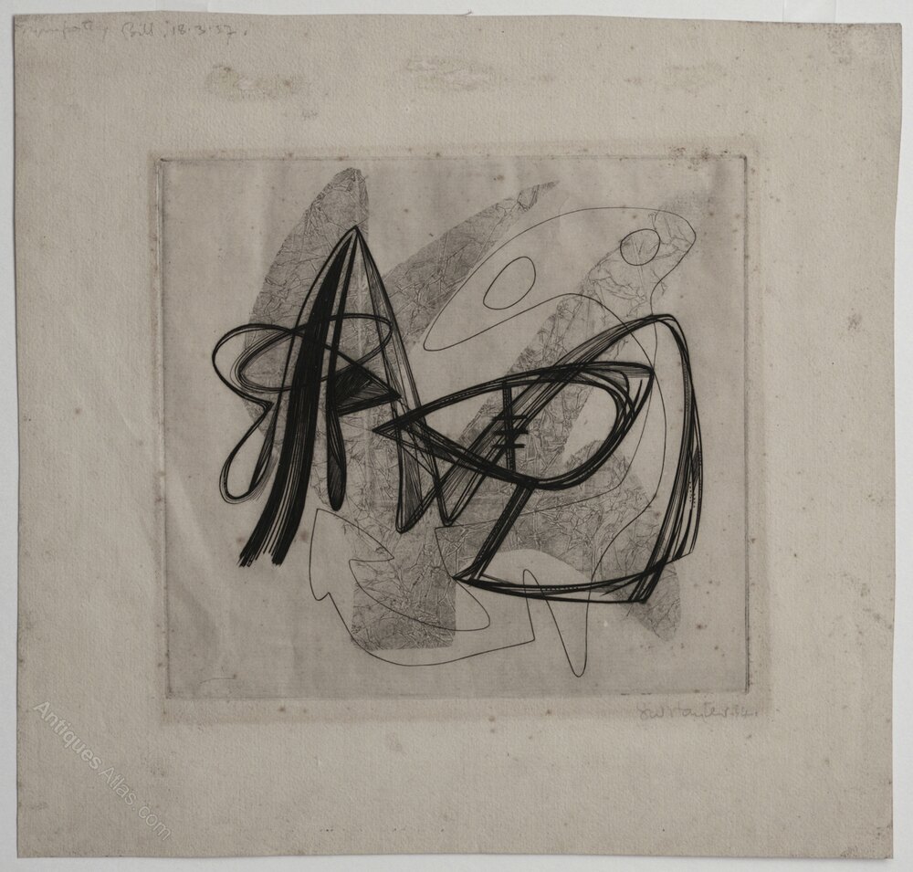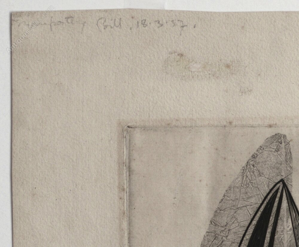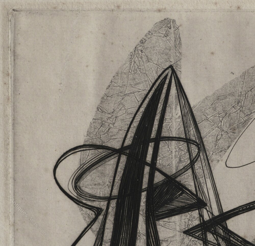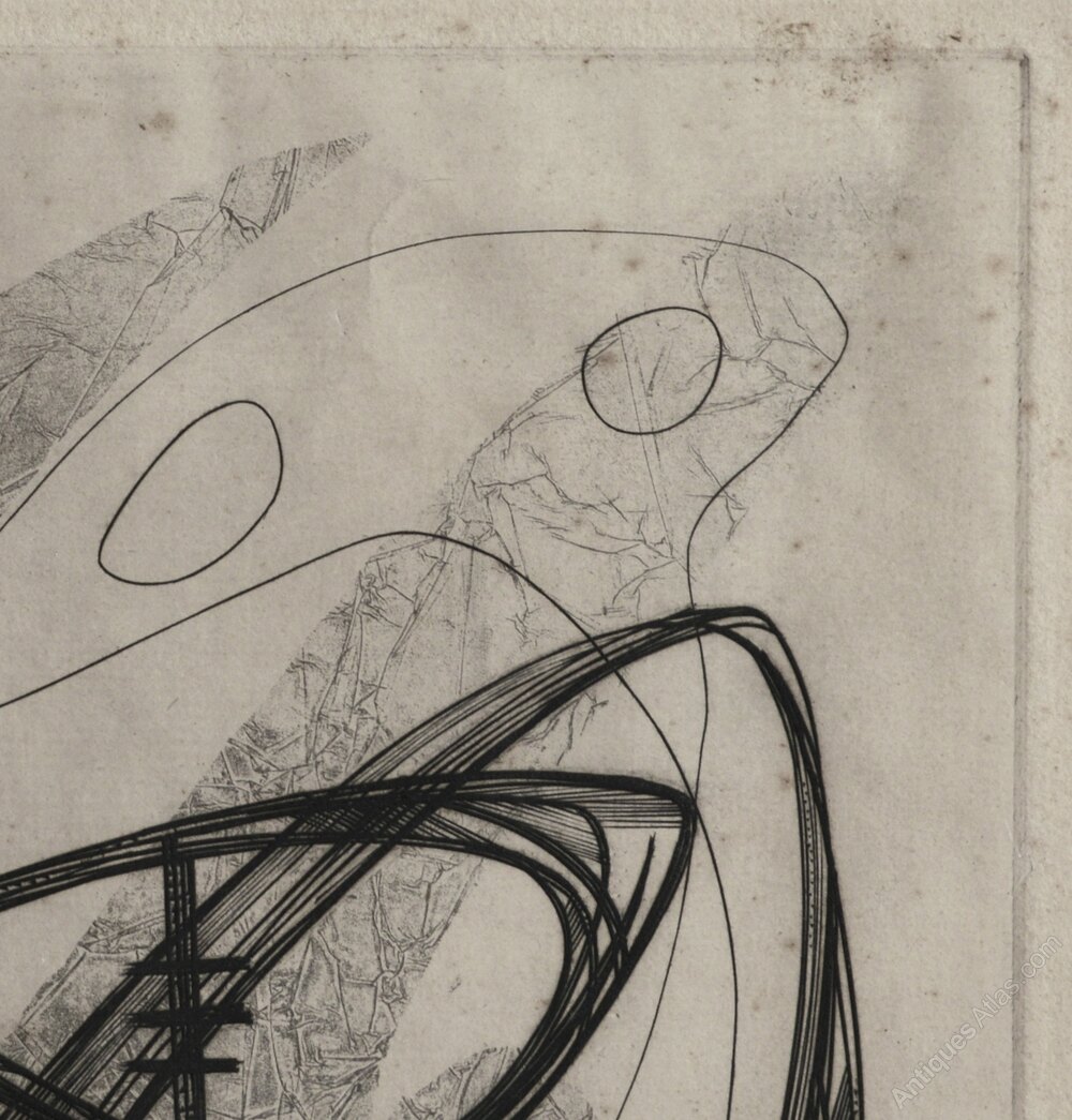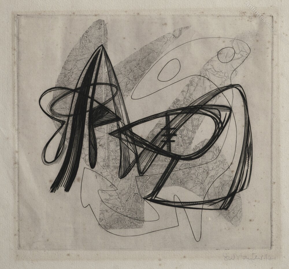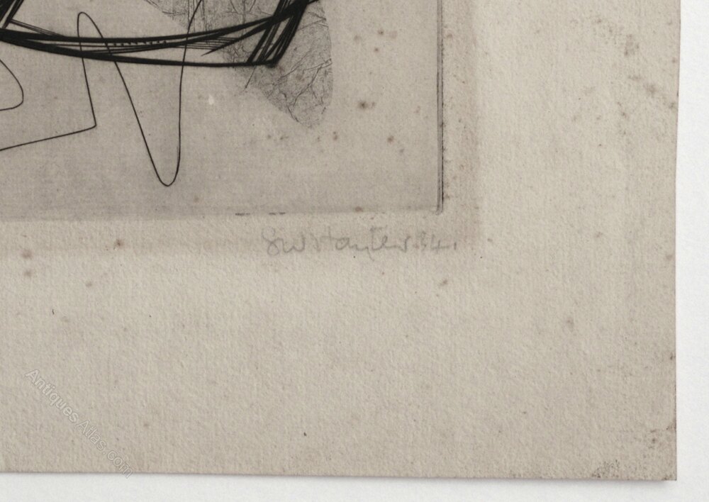 A scarce early engraving and soft-ground etching, printed in black ink on laid paper. Signed and dated SW Hayter 34 in pencil. No title or edition number. Indistinctly inscribed ……? Bill? 18.3.37 , (upper left): The back of the sheet is inscribed: E 7415 – £10 – S. W. Hayter (top right) also inscribed Z087 (bottom left corner). The British Museum has one example of the print, No. 1989,0617.12 (not illustrated on their website).Reference: Black et Désirée Moorhead, Ed. Phaidon, 1992 / The Prints of Stanley William Hayter (82.iii). Illustrated on page 115 of the catalogue.
