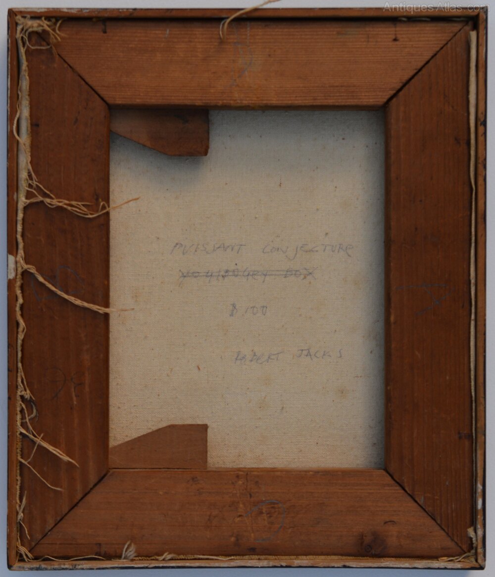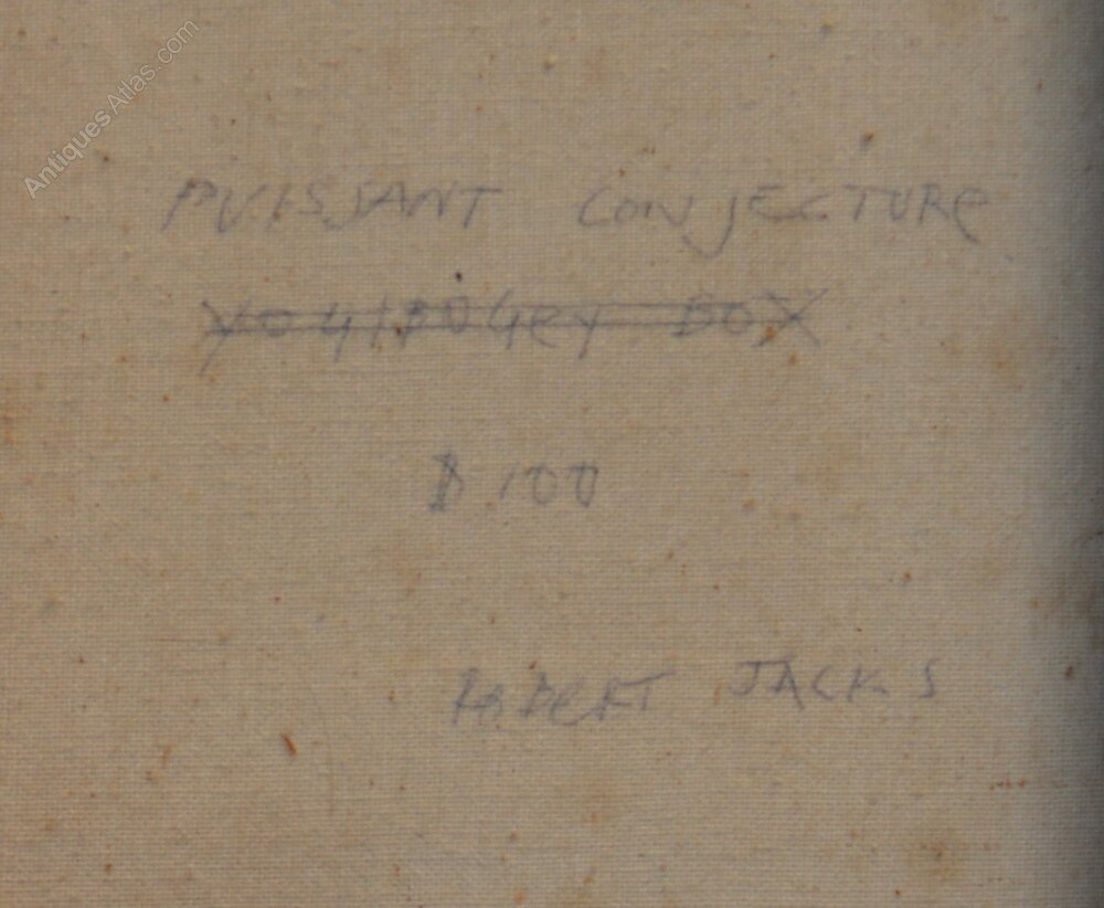 Robert Jacks (Australian, 1943-2014). Puissant Conjecture.Mixed media on canvas Signed by the artist and inscribed with the title on the back of the canvas, with the price $100. The frame appears to be the original.