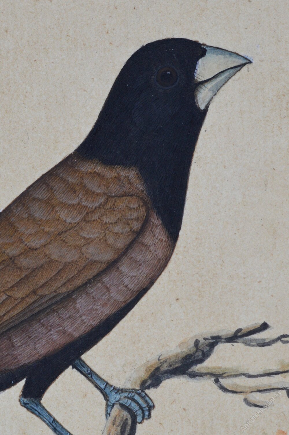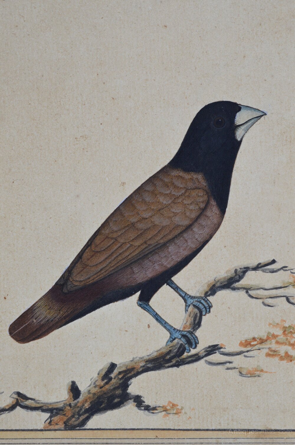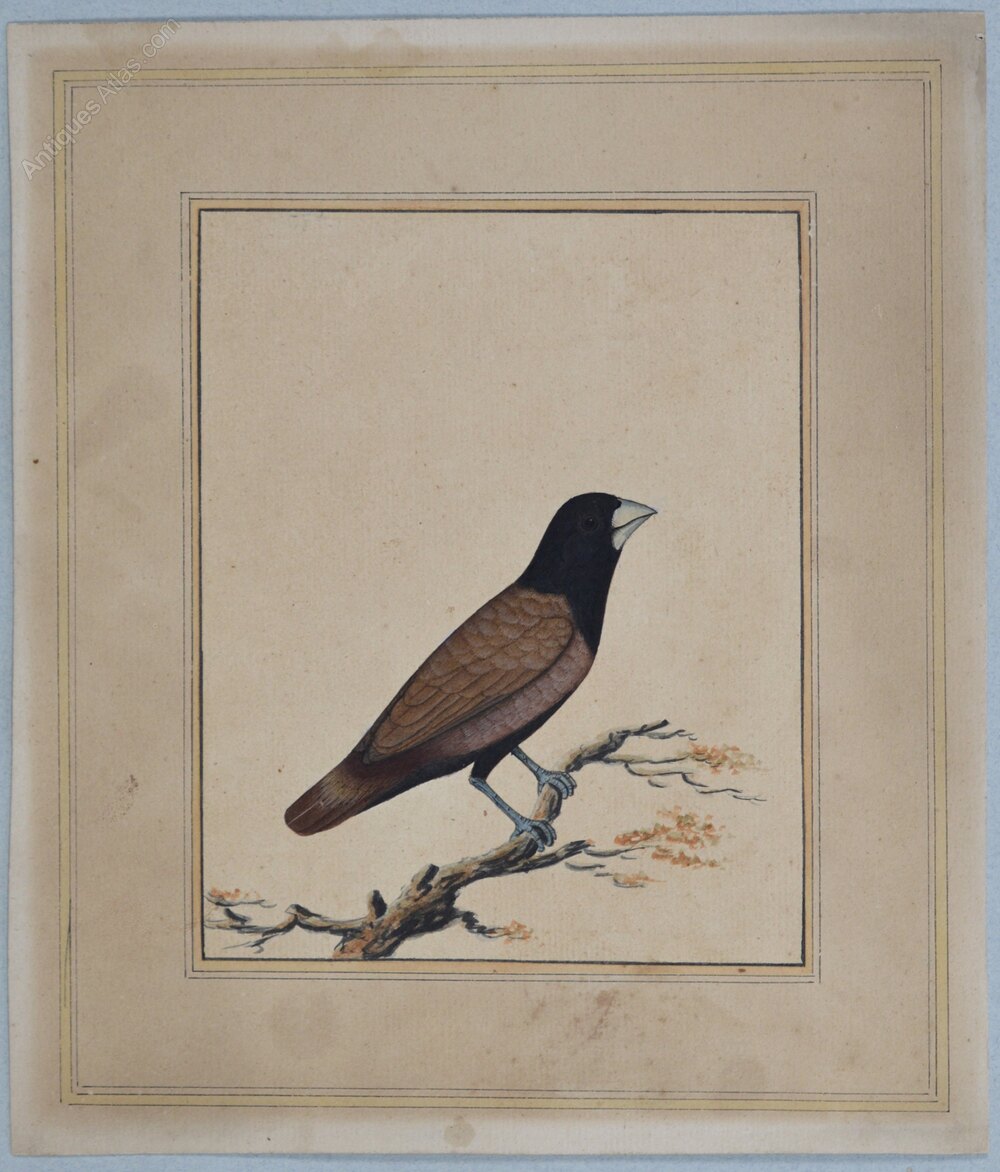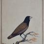 Company School India, possibly Bangladesh or Patna, India, first half 19th century. Chestnut Munia (Lonchura Atricapilla).Opaque watercolour, with pen and black ink and touches of white gouache on laid paper. The study depicts a bird with a black head and maroon wings perched on a short tree branch, set against a plain background. The sheet is laid onto thick laid paper, with a wash-line. There is no frame.