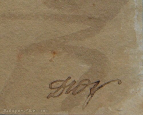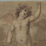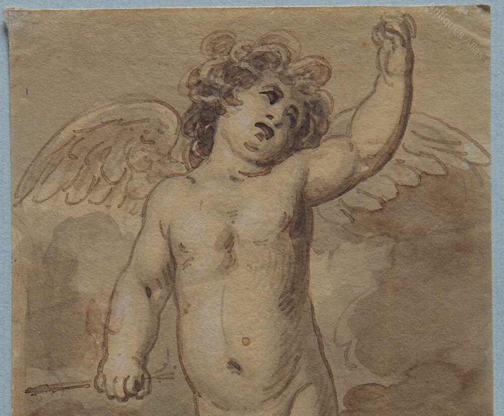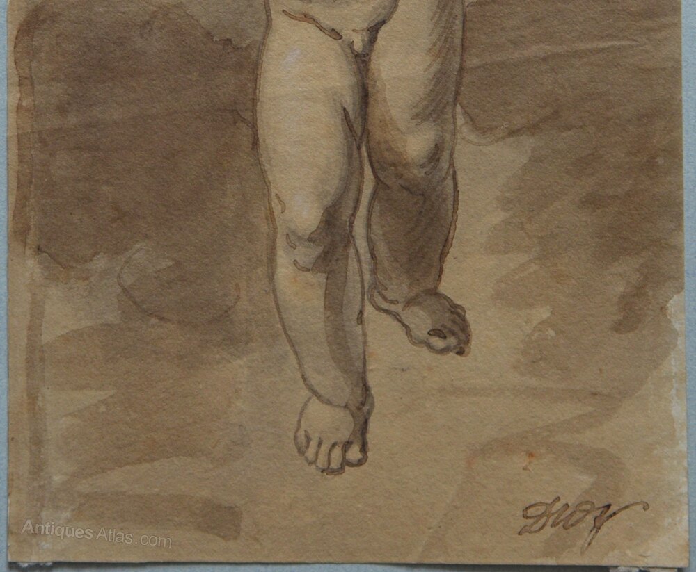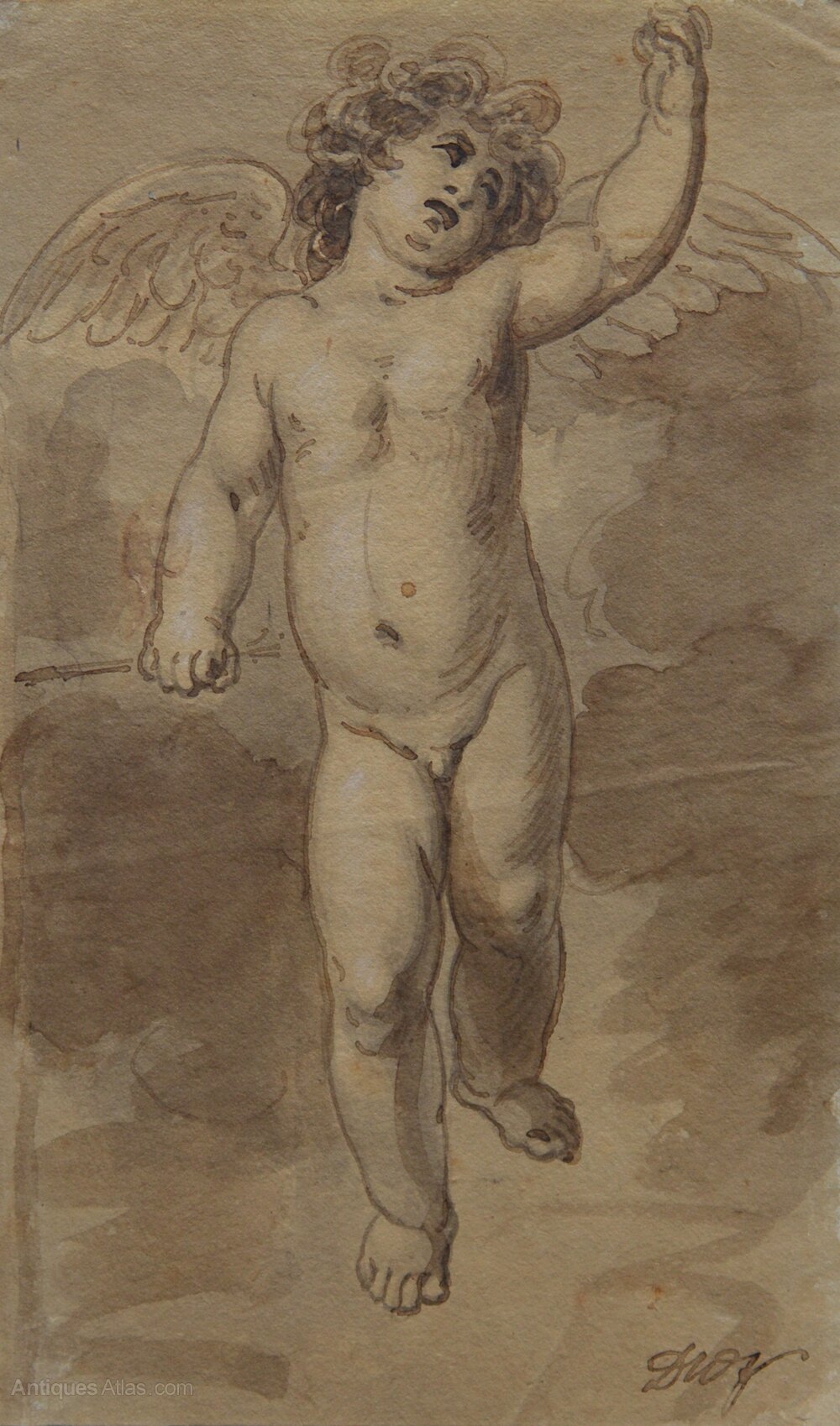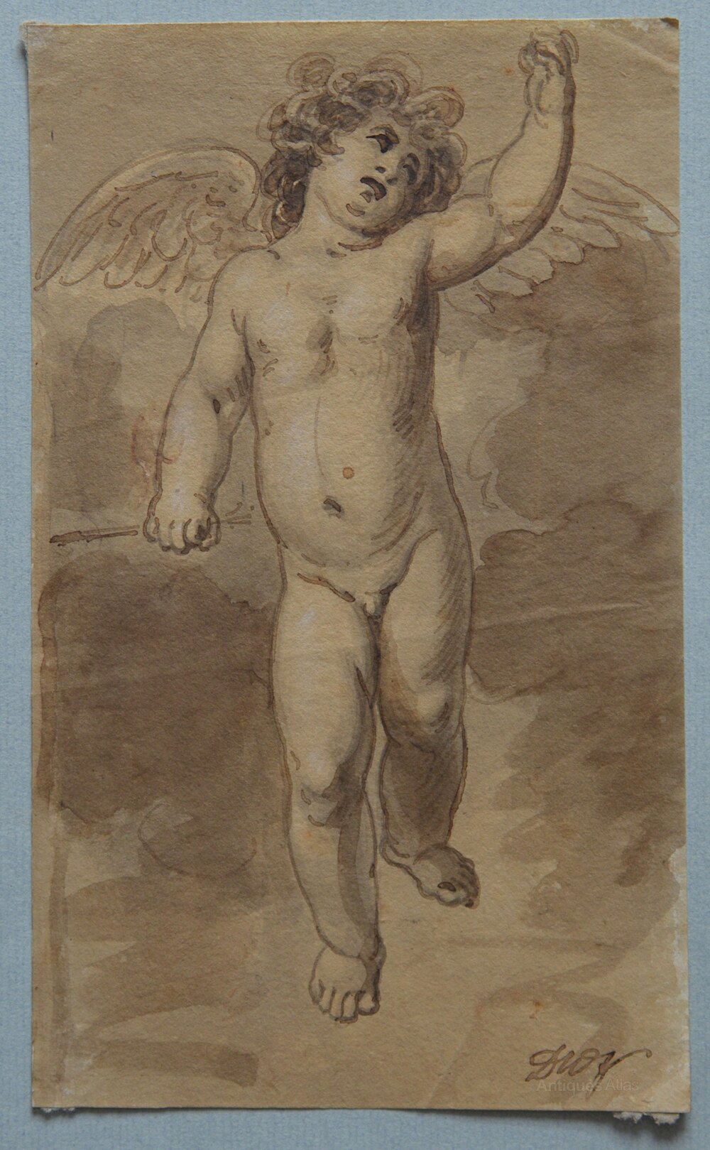 Good quality 19th century drawing of a cherub in grey and brown ink with faint touches of white chalk over graphite on off white paper. Initialled DW-(F?) possibly DW (fecit) lower right.Sheet: 8 1/8 x 4 15/16 in. (20.6 x 12.5 cm.)