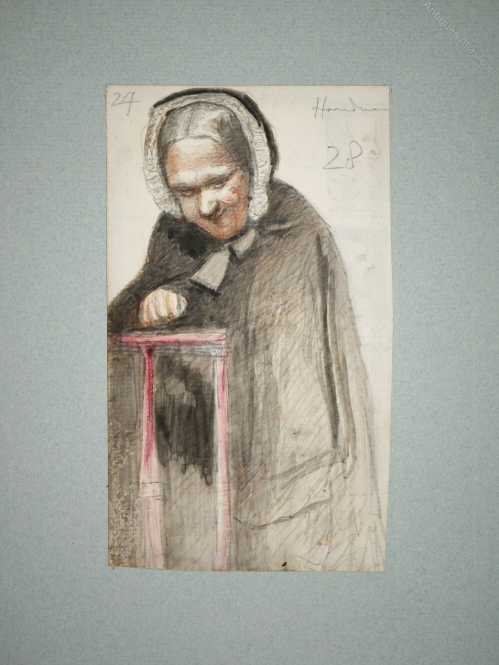 James Smetham – In CourtIn Court (Recto). Squaring’s with inscriptions (Verso). Graphite/pencil with watercolour and ink washes on white laid paper. Variously inscribed and numbered in pencil pen and brown ink, front and back: Backing paper: Blue Ingres, laid. Presented in a clear archival acid-free polyester sleeve.