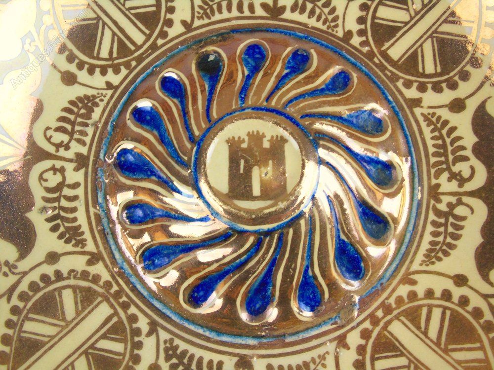 This is a beautiful early 19th century Hispano Moresque charger painted in the sixteenth century style dating from around 1820.The charger is in excellent condition for its age and is beautifully detailed with hand painted foliate leaf designs and central castle in copper lustre and cobalt blue which has a delightful iridescent glow. The piece remarkably has no damage or restoration.