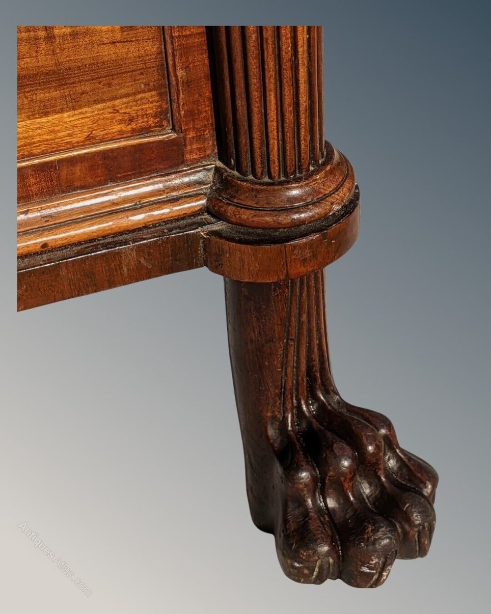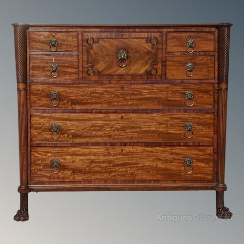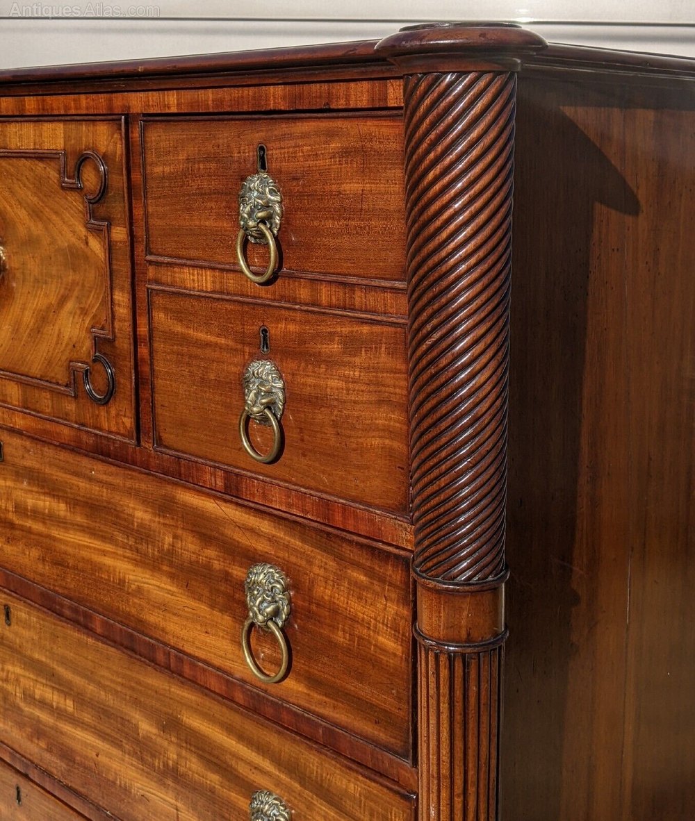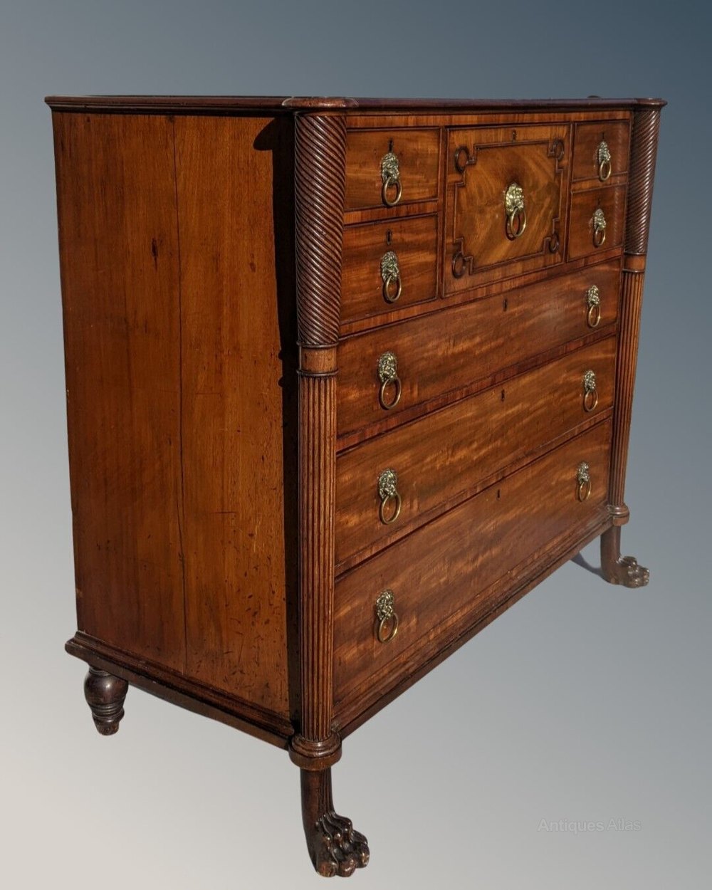 A very handsome Regency period mahogany chest circa 1830.The fine chest has a grand design with recessed drawers with superb lions mask handles flanked by spiral cone columns that taper to fluted pillars above the fabulous Regency paw feet. The practical chest has great storage capacity with an arrangement of seven drawers. Two small drawers to the right, one with an internal pair of small keepsake drawers for jewellery, cuff links etc. A grand deep ‘hat ‘ drawer centrally and another equally deep single drawer to the left as 2 faux drawers. These above three spacious long drawers. All are in excellent condition and run smoothly in the cabinet.