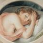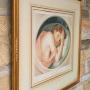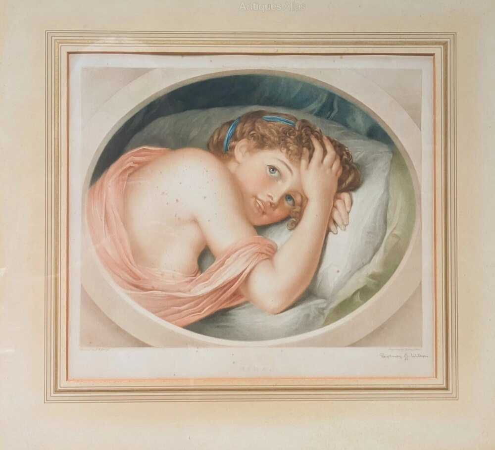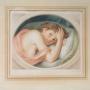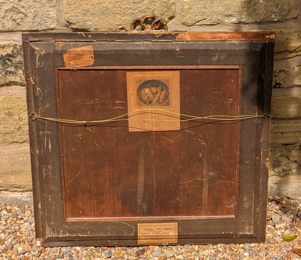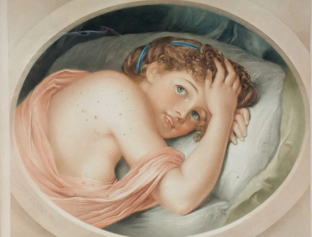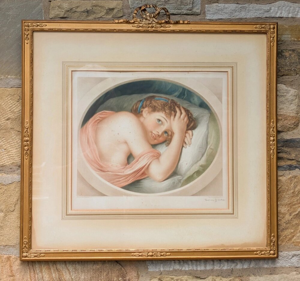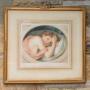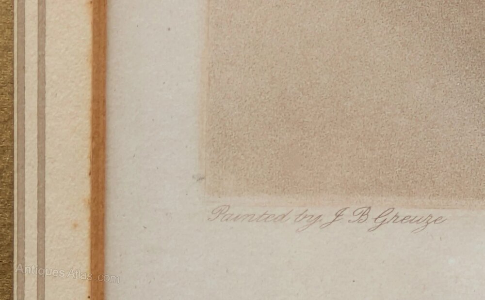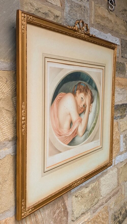 A good large hand coloured engraving after Jean Baptiste Greuze in its original frame with original labels to the reverse.The engraving is attractively mounted in an oval mount with outer secondary mount set into the original gilt frame with decorative ribbon bow crest.