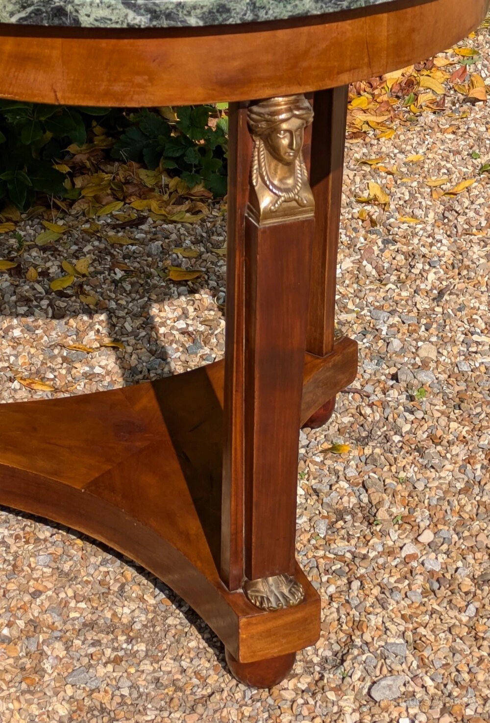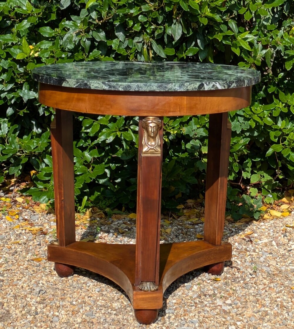 This is an elegant Egyptian Revival period French Gueridon table with classic bronze mounts and a superb figured marble top dating from around 1900.The handsome table has typical Egyptian influenced design with bronze figureheads and feet to the support columns, the base raised on turned bun feet. The super top in Verde Alpi marble has a wonderful colour with black, white and even red veining and measures 70 cms in diameter with the table being 70 cms in height overall so this has very attractive proportions for a variety of situations.
