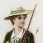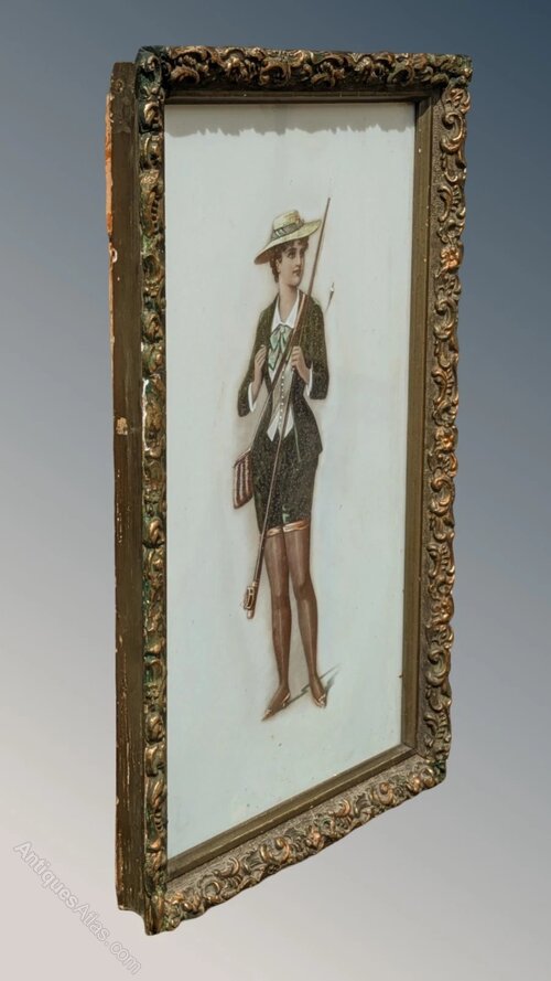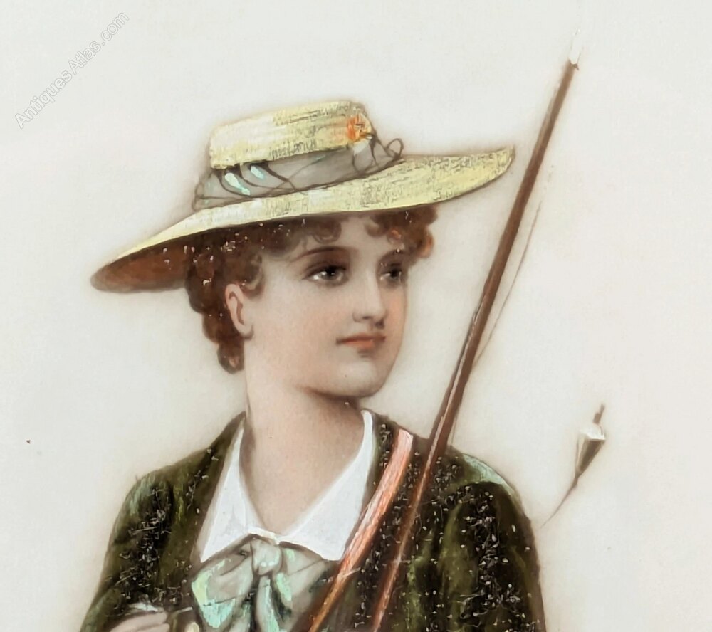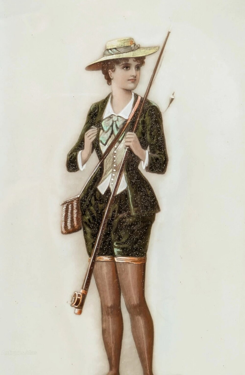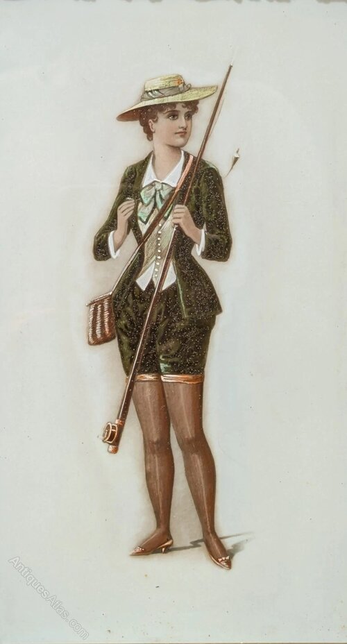 A rare painting of an Edwardian lady angler hand painted on porcelain plaque.Circa 1900