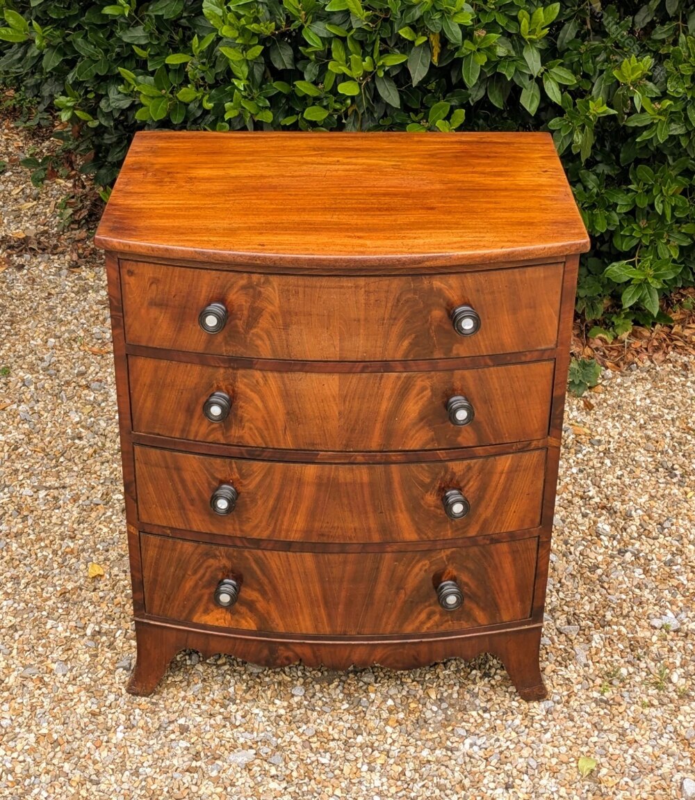 This is an attractive early 19th century mahogany chest of drawers with very neat proportions dating from around 1830. The chest is in lovely original condition with a good colour and patina. This has its original turned ebony handles inset with mother of pearl buttons and has a beautiful and decorative flame mahogany veneer to the drawer fronts. These have a bow front shape and ebony line inlaid cock beading. The drawers are all in good shape running freely in the cabinet which is raised on attractive out swept feet.The chest is a very practical size, most unusual in its small proportions measuring 80 cms high by 66 cms wide by 48 cms deep.