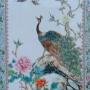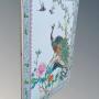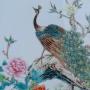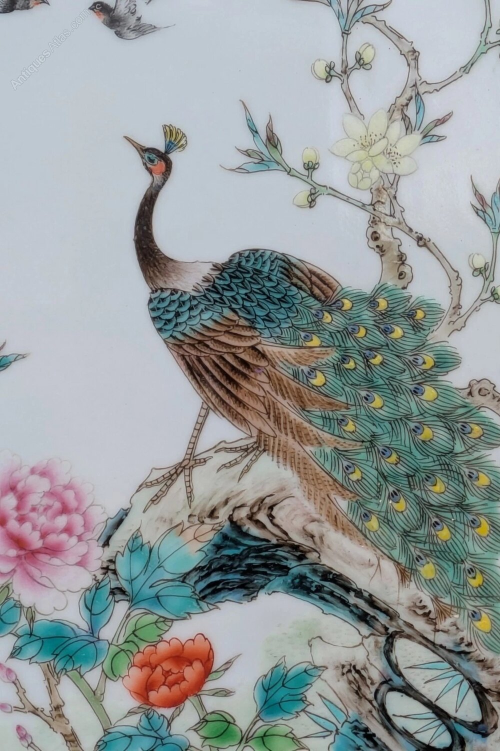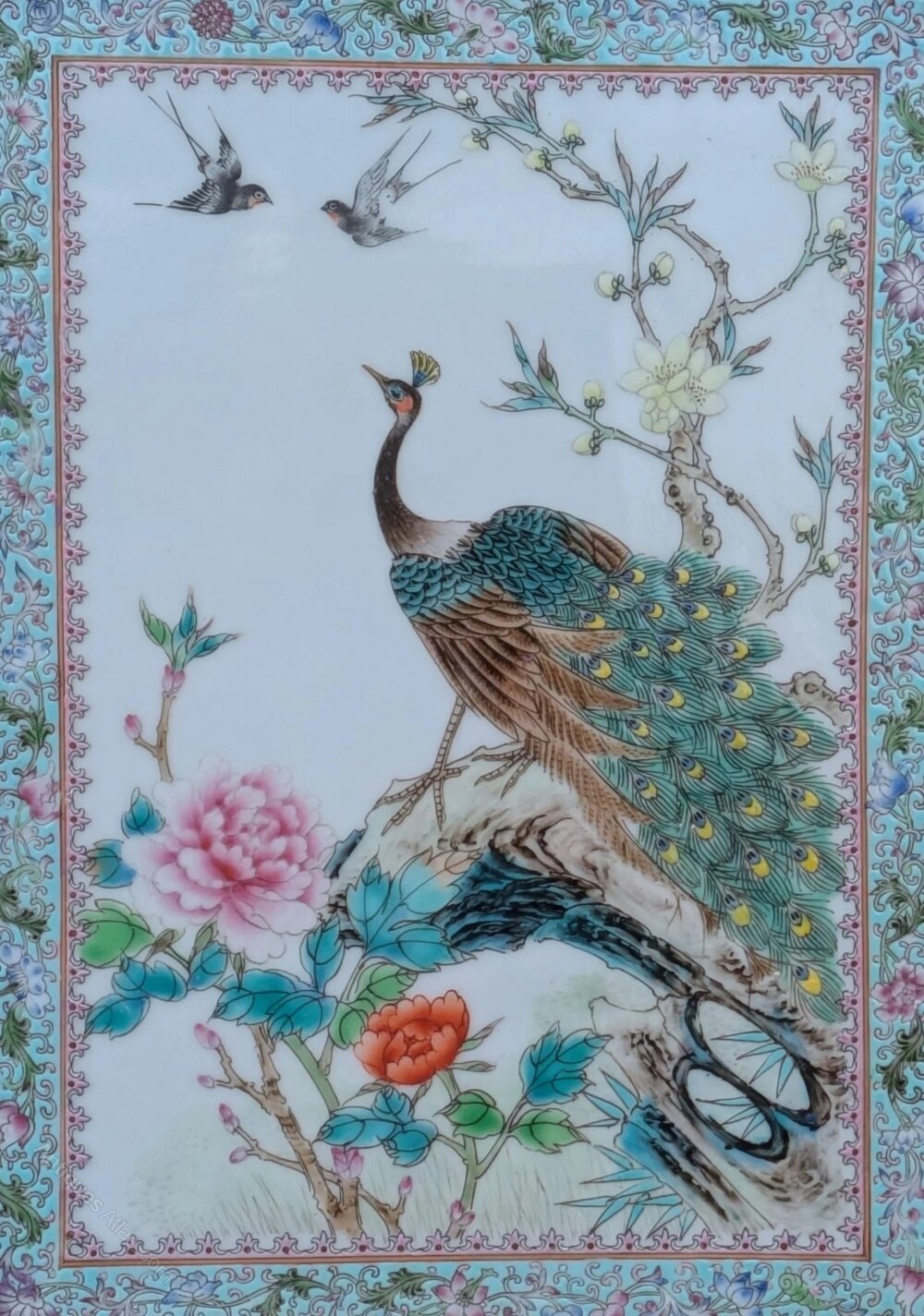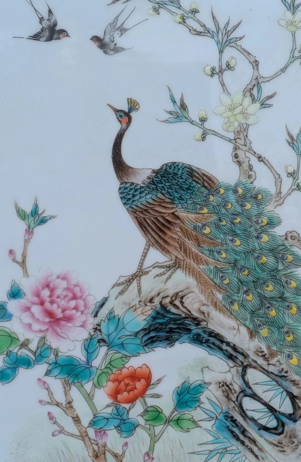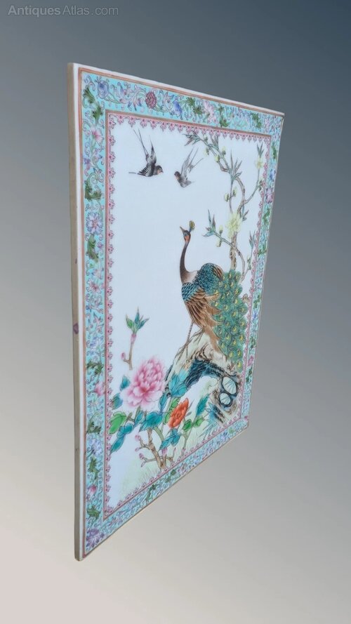 This is a most beautiful early 20th century Chinese painting on hard paste porcelain in the famille vert palette, dating from around 1920.The porcelain plaque has a lovely delicate colourway hand painted in enamels with a fine peacock central to the work. The bird sits in beautiful chrysanthemum blooms and foliage observing two swallows above in the clear white sky.