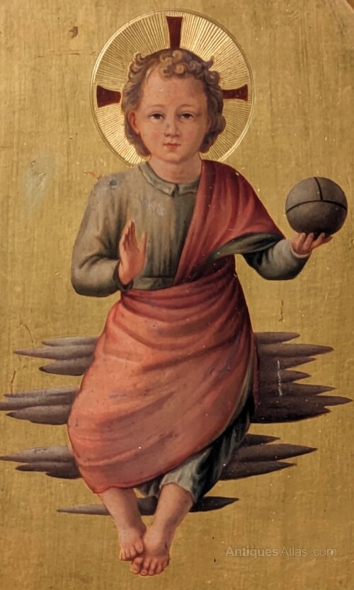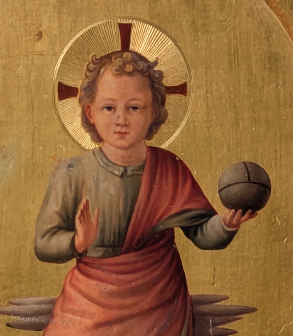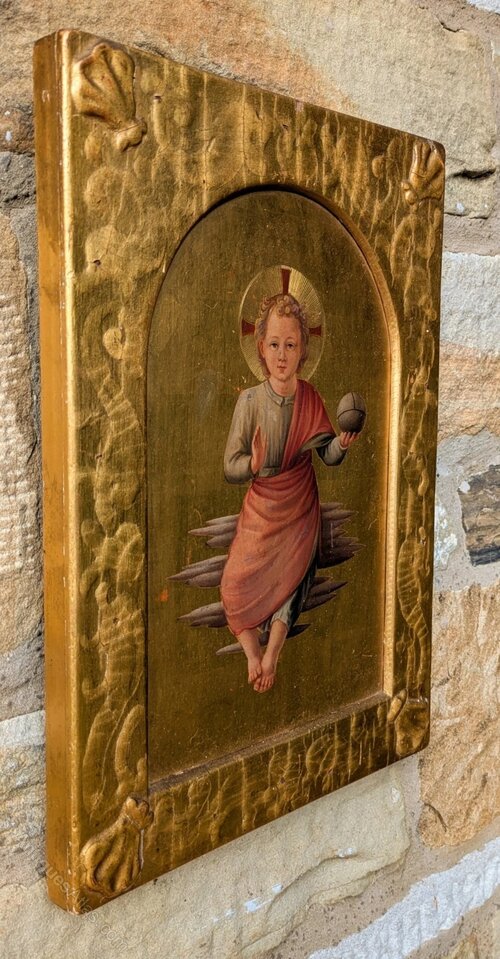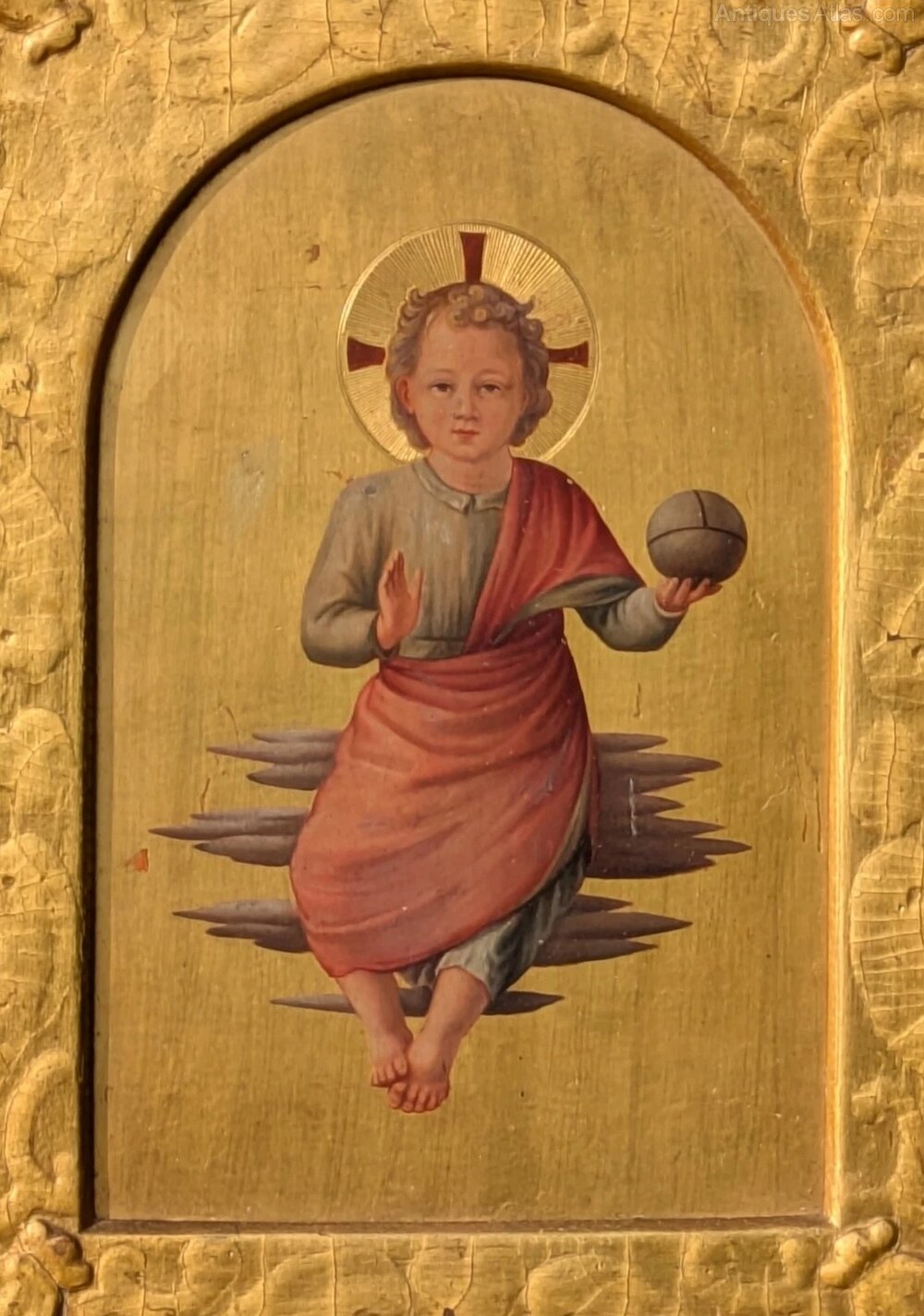This is a beautiful 19th century giltwood icon in excellent original condition after Fra Angelico.The icon depicts a beautiful image of the baby Jesus holding an orb to symbolise his dominion over the world.