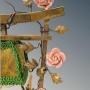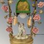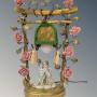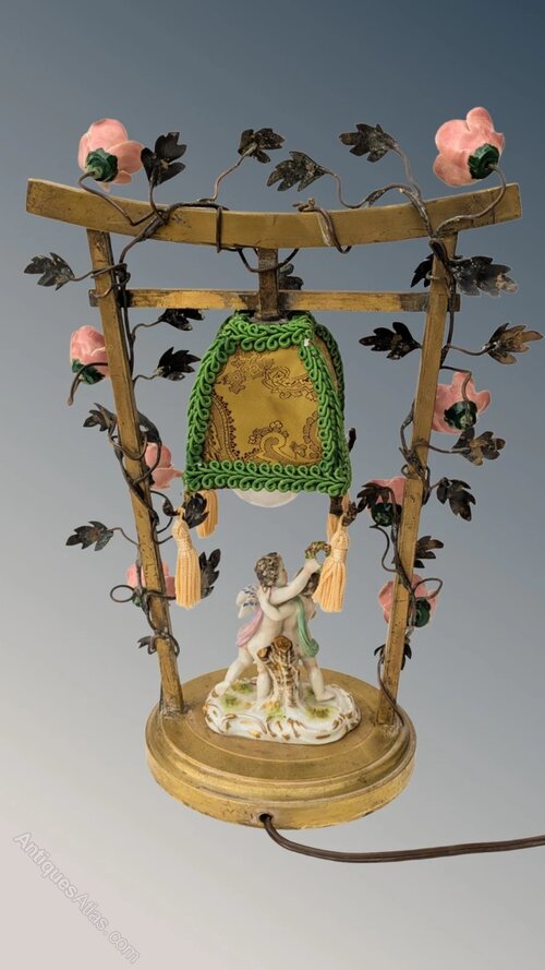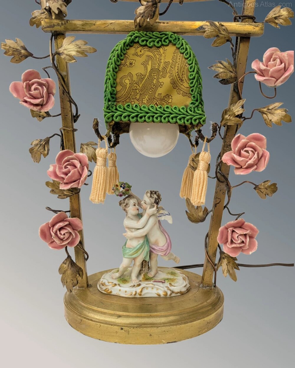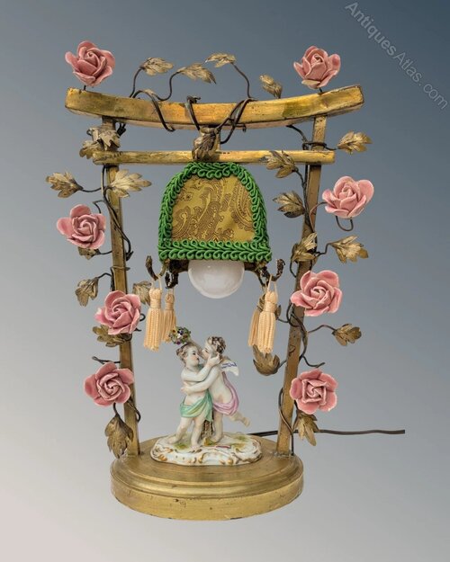 This is a delightful French porcelain and toleware table lamp with a really pretty design dating from around 1900. The lamp has central porcelain cherubs in an embrace set within a gilt bronze gate with entwined foliage and pretty floral porcelain blooms. The lamp has its original fabric covered shade with later tasselled decoration.This takes a standard bayonet fitting bulb and is rewired ready for use in the home.