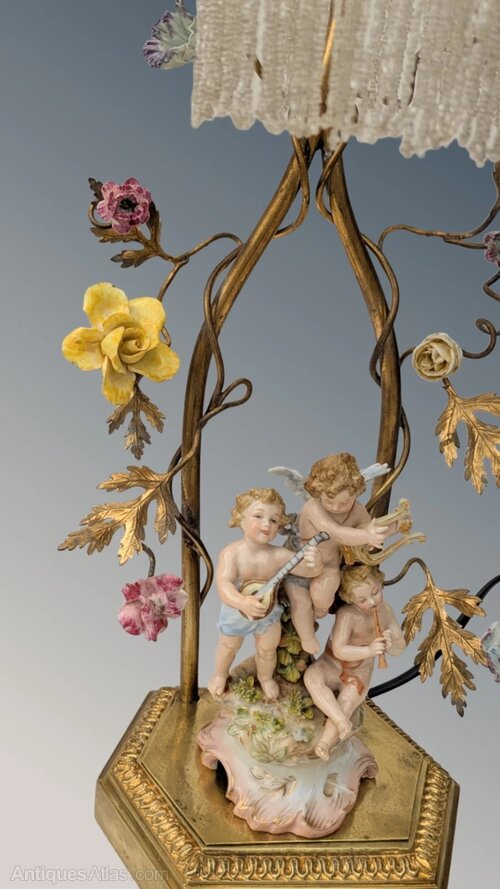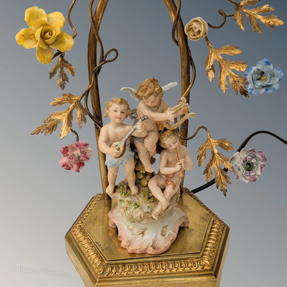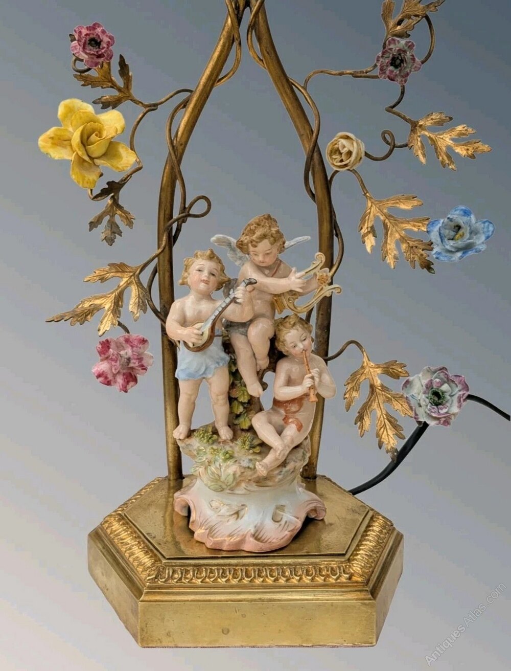 This is a beautiful early 20th century French porcelain and toleware table lamp. The lamp has the most exquisite cherub group of musicians to the centre, framed by an arbour of pretty gilded foliage with porcelain floral blooms. The lamp is a most attractive design with a delightful hanging beadwork shade with pretty porcelain floral dome to the top and solid brass finial.This is wired to modern standards and has an inline switch to the cable.