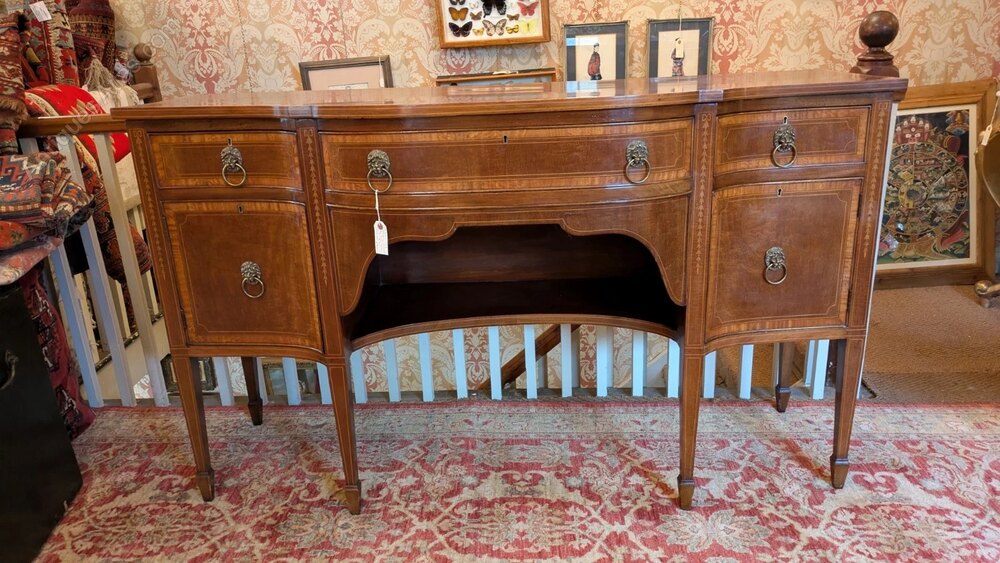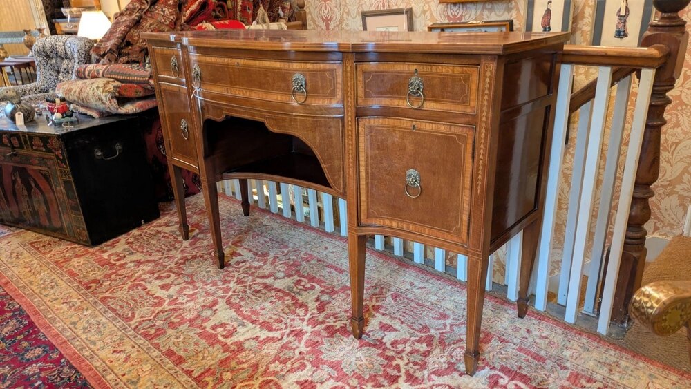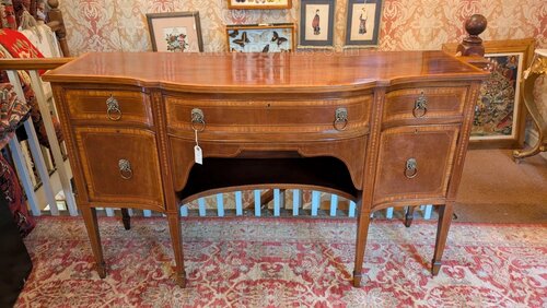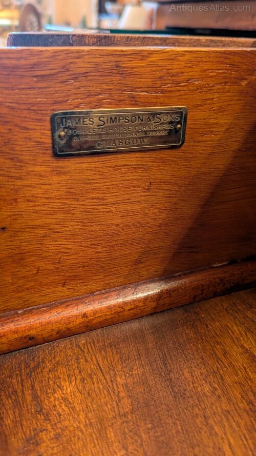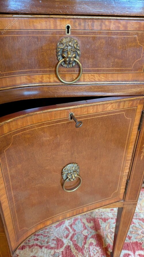 A fine quality 19th century side cabinet bearing the original label of James Simpson and Sons Glasgow.The elegant sideboard is in wonderful clean condition and has a lovely colour and good antique patina to the inlaid mahogany. This has solid mahogany square tapering legs with spade feet and has two cabinets and three useful drawers all with the original brass lion mask handles.