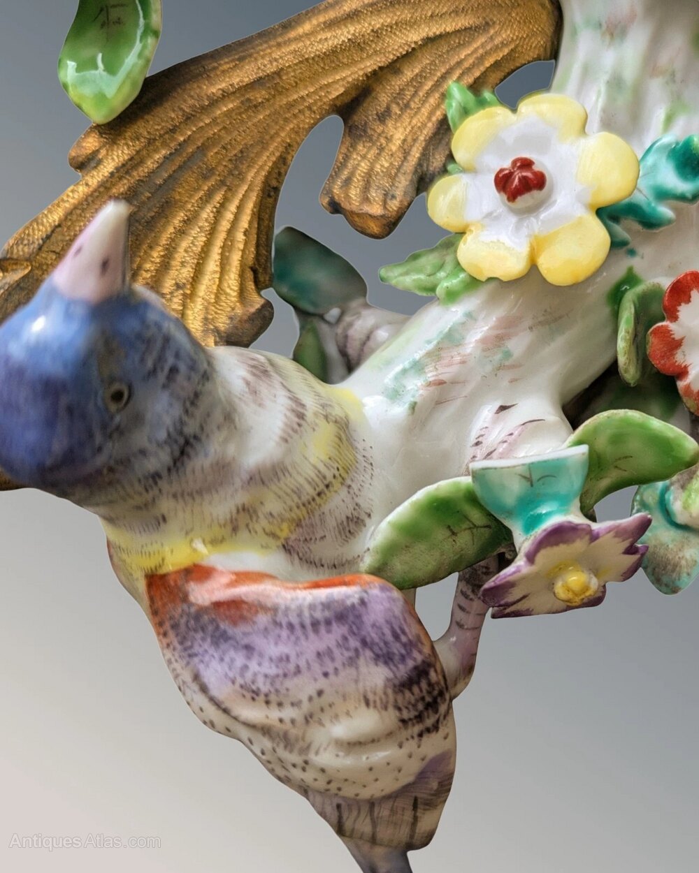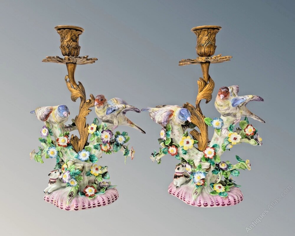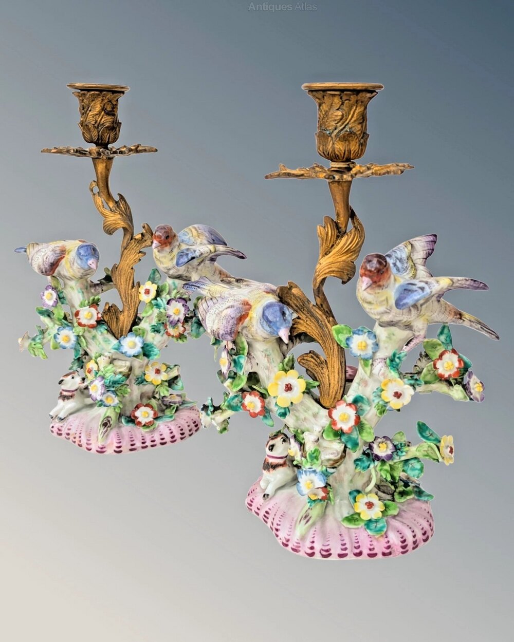 This is a beautiful pair of early Derby porcelain and gilt bronze candlesticks dating from around 1760. The candlesticks are in high quality hard paste porcelain and are extremely pretty with beautiful hand painted floral detail and a matching pair of lovebirds with a cute dog at the base of the tree. The decorative gilt bronze candleholders have a curling acanthus leaf form with good oak leaf detail to the candle sconce. These are a really delightful early pair in very good condition for their substantial age with only a couple of very minor losses to one or two petals and leaves as photographed.The candlesticks are in good sound original condition overall and both have the gold Derby anchor mark to the base dating them to around 1760.