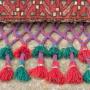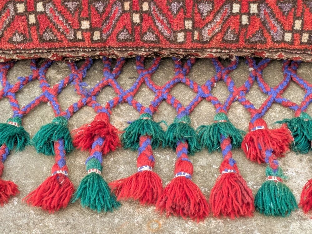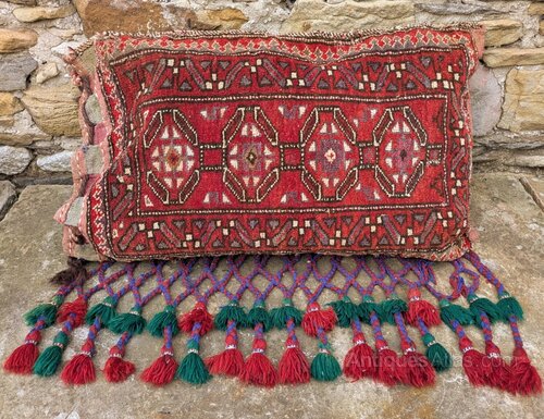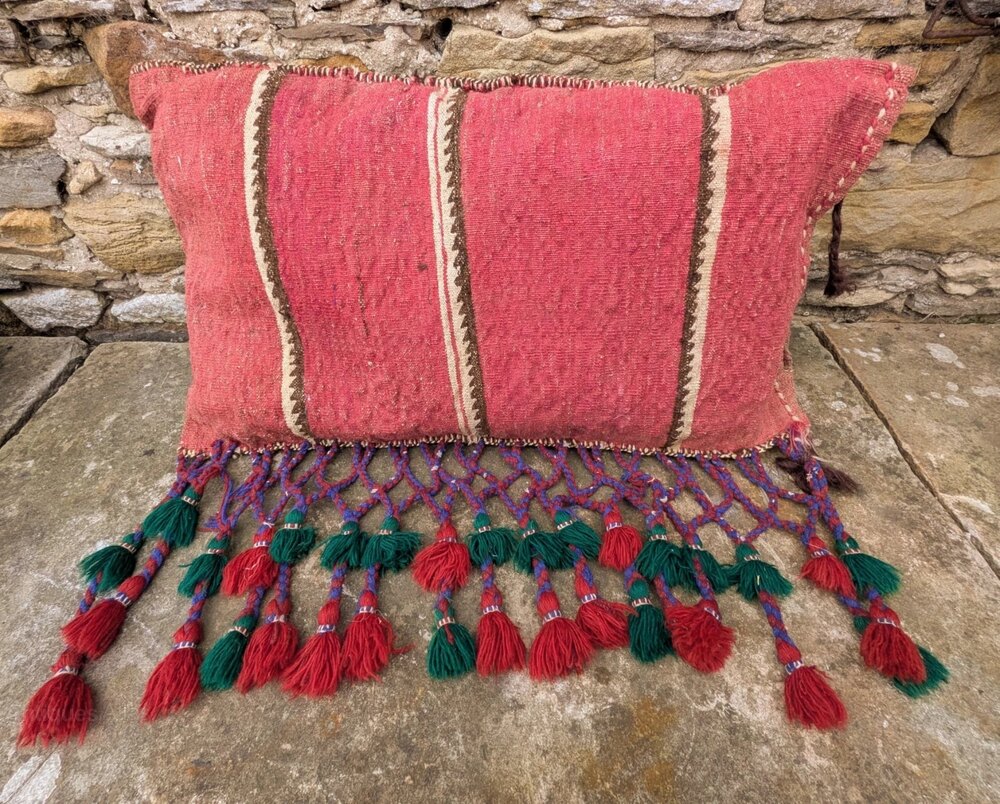 This is a charming early 20th century hand woven woollen cushion originally woven as a bag used for carrying goods by the nomadic people. This example has a hand woven kilim back with striped design and a wonderful trellis design tasselled curtain that is really decorative. This is one of six lovely antique Bagface cushions we currently have listed.This example measures 76 cms by 44 cms by 24 cms