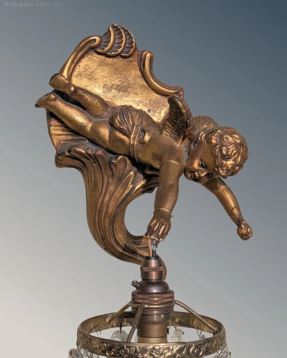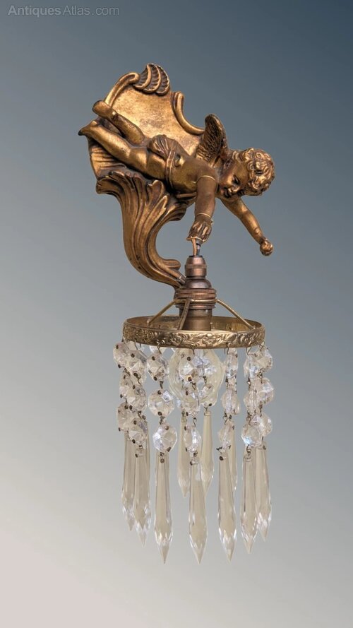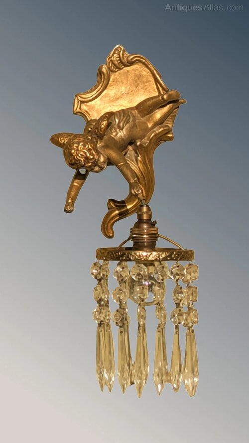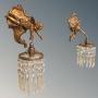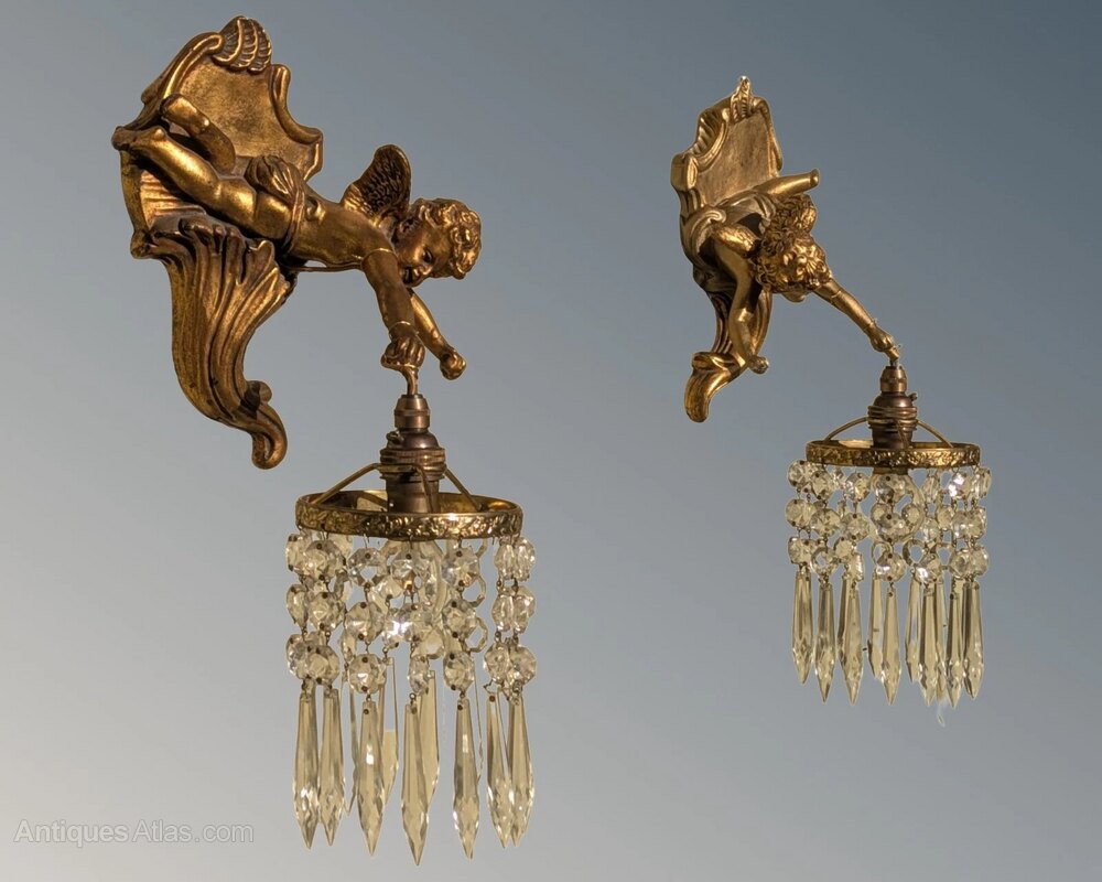 Pretty Pair Gilt Cherub Wall Lights Crystal Drops
