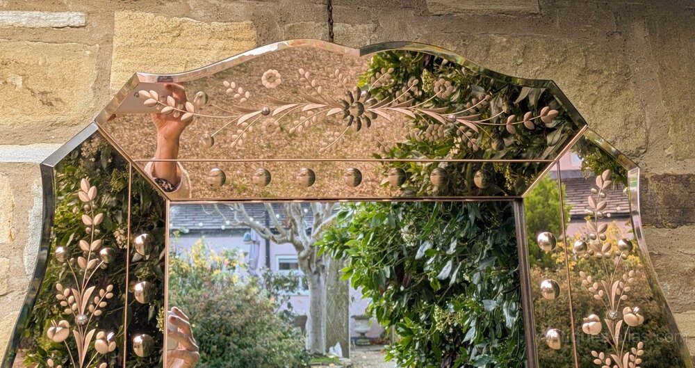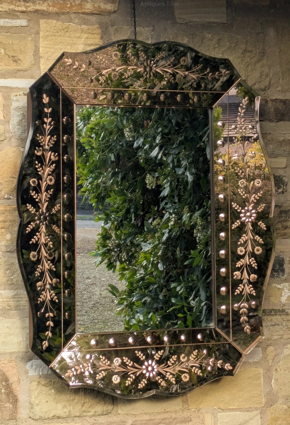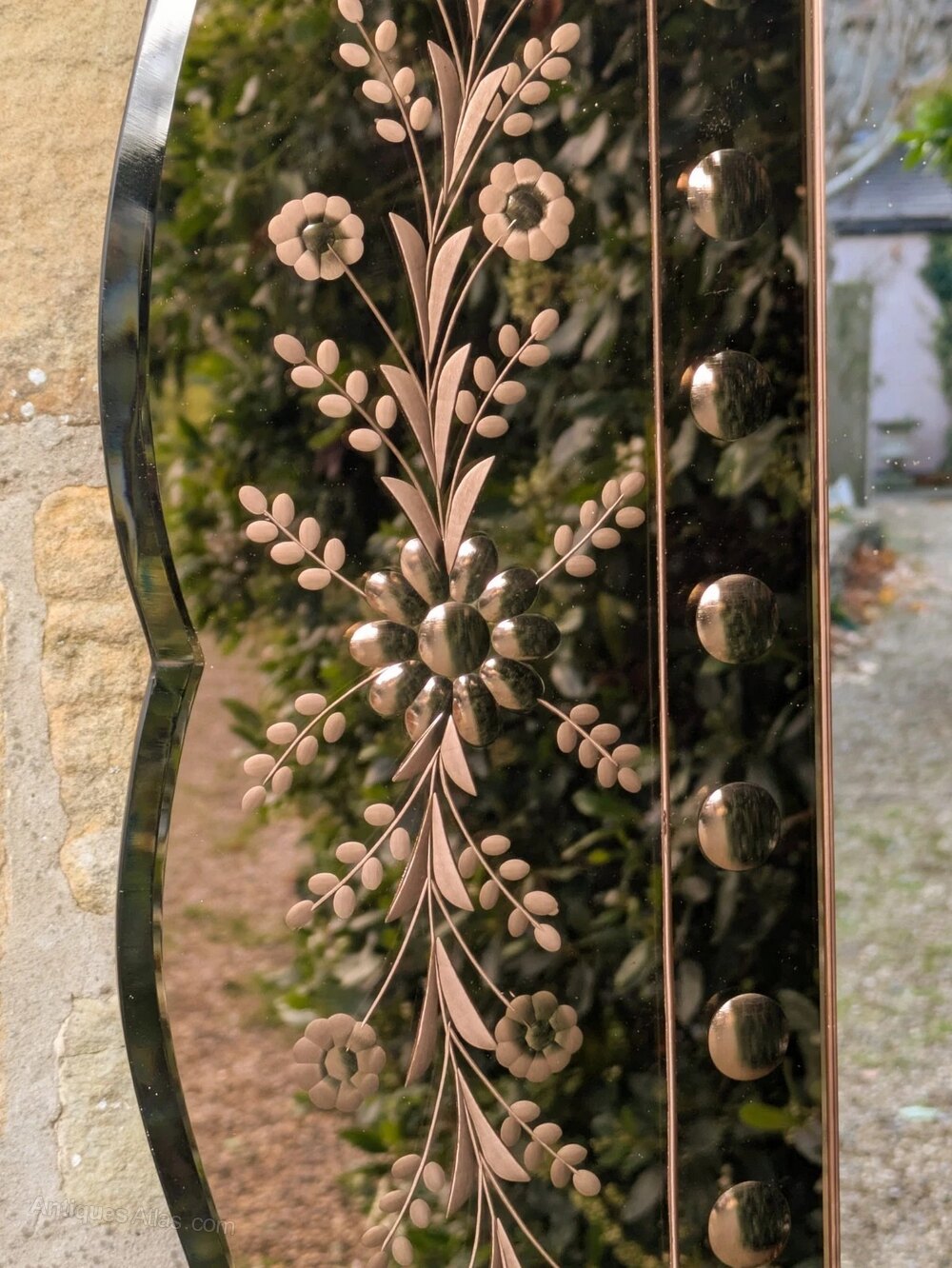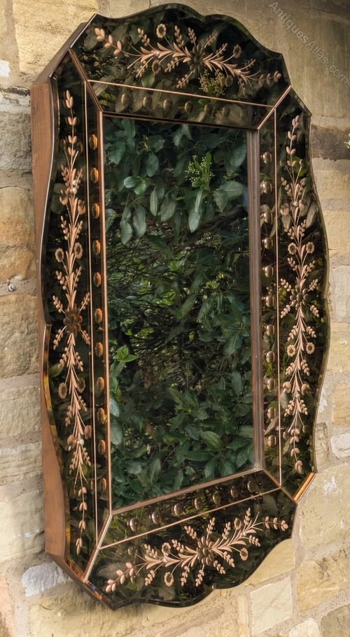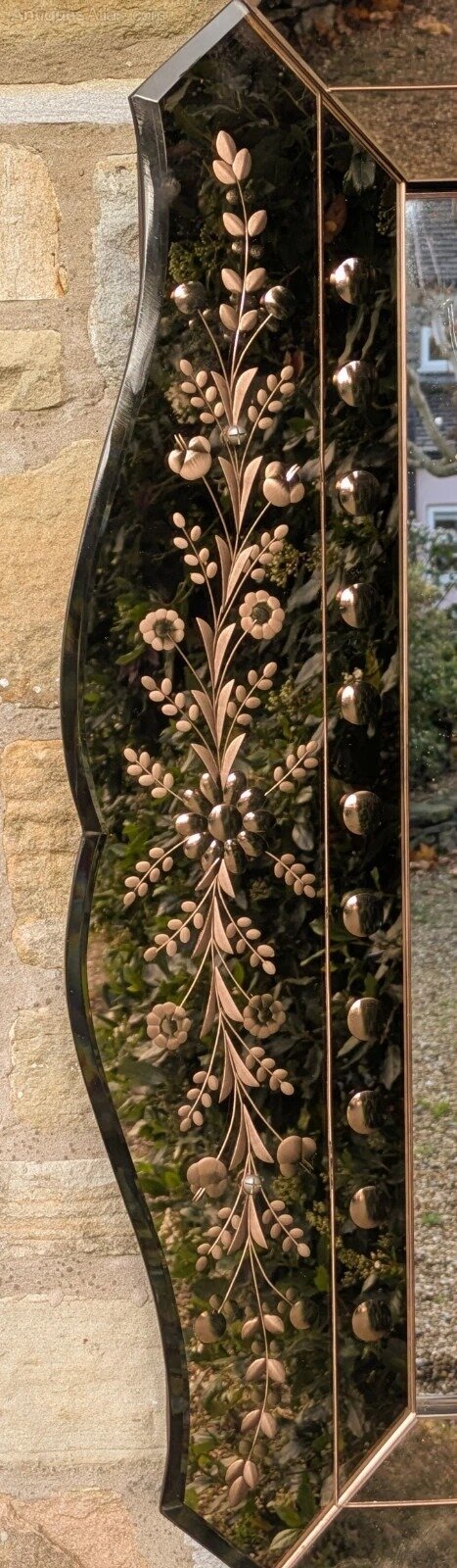 This is a beautiful large Venetian wall mirror in lovely condition dating from around 1930.The outstanding large mirror has a wonderful mirrored peach glass outer frame with cut and etched glass floral designs surrounding the central clear glass plate.