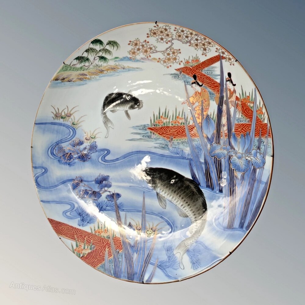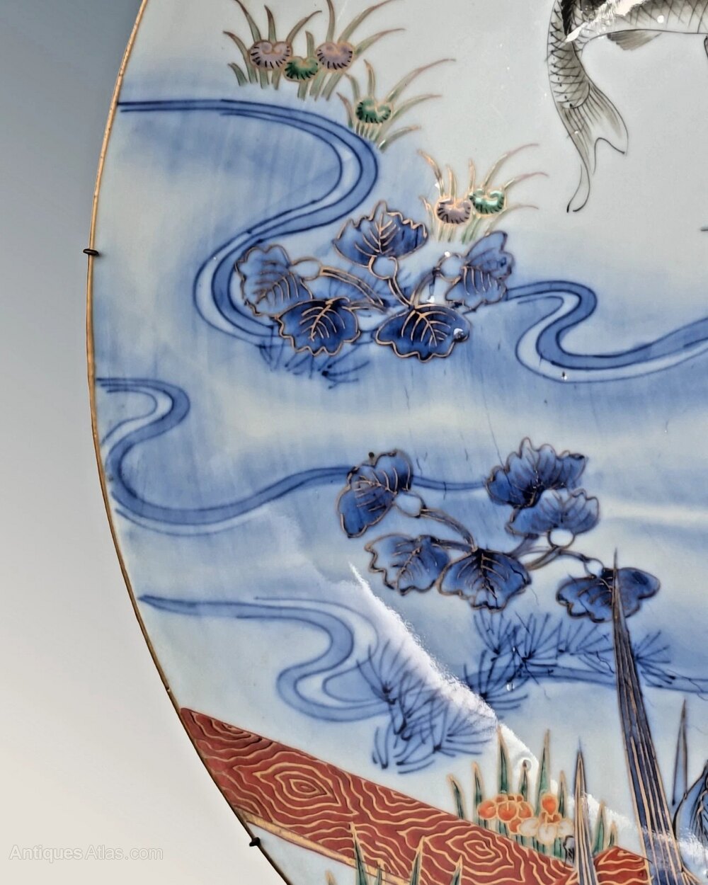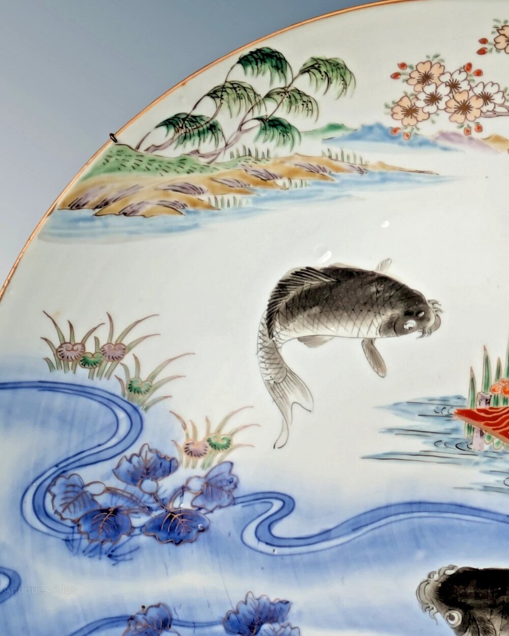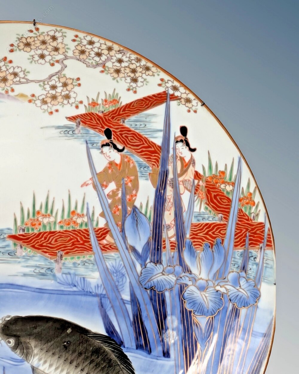 This is an outstanding 19th century Japanese Imari charger in perfect condition dating from around 1870.The fine porcelain charger is beautifully hand painted with a really wonderful work of art depicting large Koi carp in a river with very clever use of perspective that draws the eye into the painting. The fish have such realism with the winding river leading away from the eye and the accompanying boardwalk going off into the distance. The painting includes classic Japanese iconic detail with prunus blossom overhanging and beautiful tall blue irises in the foreground.