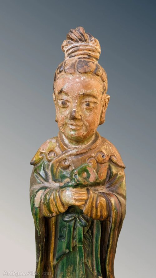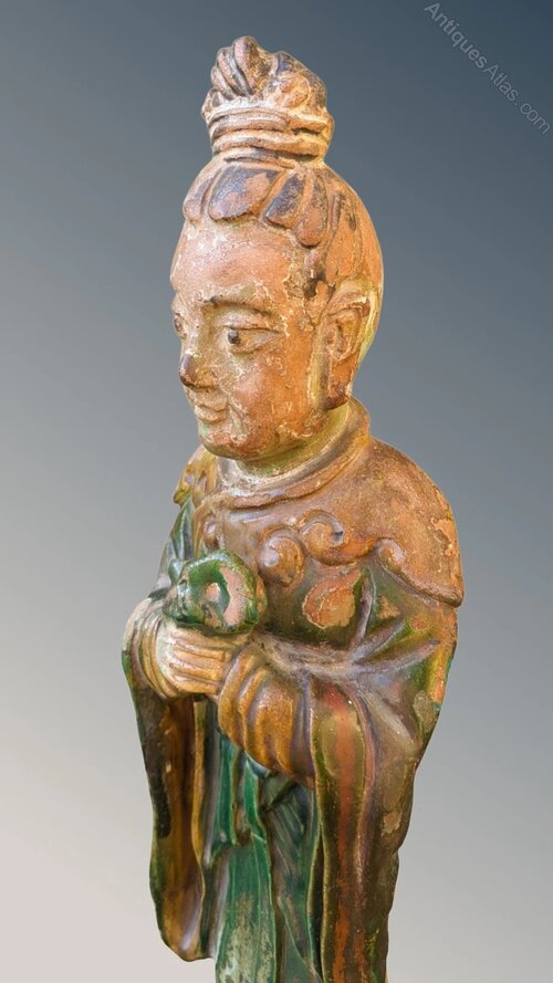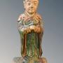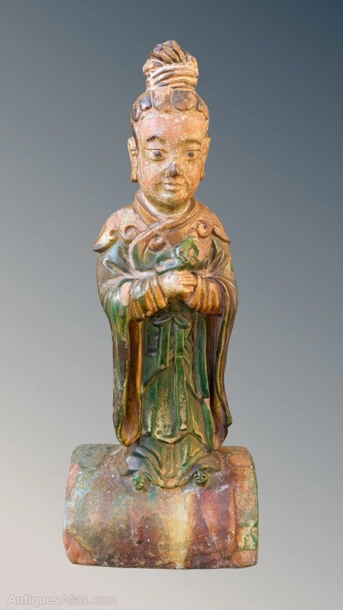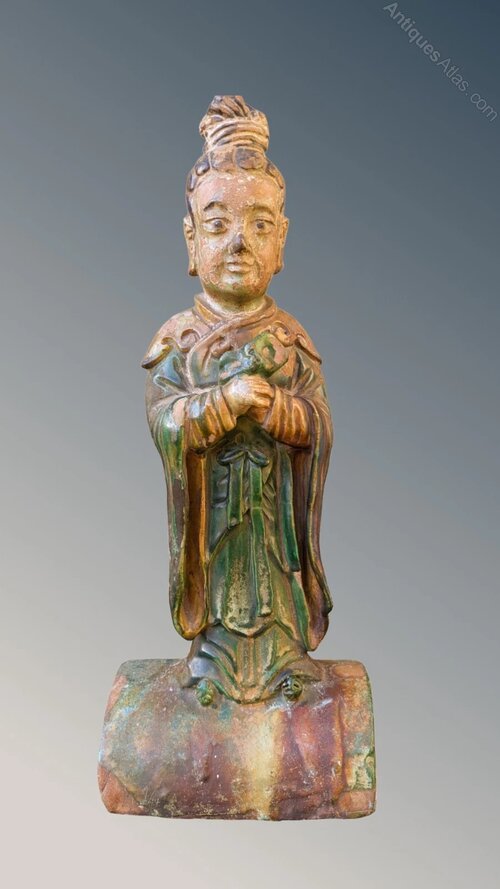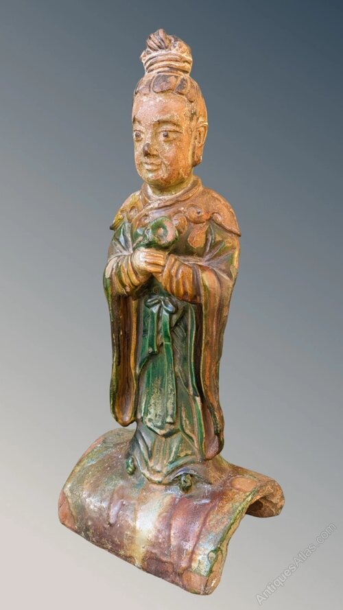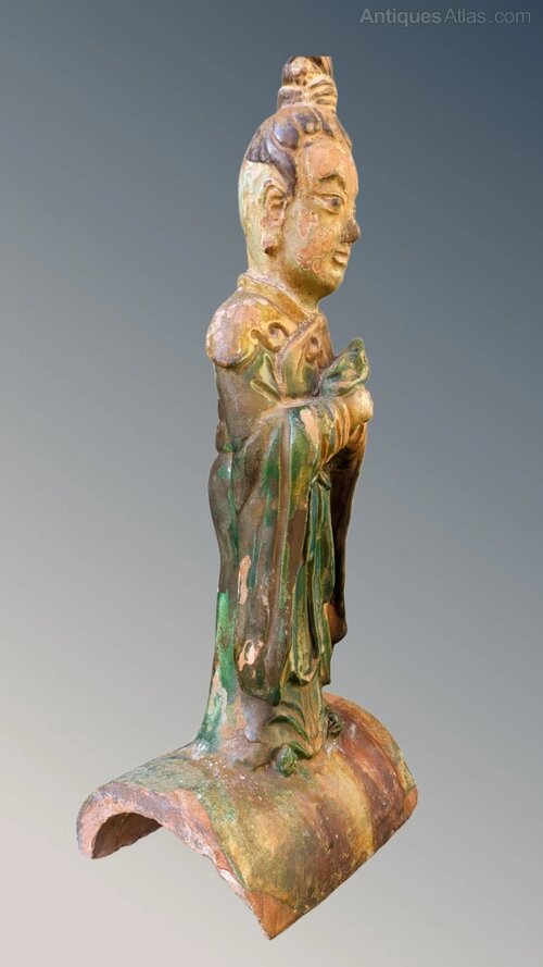 This is a charming terracotta Chinese roof ridge tile, Qing dynasty, probably early 19th Century. The roof ridge tile has a court attendant figure upon it in traditional dress, in beautiful Sancai glaze. This is in very good condition and measures 42 cms high, 16 cms wide and 13 cms deep.UK insured delivery is £15