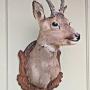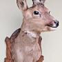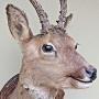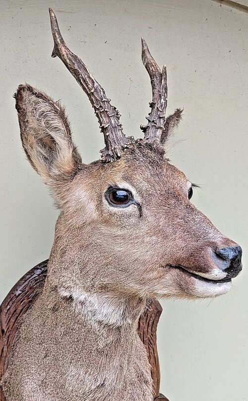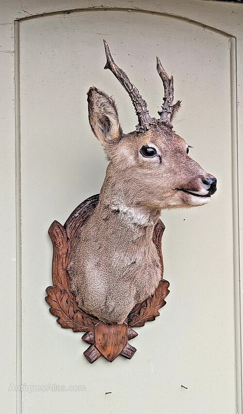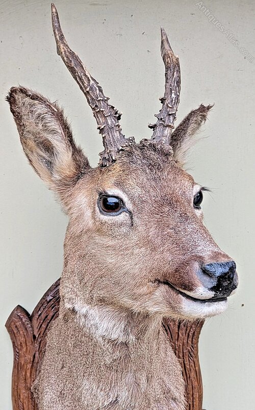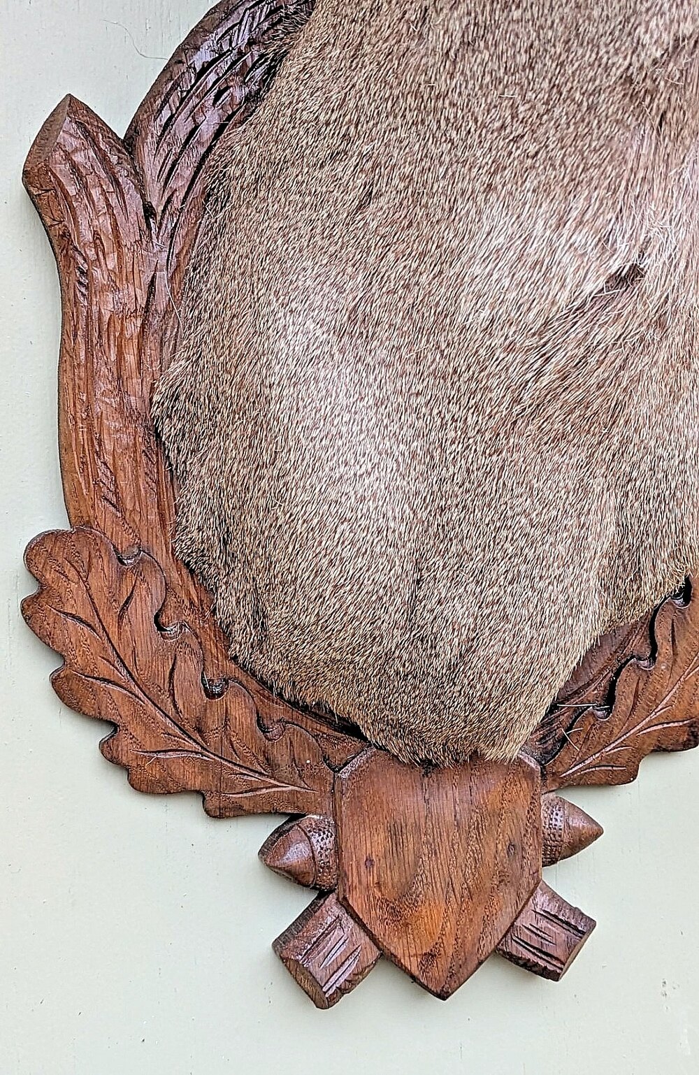 This is a good early 20th century taxidermy mount of a roebuck deer in excellent order.The head is mounted looking slightly to the left on a beautifully carved solid oak plaque with oak leaf and acorn detail.