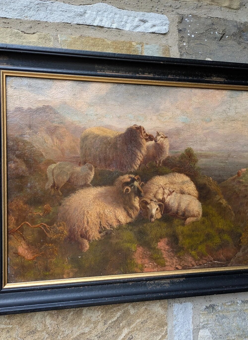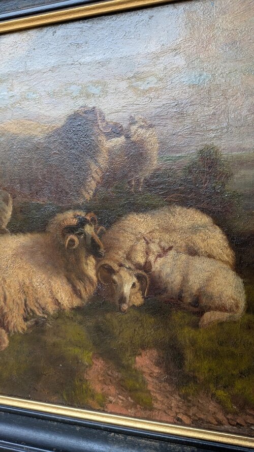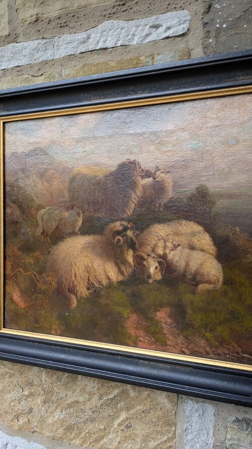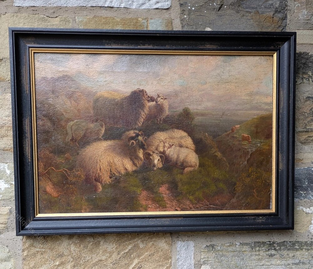This is a good 19th century oil painting on canvas depicting sheep in the highlands with cattle in the distance.The painting is very well executed in the manner of Robert Watson (1865-1916) famous for painting sheep in this type of setting. The painting is in excellent condition and has nice form and perspective with good detail and strength of colour.