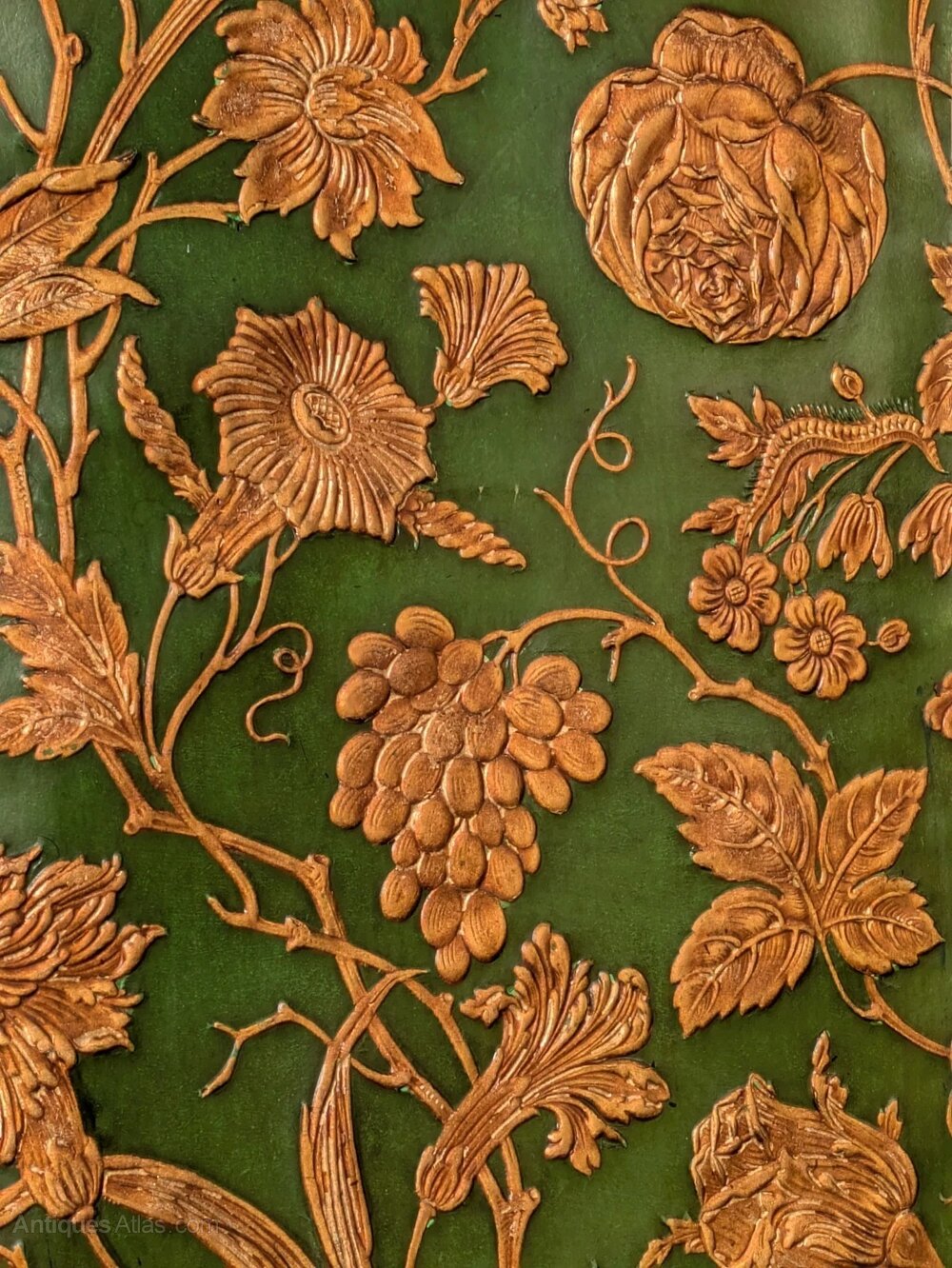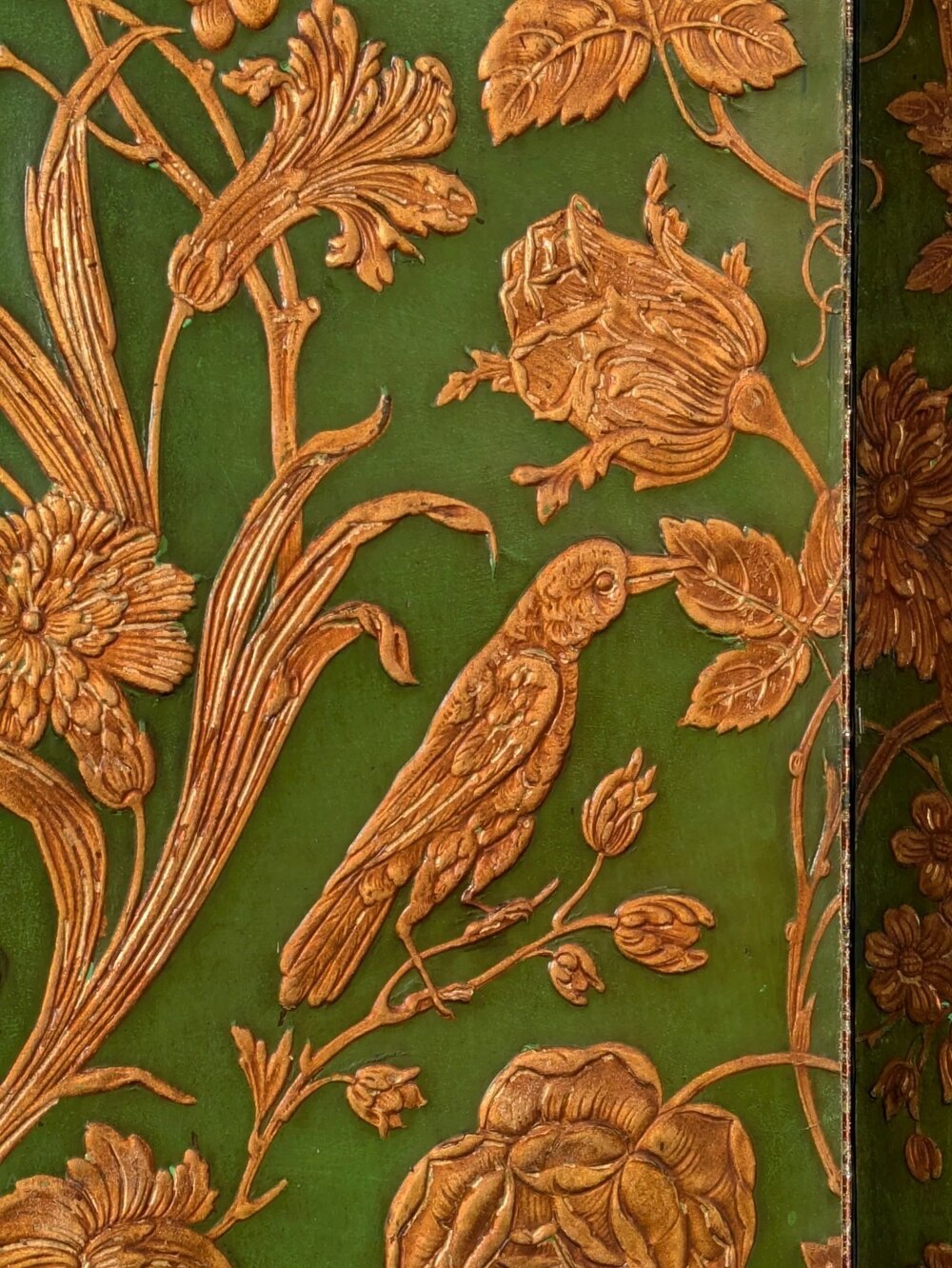 This is a beautiful Aesthetic 19th century antique leather screen in super condition dating from around 1890.The four fold screen has a lovely rich green ground with a fabulous design of scrolling foliage, birds and flowers embossed and beautifully gilded. This is a great size at 2 mtrs in height and 180 cms wide so has good impact in any setting and is in really excellent condition to all the embossed leather panels.