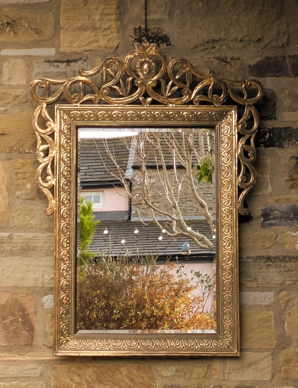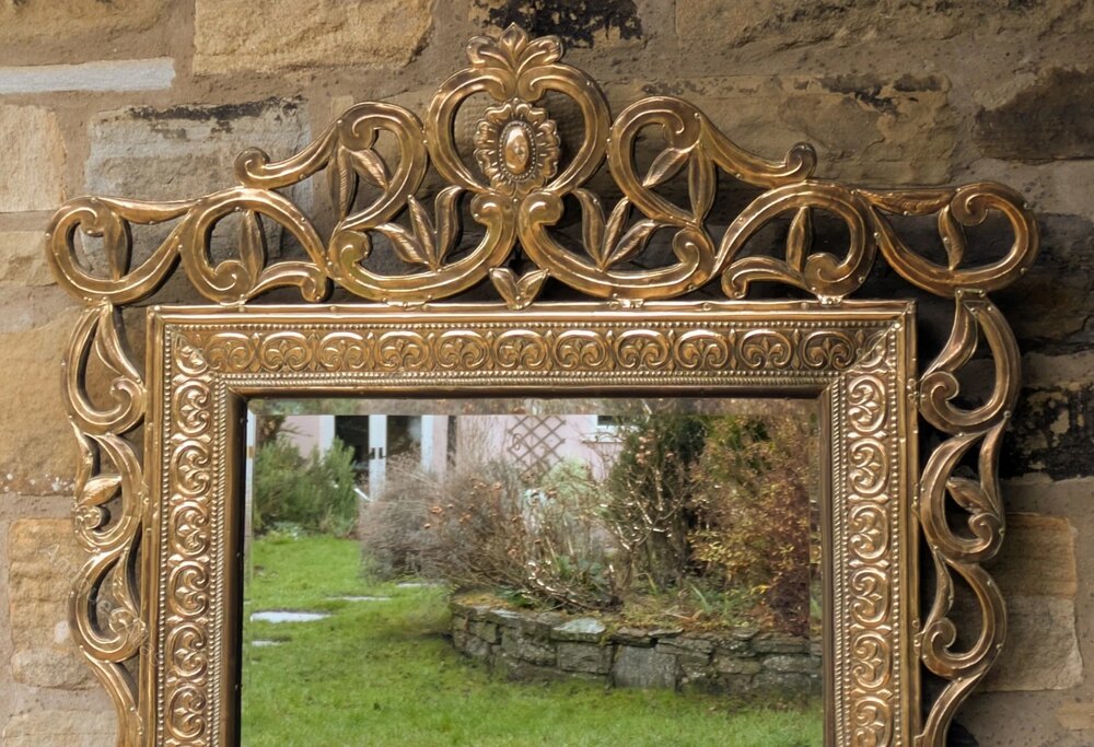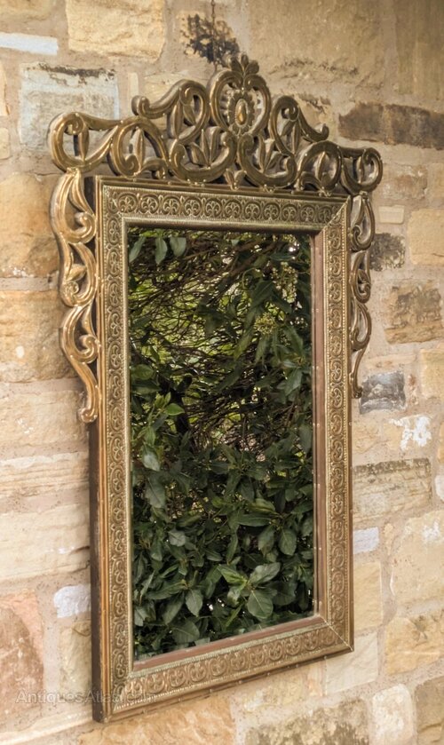 This is a very attractive Regency revival wall mirror with a most appealing design dating from the late 19th century circa 1899.The polished brass frame has a lovely soft golden glow with a very nice antique appearance and the bold design to the ornate crest gives this a great look. The mirror plate itself is in good quality bevelled glass and is in immaculate condition.
