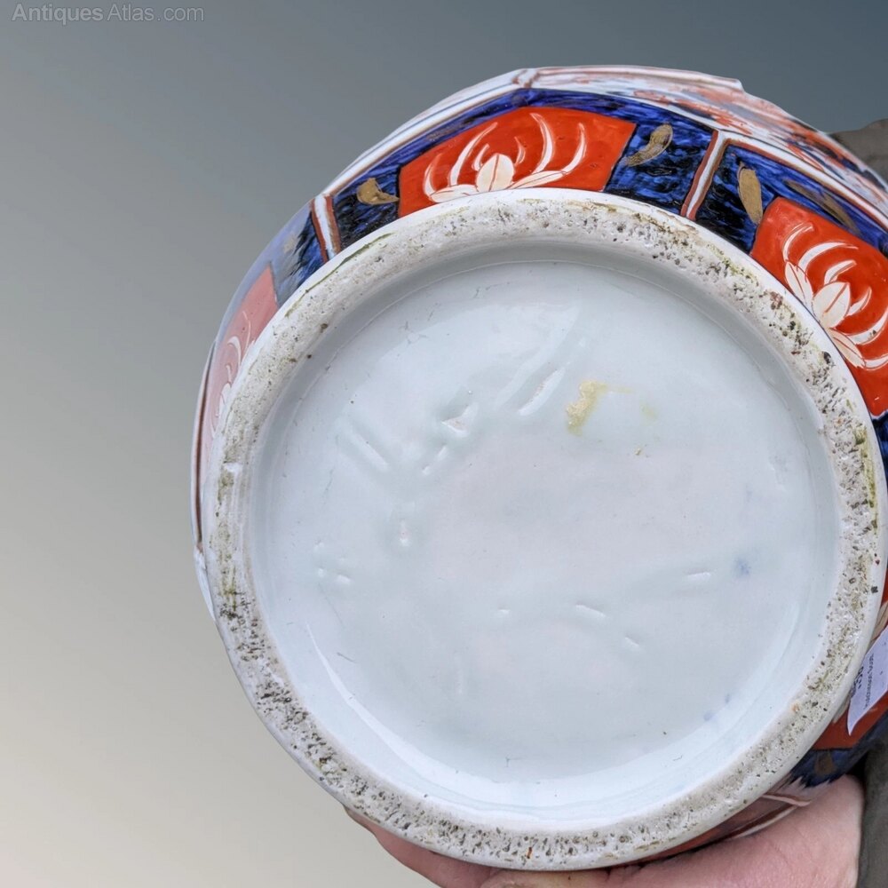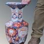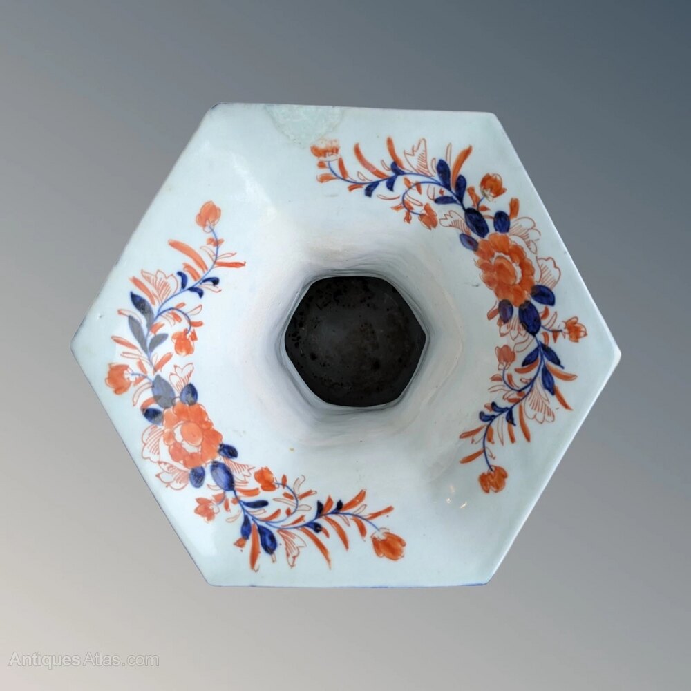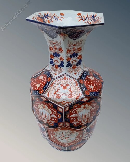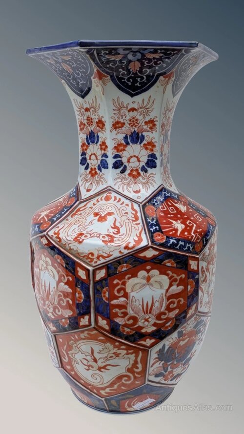 This is a really imposing and substantial Japanese Imari vase in super condition dating from around 1860.The vase is very well designed with a good panelled shape to the body and hexagonal tapering neck that gives this a great look. Each hexagonal section has typical Imari floral designs hand painted in red ironstone and deep cobalt blue with floral sprays to the neck and inside around the rim.