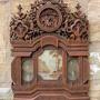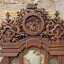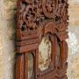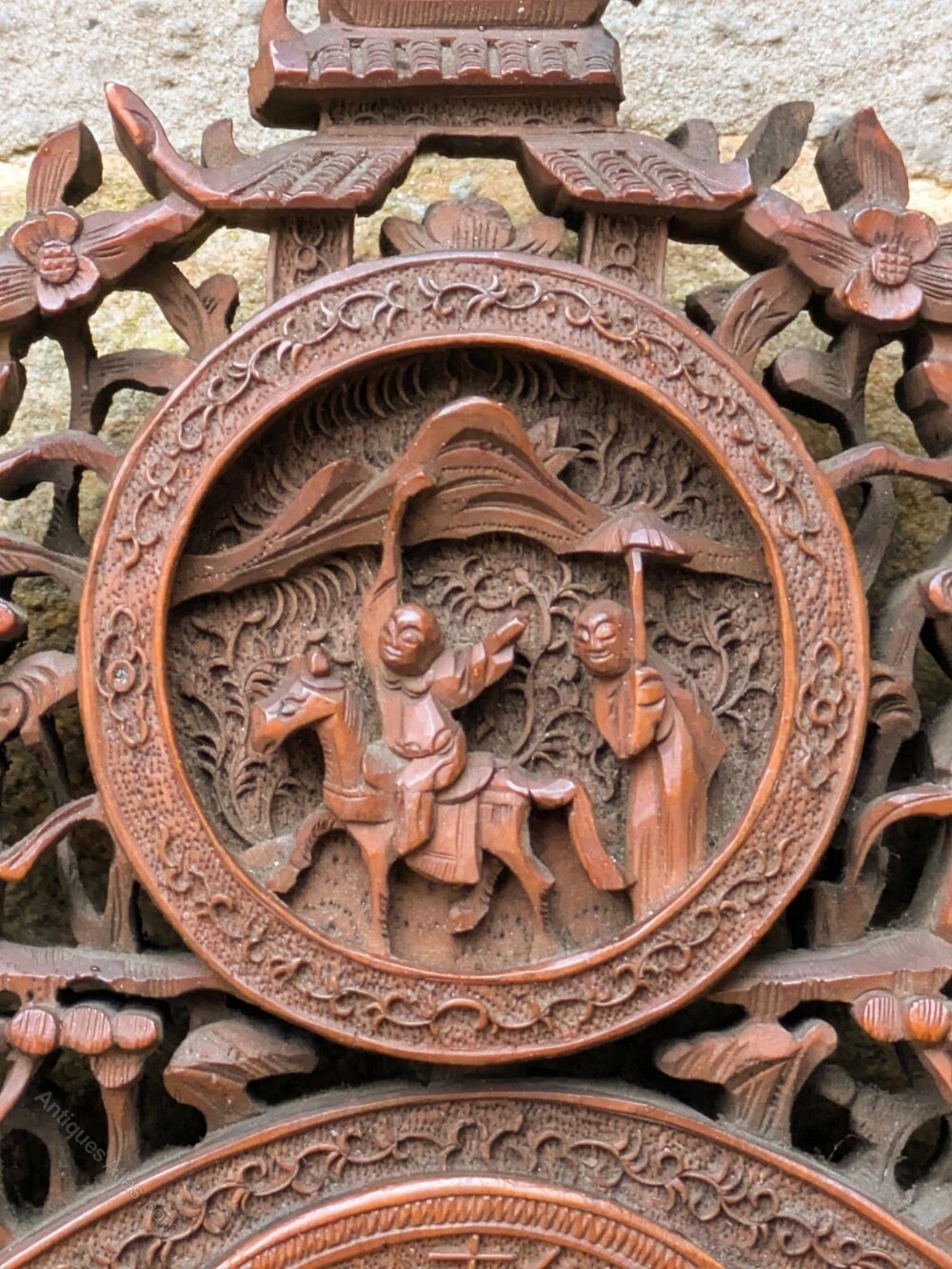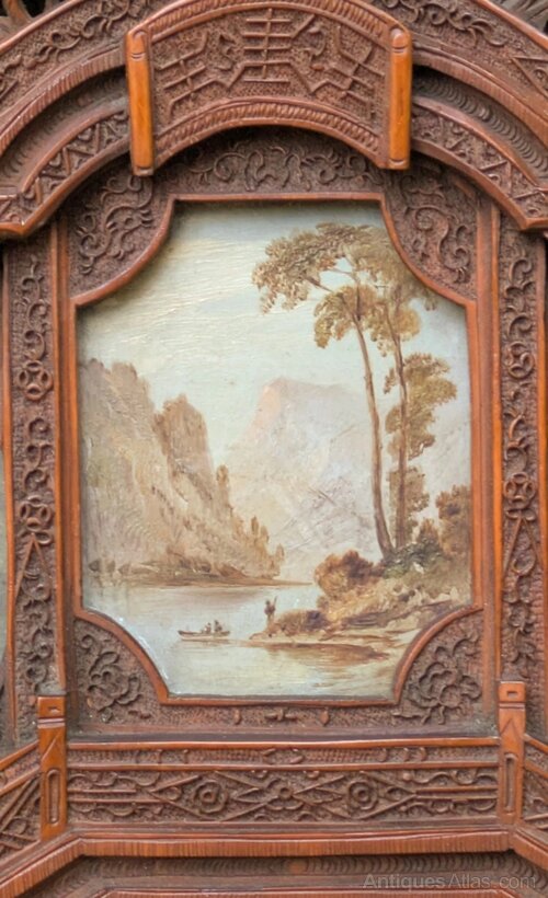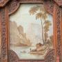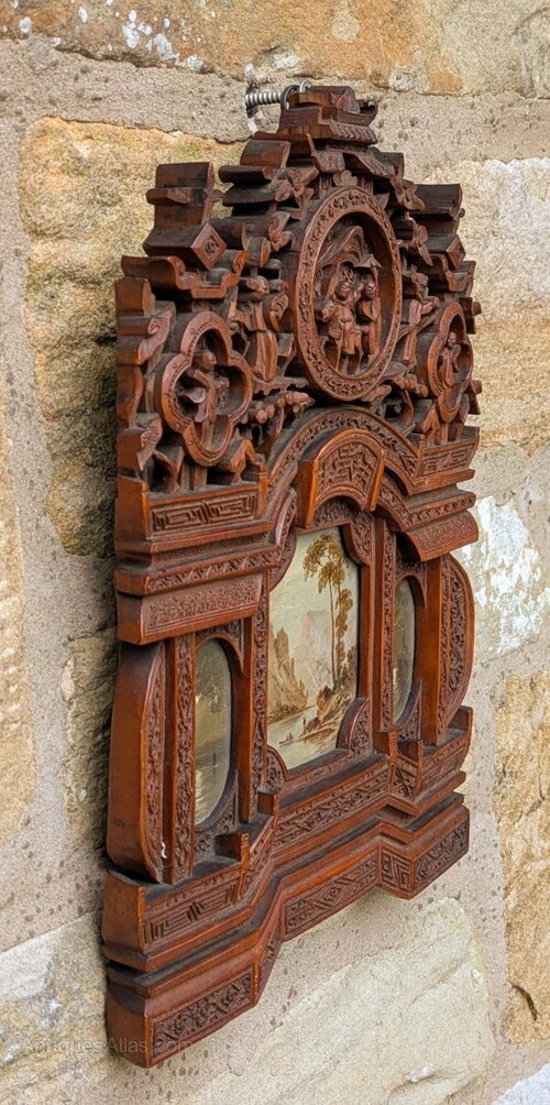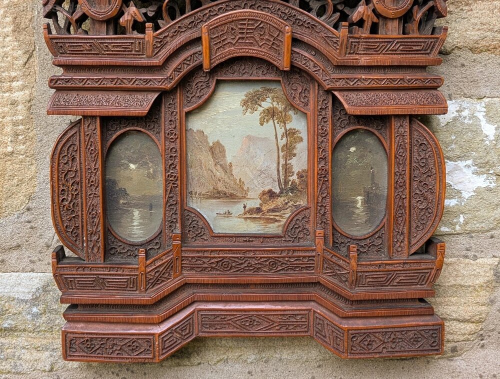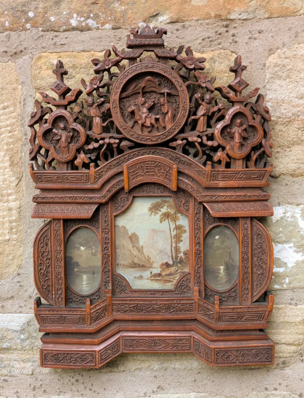 This is a very ornate Chinese carved sandalwood picture frame dating from the mid 19th Century. The frame is finely carved in architectural style with figures, trees and pagodas. It has three apertures each fitted with oil landscape panels depicting beautiful waterside scenes.The piece measures 20cms by 27cms.