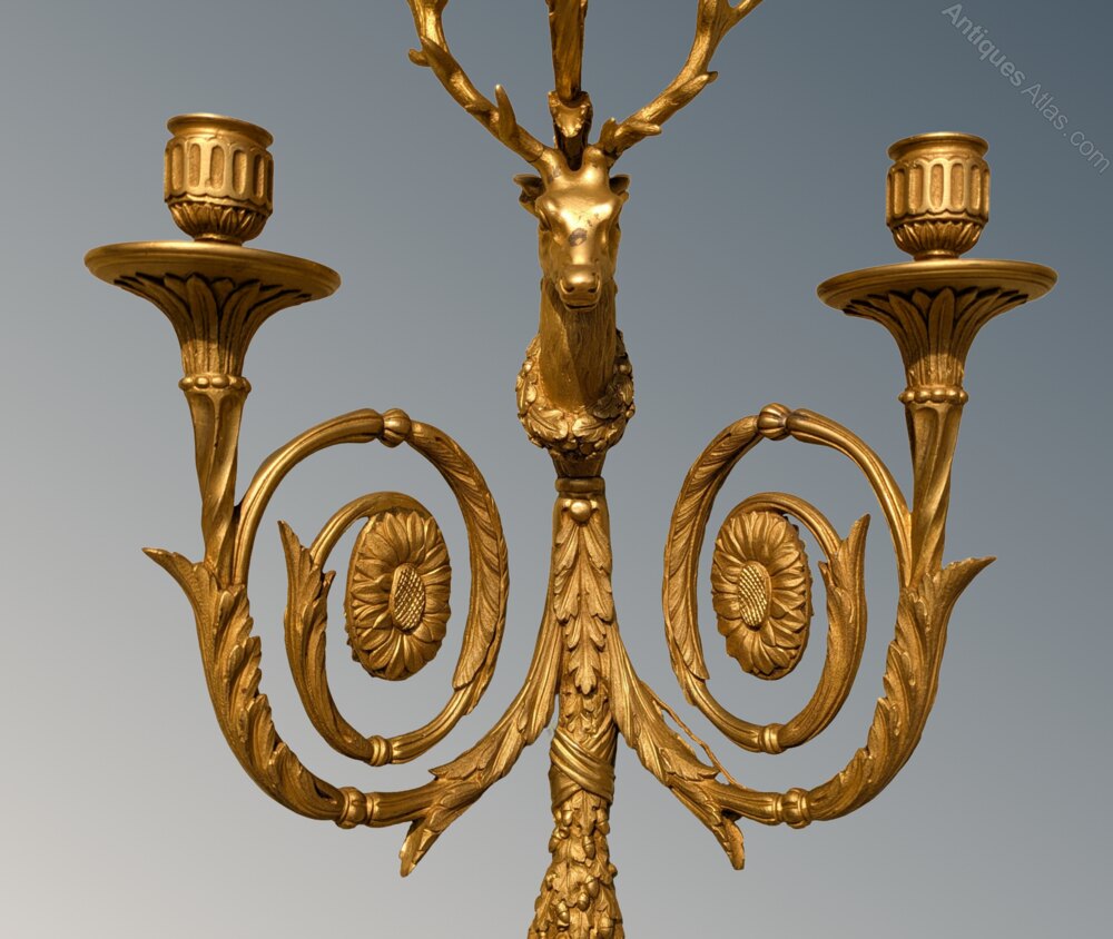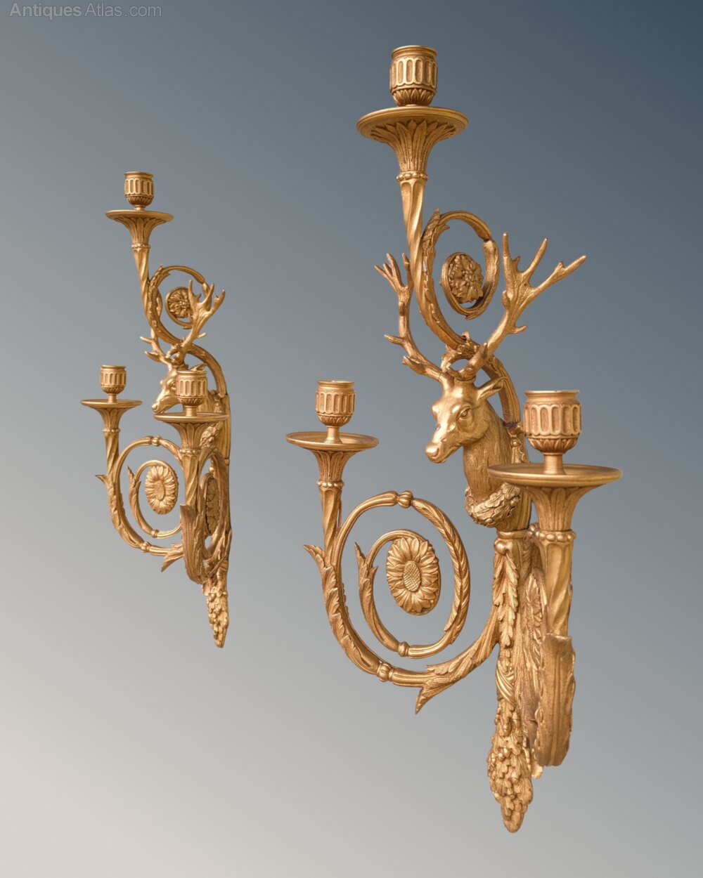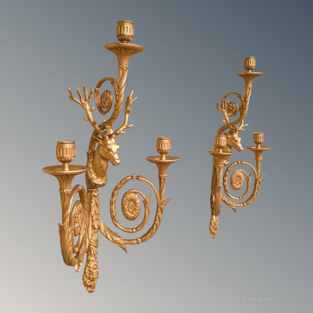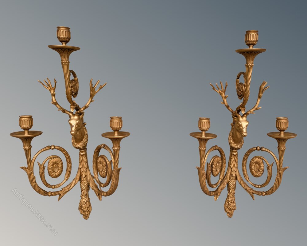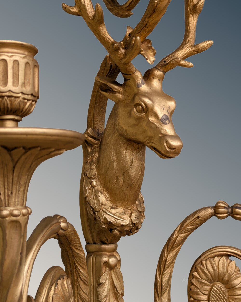 This is a superb quality pair of French gilt bronze wall sconces in the Louis XVI style dating from around 1870. The sconces are a fabulous design having central stags heads with branching antlers. There are three anthemion sconce on acanthus leaf scrolling branches with beautiful sunflower roundels. The bases have further oak and acorn detailing which is echoed in the collar to the stags neck.A very fine pair indeed.