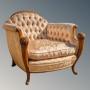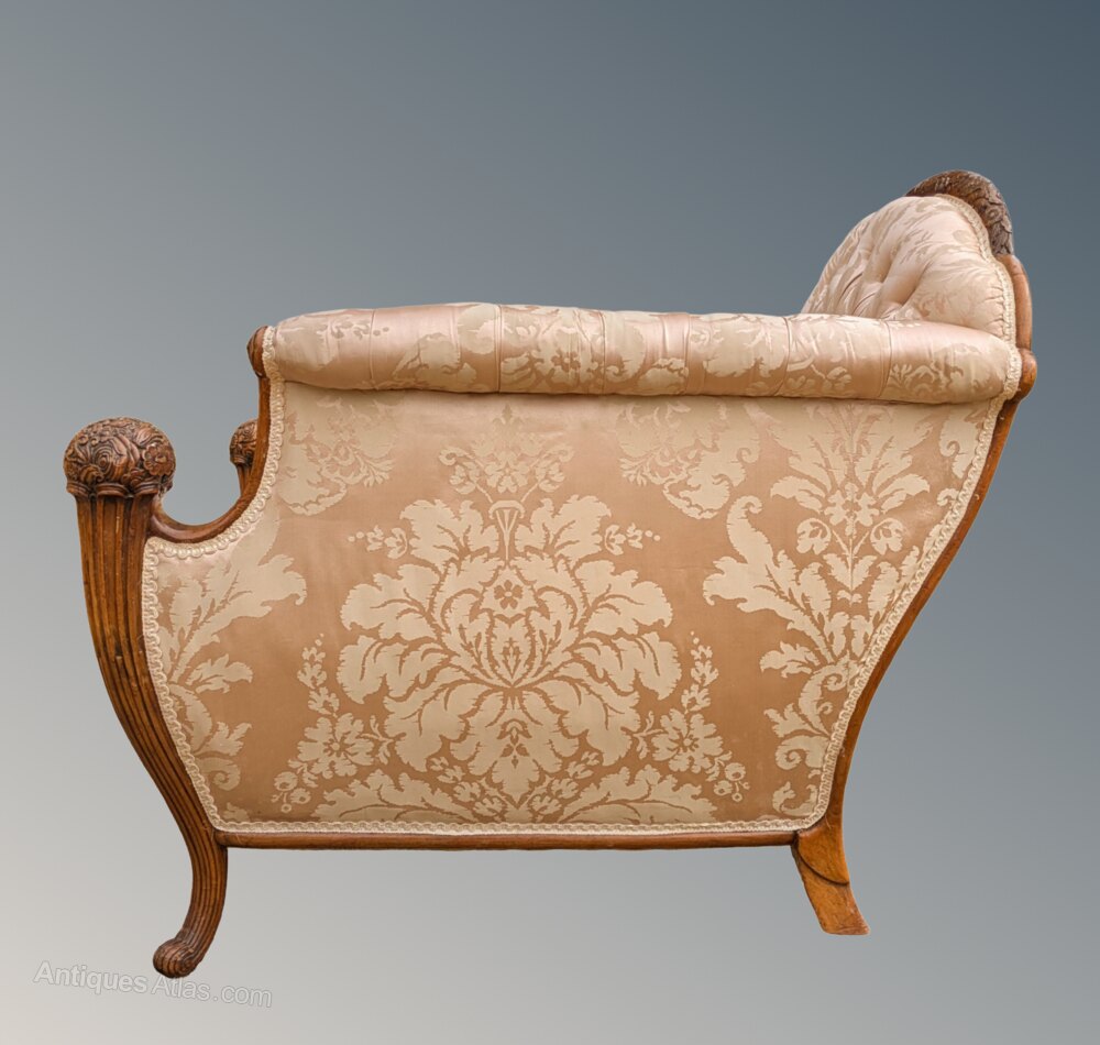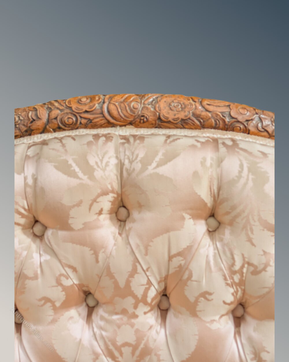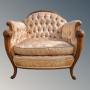 It is upholstered in a shell pink silk brocade and has deep buttoning to the back and a separate thick squab cushion, feather filled, making a most comfortable seat. The upholstery is to a standard difficult to find these days and wonderfully has had little use as it is in excellent condition throughout, with no wear or fading at all.