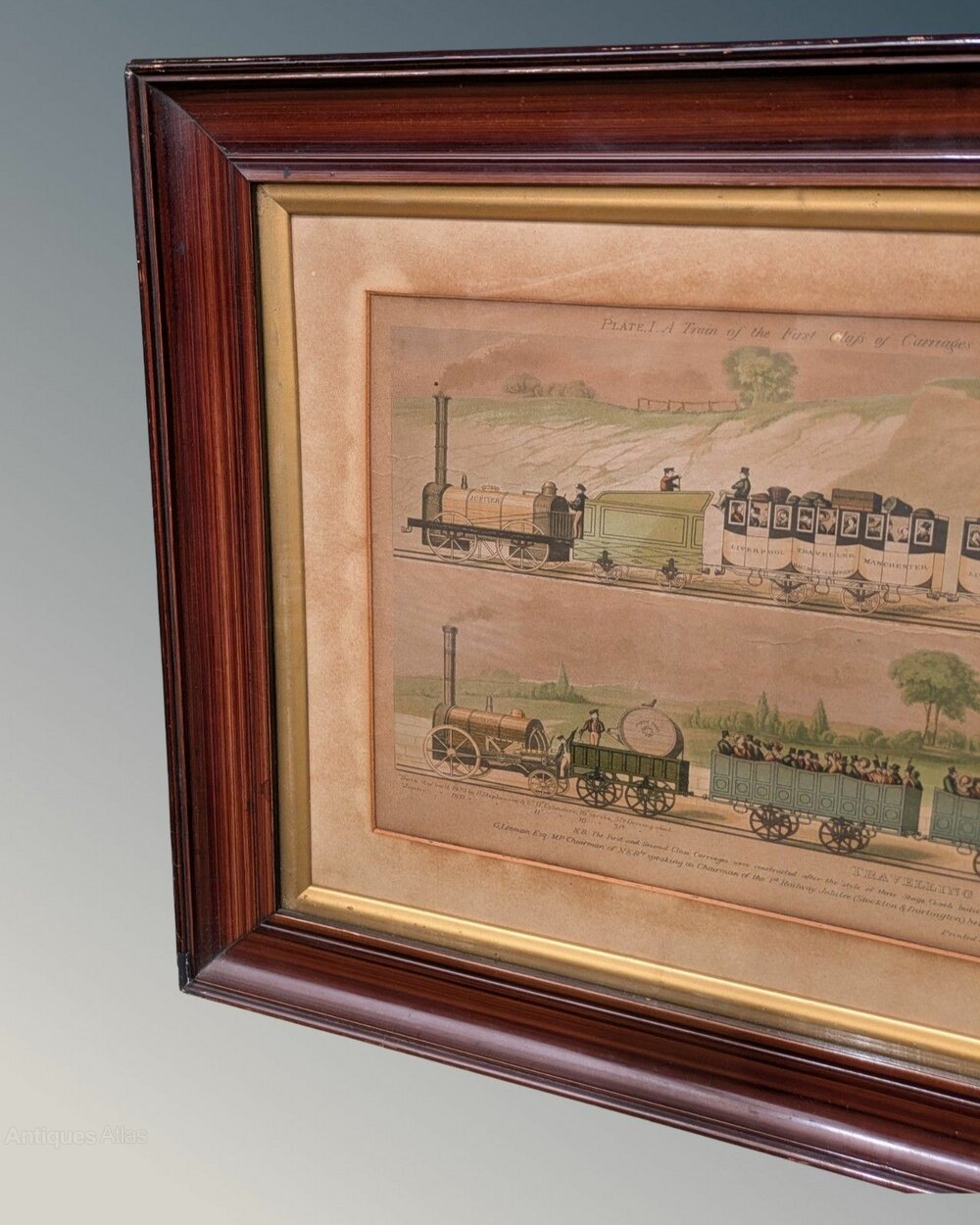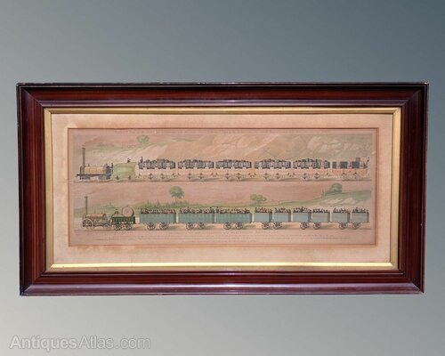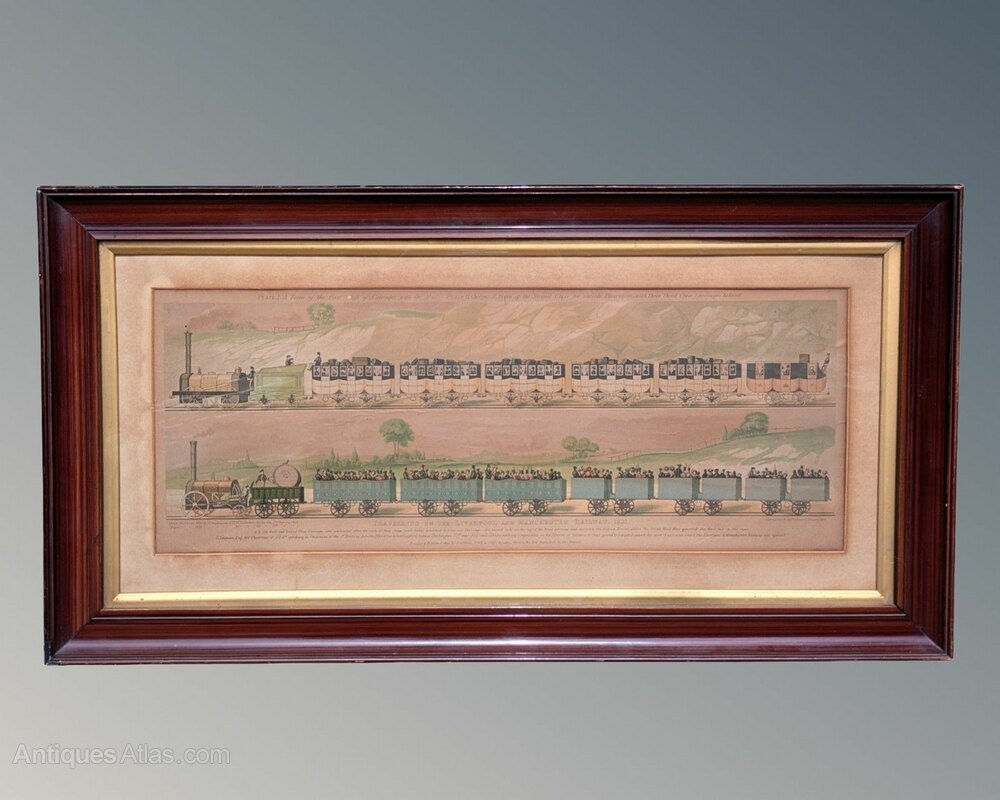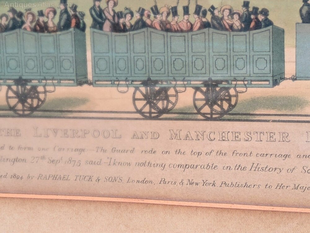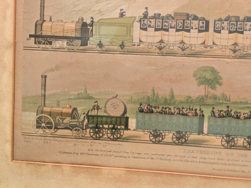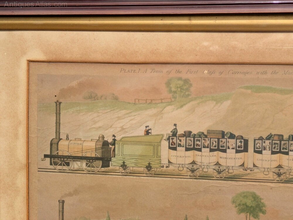 This is a rare 19th-century hand-coloured engraving of “The North Star” and “The Jupiter,” two of the first steam locomotives manufactured by R. Stephenson and Co in 1830 and 1831. The engraving was printed and published by Raphael Tuck & Sons in 1894 and depicts the Jupiter with a train of first-class carriages and the Royal Mail guarded carriage at the rear. Beneath is the North Star for second and third-class passengers traveling in uncovered carriages. The engraving is still in its original frame, which measures 85 cm by 45 cm. UK insured packing and delivery is £15.DateEarly 19th Century