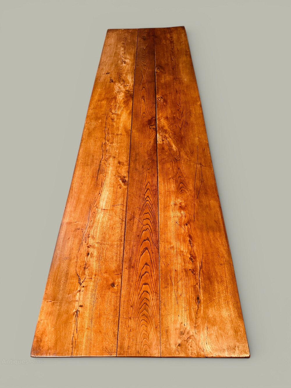 A long French farmhouse table with 3 plank elm top seating 10 in comfort. Late 19th century. Wonderful grain and patina.Marks and stains to top commensurate with age
